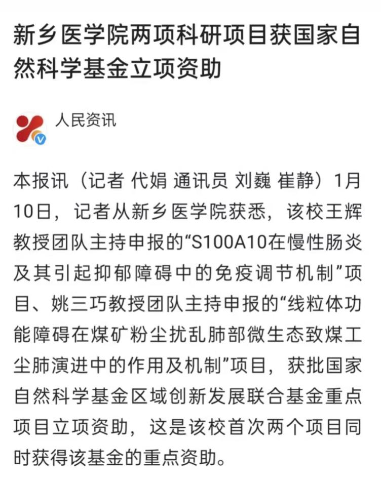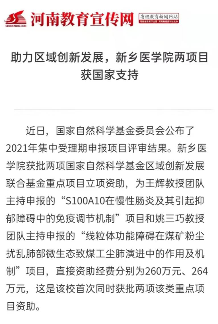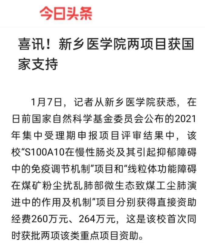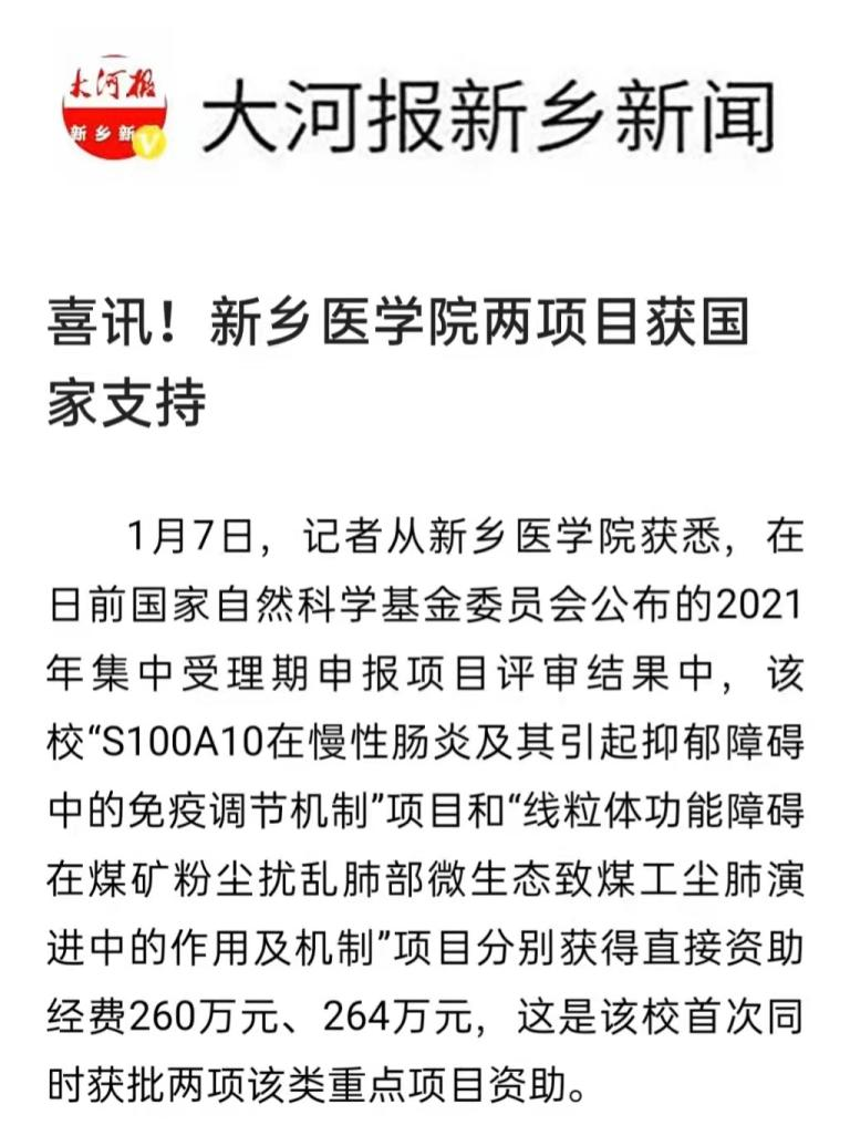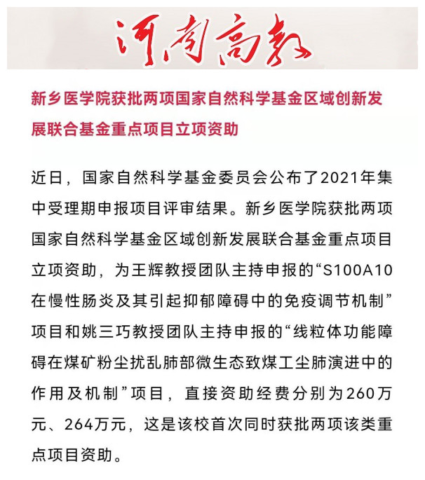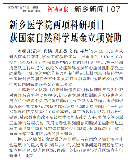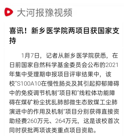 日前,国家自然科学基金委员会公布了2021年集中受理期申报项目评审结果,我校王辉团队主持申报的“S100A10在慢性肠炎及其引起抑郁障碍中的免疫调节机制”项目,以及姚三巧团队主持申报的“线粒体功能障碍在煤矿粉尘扰乱肺部微生态致煤工尘肺演进中的作用及机制”项目获批,直接资助经费分别为260万元、264万元。人民日报客户端等多家媒体报道。(供稿:刘天庆 周子媛)