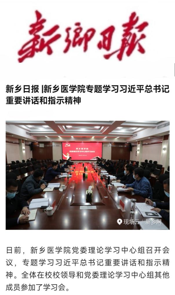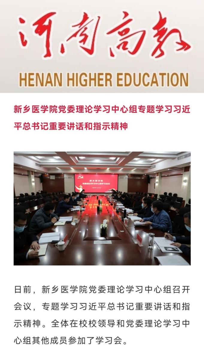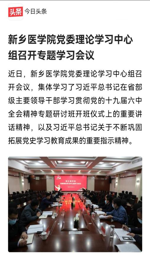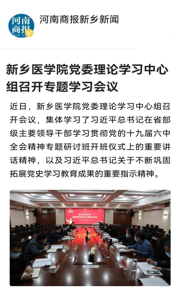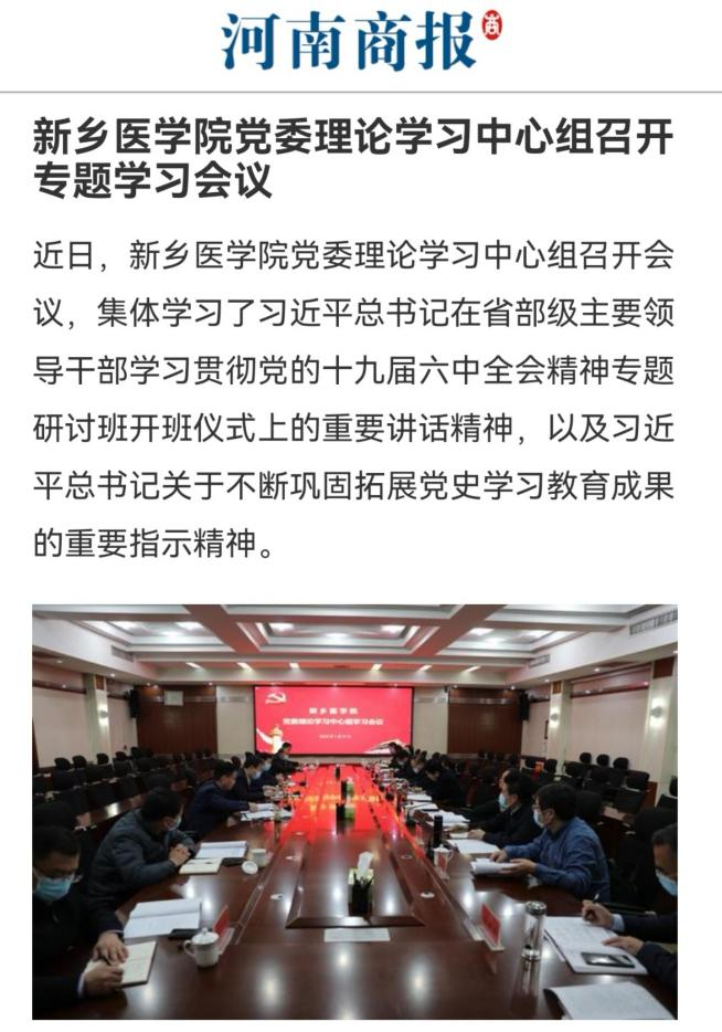 日前,我校党委理论学习中心组召开会议,集体学习了习近平总书记在省部级主要领导干部学习贯彻党的十九届六中全会精神专题研讨班开班仪式上的重要讲话精神,以及习近平总书记关于不断巩固拓展党史学习教育成果的重要指示精神,激励全校干部群众要主动作为、干在实处,全力以赴做好学校大事要事,振奋精神、凝心聚力,奋力开创学校事业发展新局面,以优异的成绩向党的二十大献礼。(供稿:刘天庆李春晓)