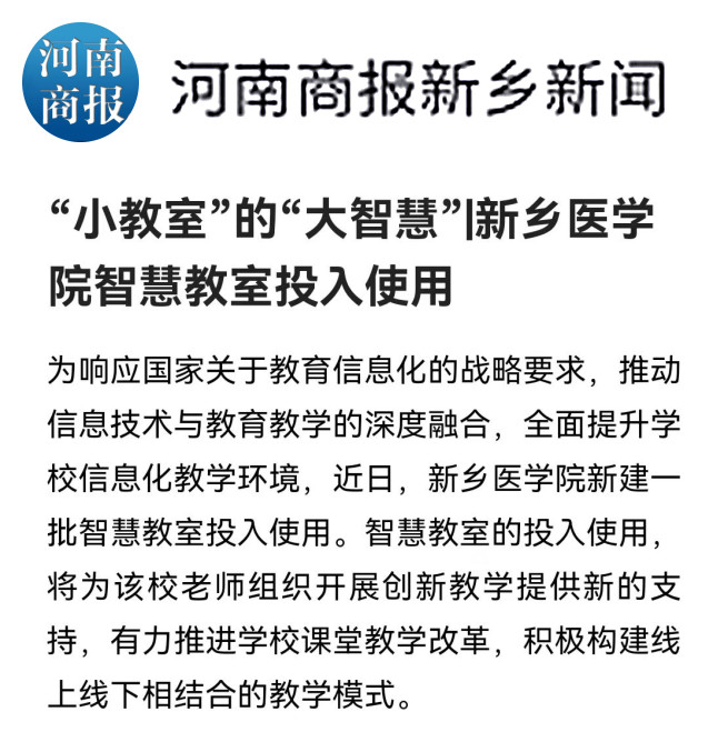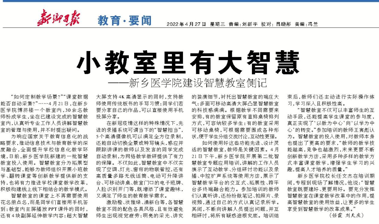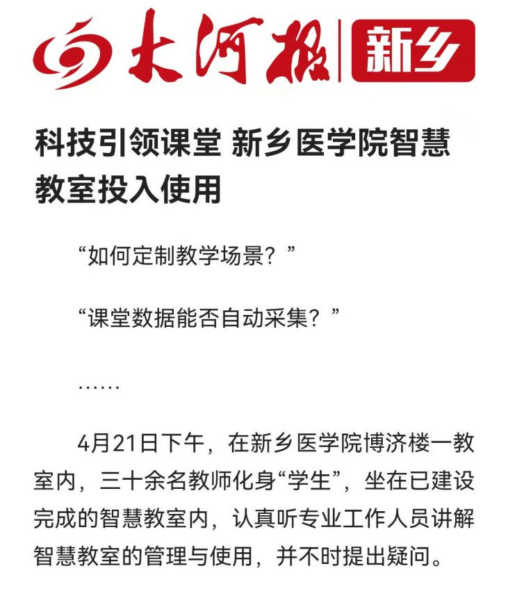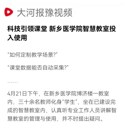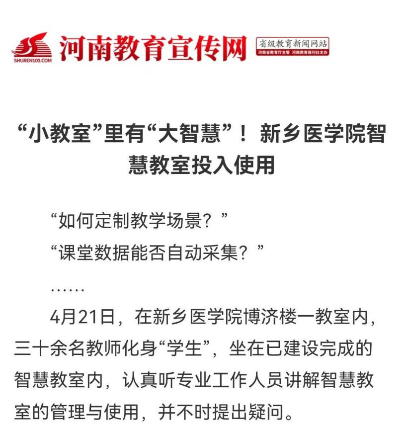 为响应国家关于教育信息化的战略要求,推动信息技术与教育教学的深度融合,全面提升学校信息化教学环境,日前,我校新建的一批智慧教室投入使用。智慧教室“智慧”“美貌”兼具,不仅提高提高学生课堂参与度,还能实现“以教为中心”向“以学为中心”的转变。多家媒体进行报道。(供稿:刘天庆)