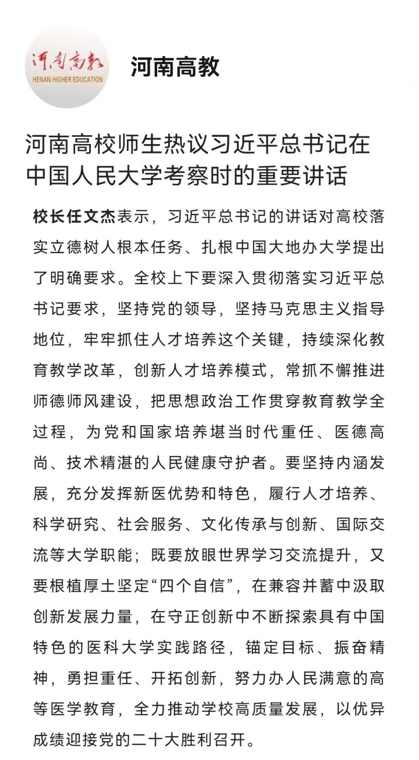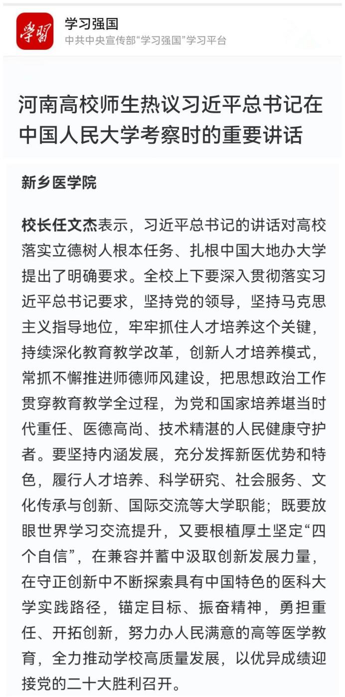 4月25日上午,习近平总书记到中国人民大学考察调研,寄语全国广大青年牢记党的教诲,立志民族复兴,不负韶华,不负时代,不负人民,在青春的赛道上奋力奔跑,争取跑出当代青年的最好成绩!我校师生通过电视、电脑、手机等方式积极收看相关新闻报道,习近平总书记的重要讲话在我校引起热烈反响。学习强国等媒体对此报道。(供稿:刘天庆)