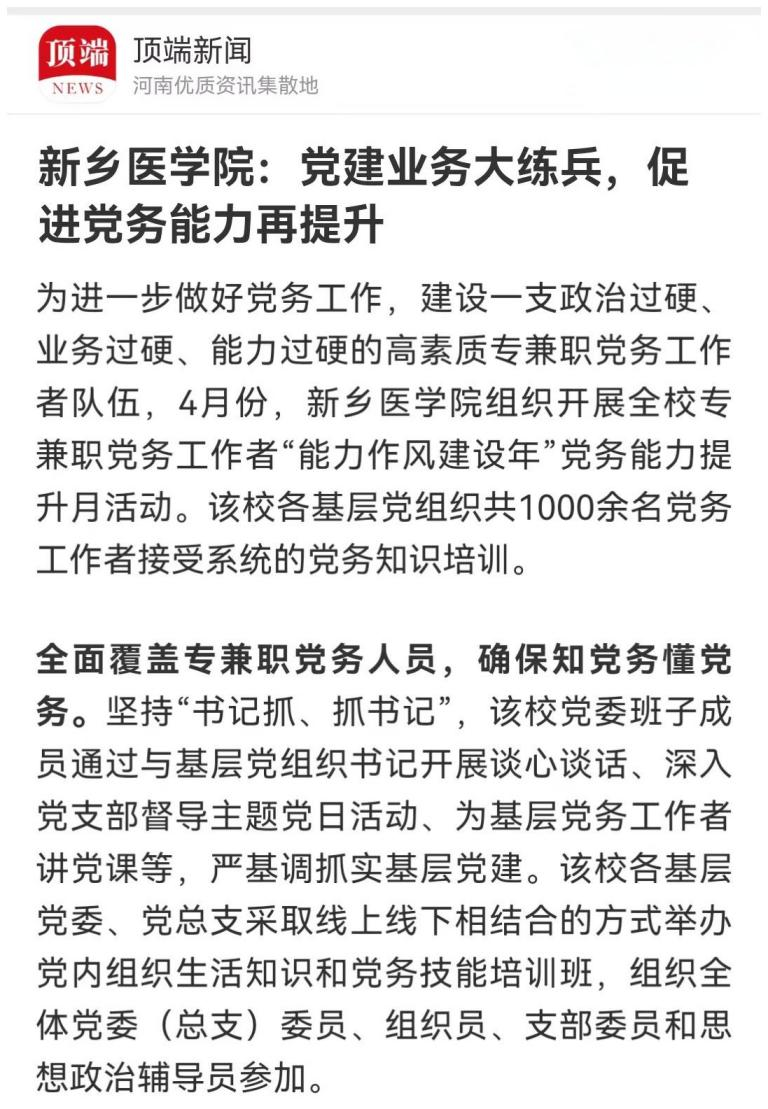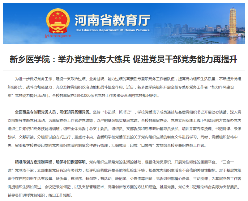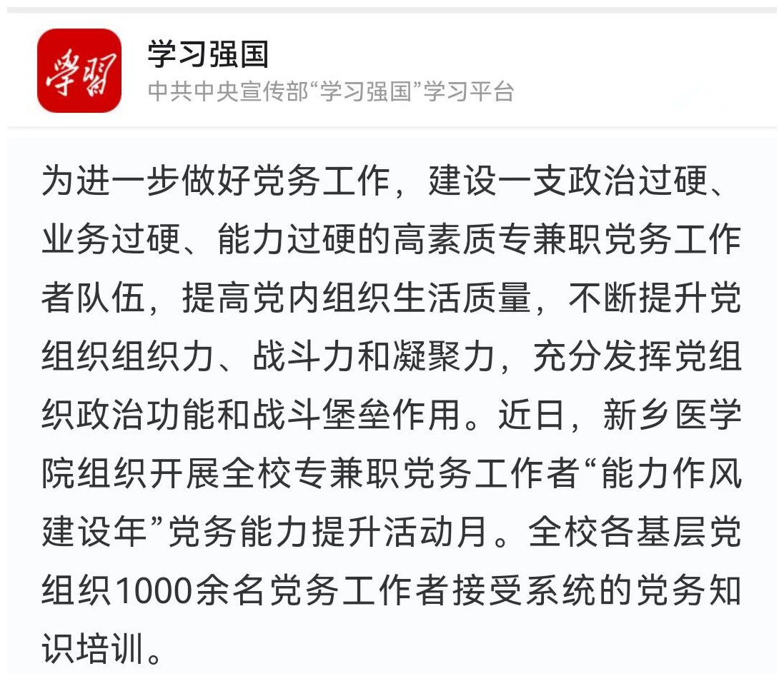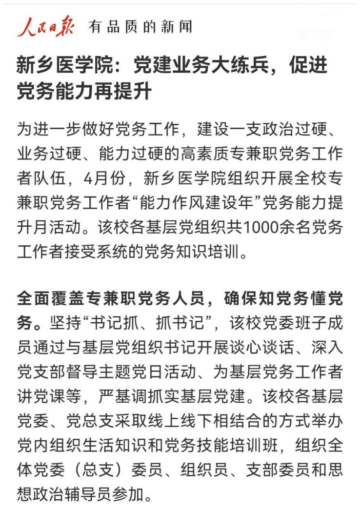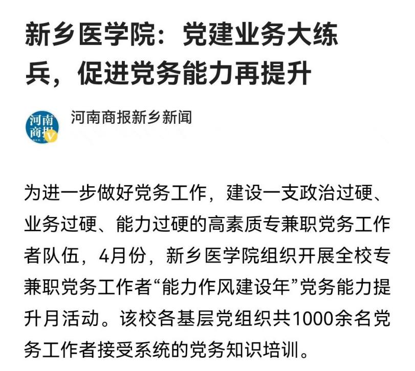 日前,我校组织开展全校专兼职党务工作者“能力作风建设年”党务能力提升活动月,全校各基层党组织1000余名党务工作者接受系统的党务知识培训。此次培训培训全面覆盖专兼职党务人员,确保知党务懂党务;精准策划方案定制课程,确保补短板强弱项;高效利用各类培训资源,确保有收获有提升。人民日报客户端、顶端新闻、河南商报新乡新闻、教育厅官网等媒体报道。(供稿:刘天庆)