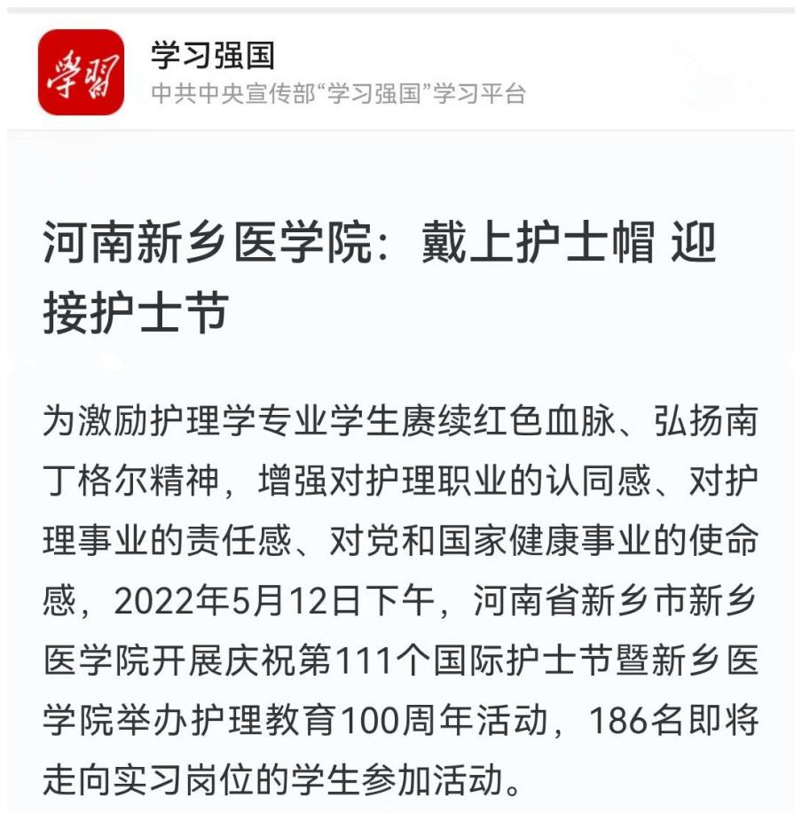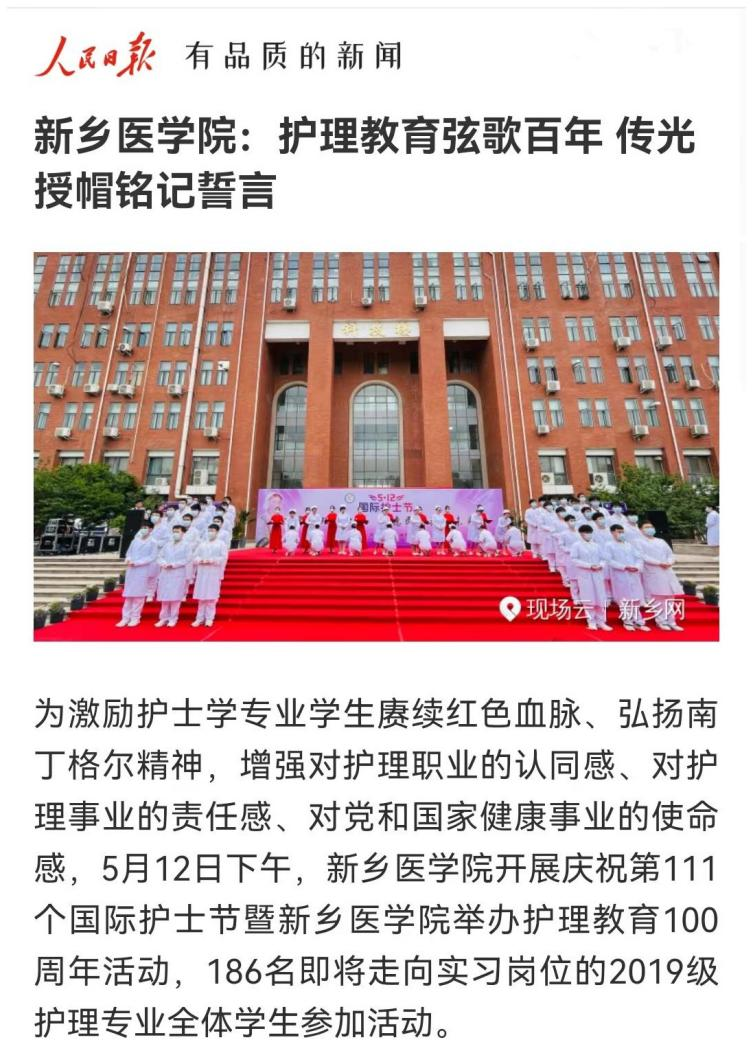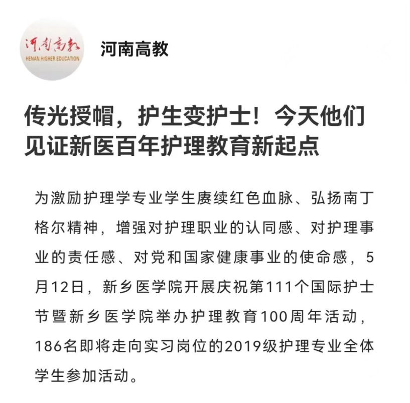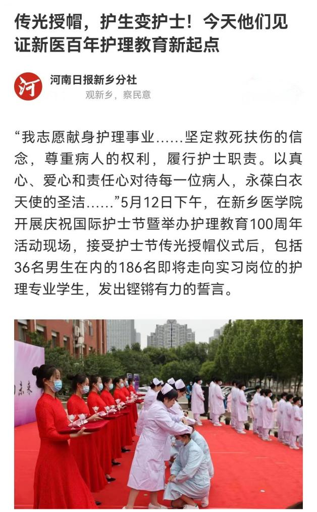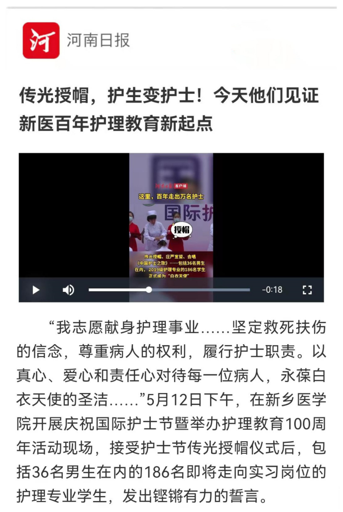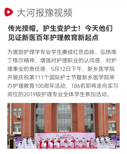 河南日报客户端报道我校护理教育弦歌百年 传光授帽铭记誓言