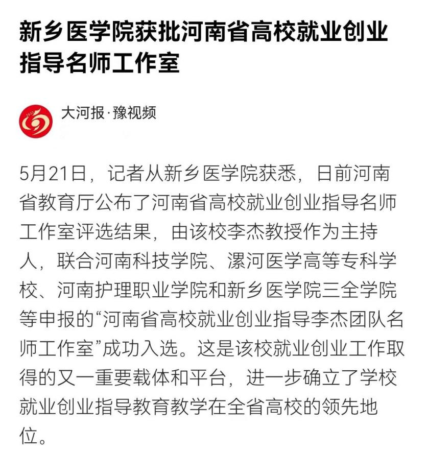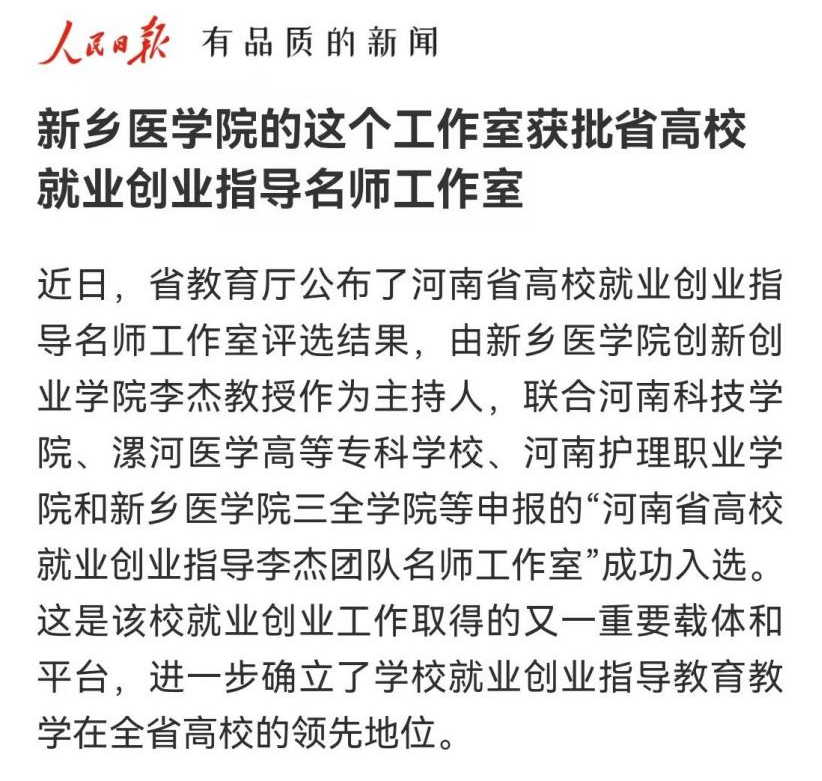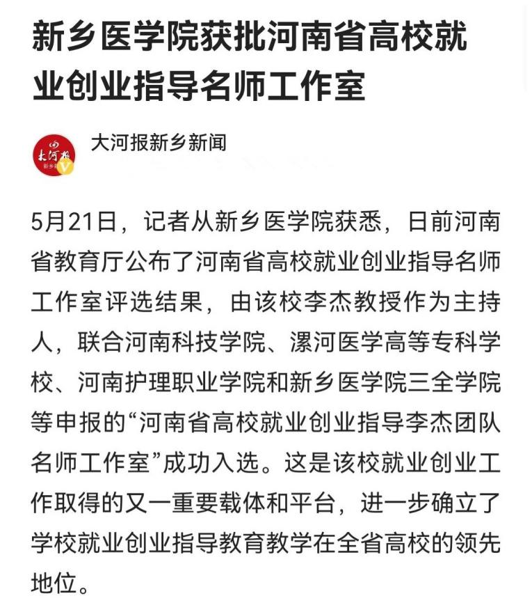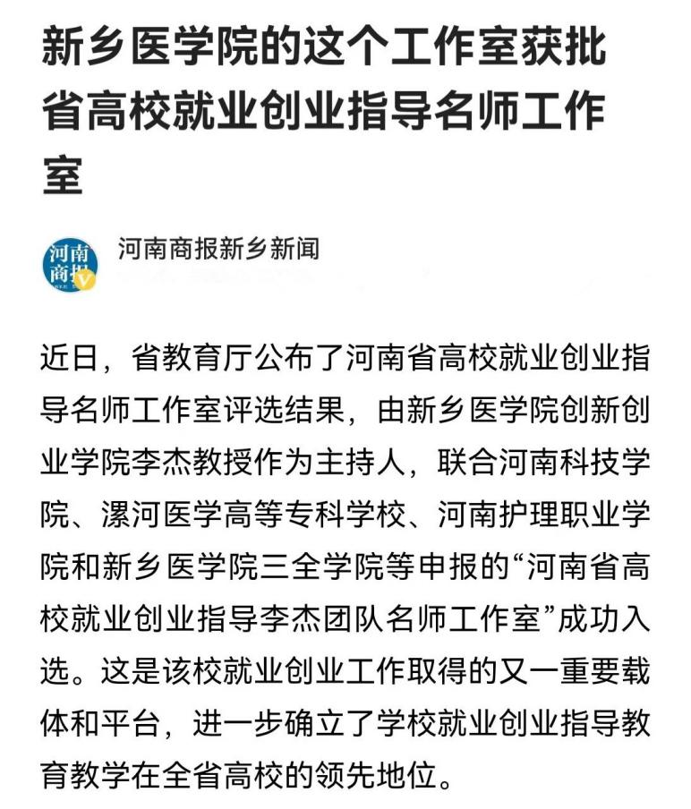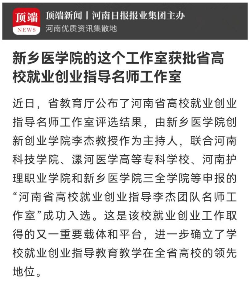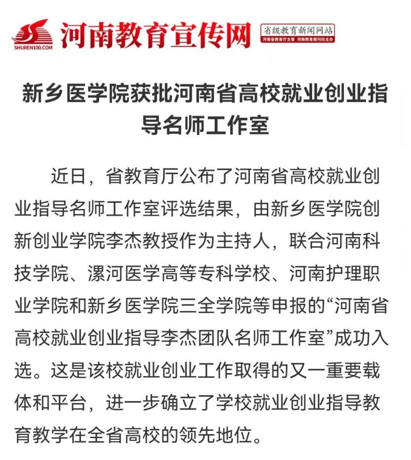 日前,省教育厅公布了河南省高校就业创业指导名师工作室评选结果,由我校创新创业学院李杰教授作为主持人,联合河南科技学院、漯河医学高等专科学校、河南护理职业学院和三全学院等申报的“河南省高校就业创业指导李杰团队名师工作室”成功入选。多家媒体报道。(供稿:刘天庆)