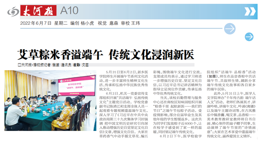 编五彩绳、包粽子、讲端午文化……在端午节前后,我校多部门相继开展多样端午节活动,传承弘扬中华优秀传统文化。《大河报》、豫视频等权威媒体,通过文图、视频的形式对此进行报道。