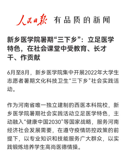 人民日报客户端报道我校暑期“三下乡”:立足医学特色,在社会课堂中受教育、长才干、作贡献