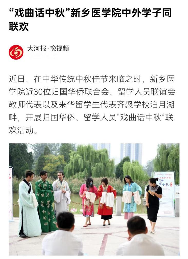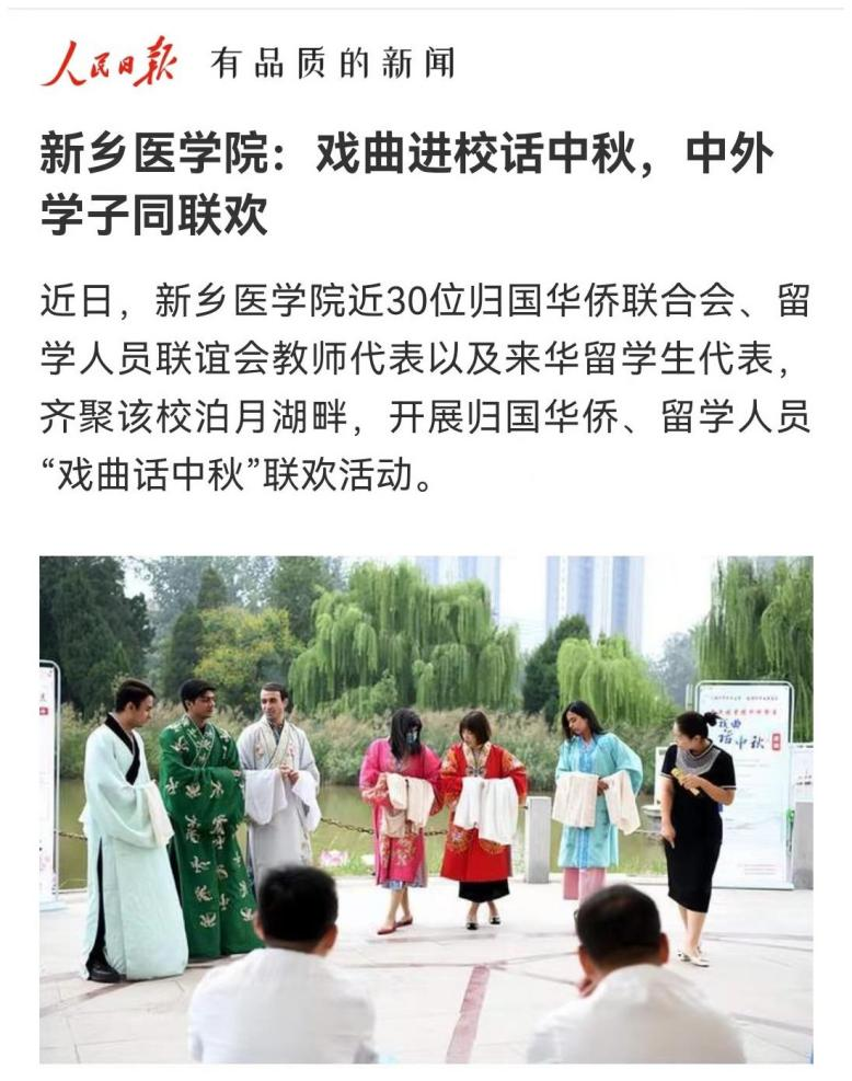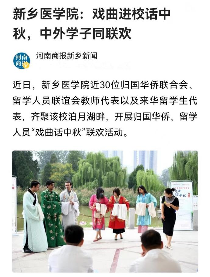 在中秋节到来之际,我校归国华侨联合会、留学人员联谊会教师代表以及来华留学生代表在南校区泊月湖畔开展“戏曲话中秋”联欢活动,弘扬中华优秀传统文化,促进中外文化交流。多家媒体报道。(供稿:刘天庆)