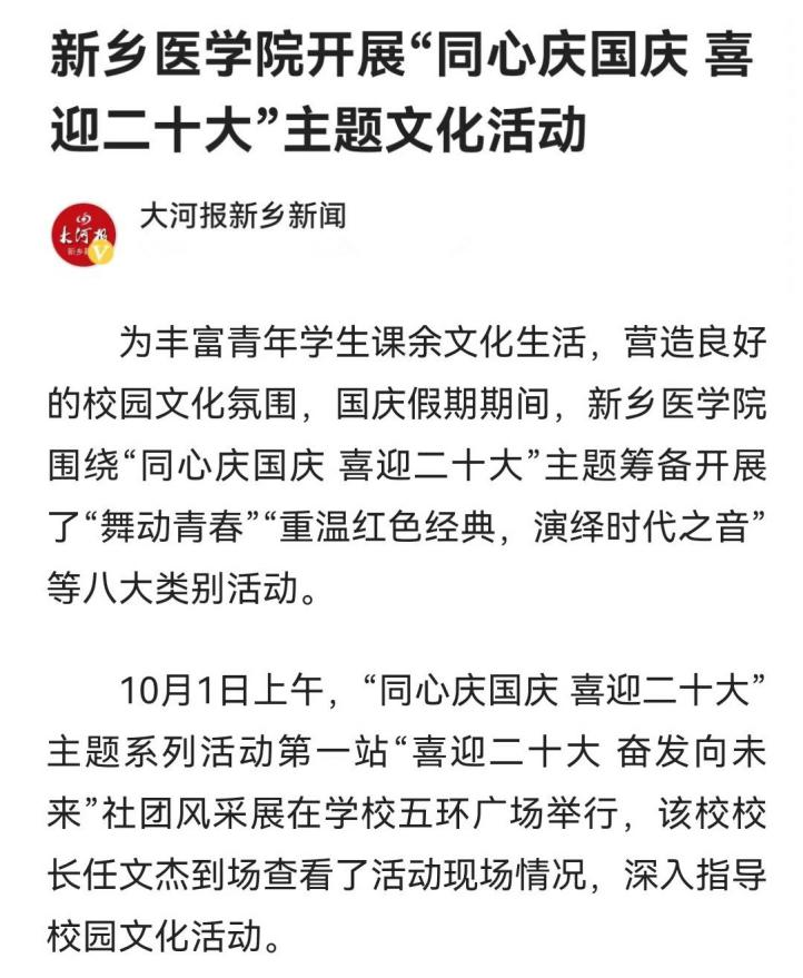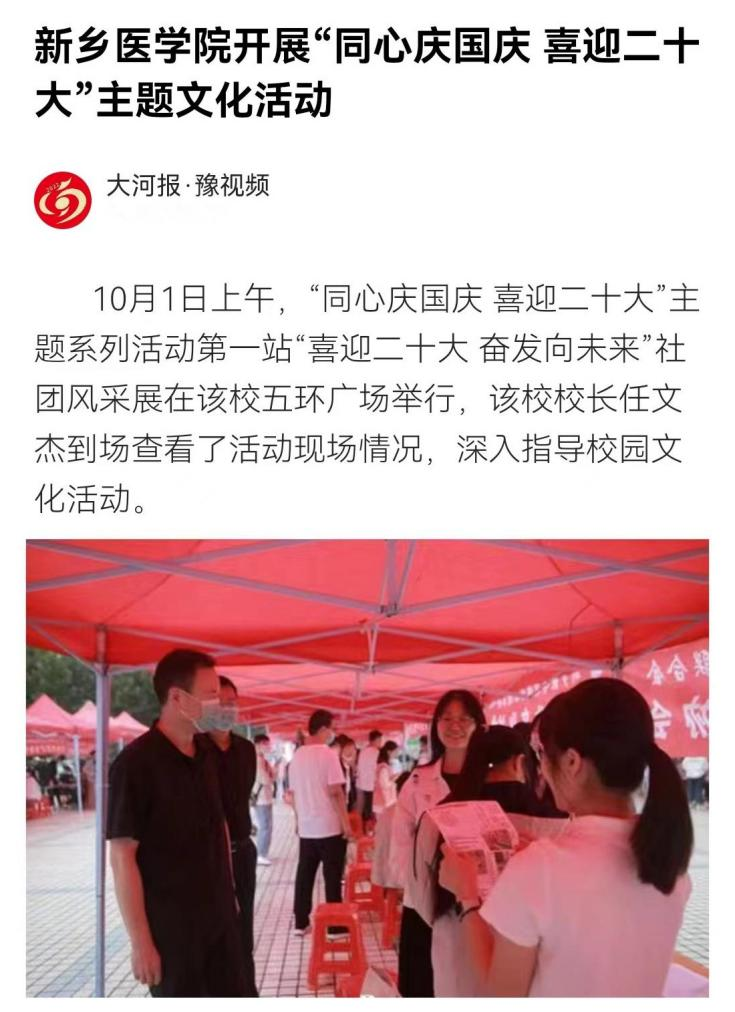 10月1日上午,“同心庆国庆 喜迎二十大”主题系列活动第一站“喜迎二十大 奋发向未来”社团风采展在学校五环广场举行,校长任文杰认真查看活动现场情况,深入指导校园文化活动。多家媒体报道。(供稿:刘天庆)