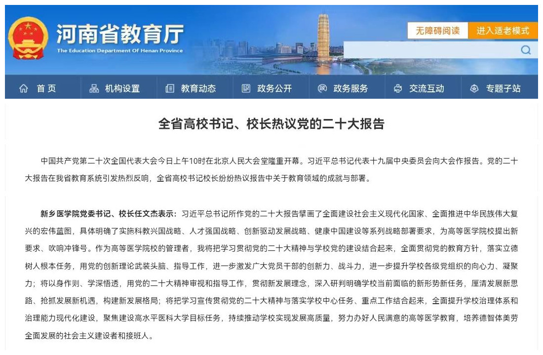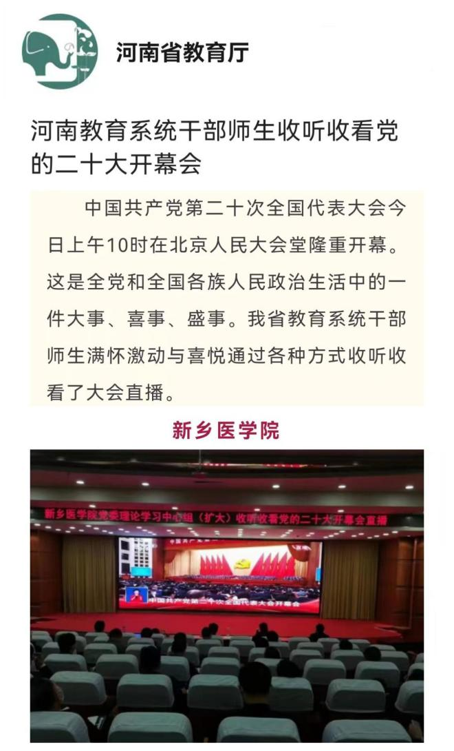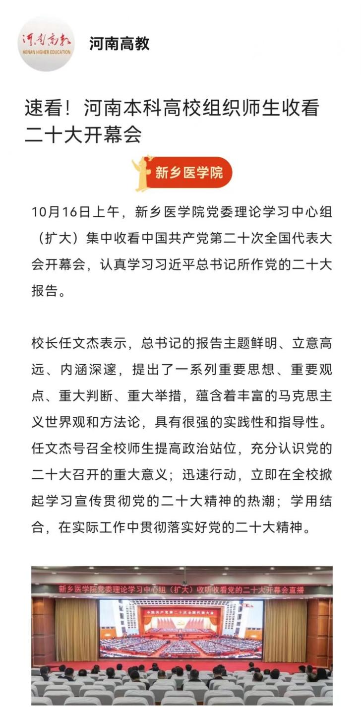 10月16日,中国共产党第二十次全国代表大会在北京人民大会堂隆重开幕。学校第一时间组织师生收听收看党的二十大开幕会盛况;连日来,学校广大师生认真学习党的二十大报告,结合自身实际畅谈学习体会。省教育厅官网、河南高教官微等媒体平台报道。(供稿:刘天庆)