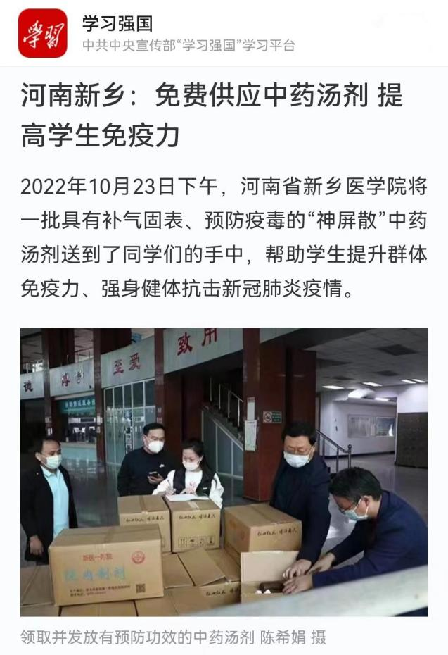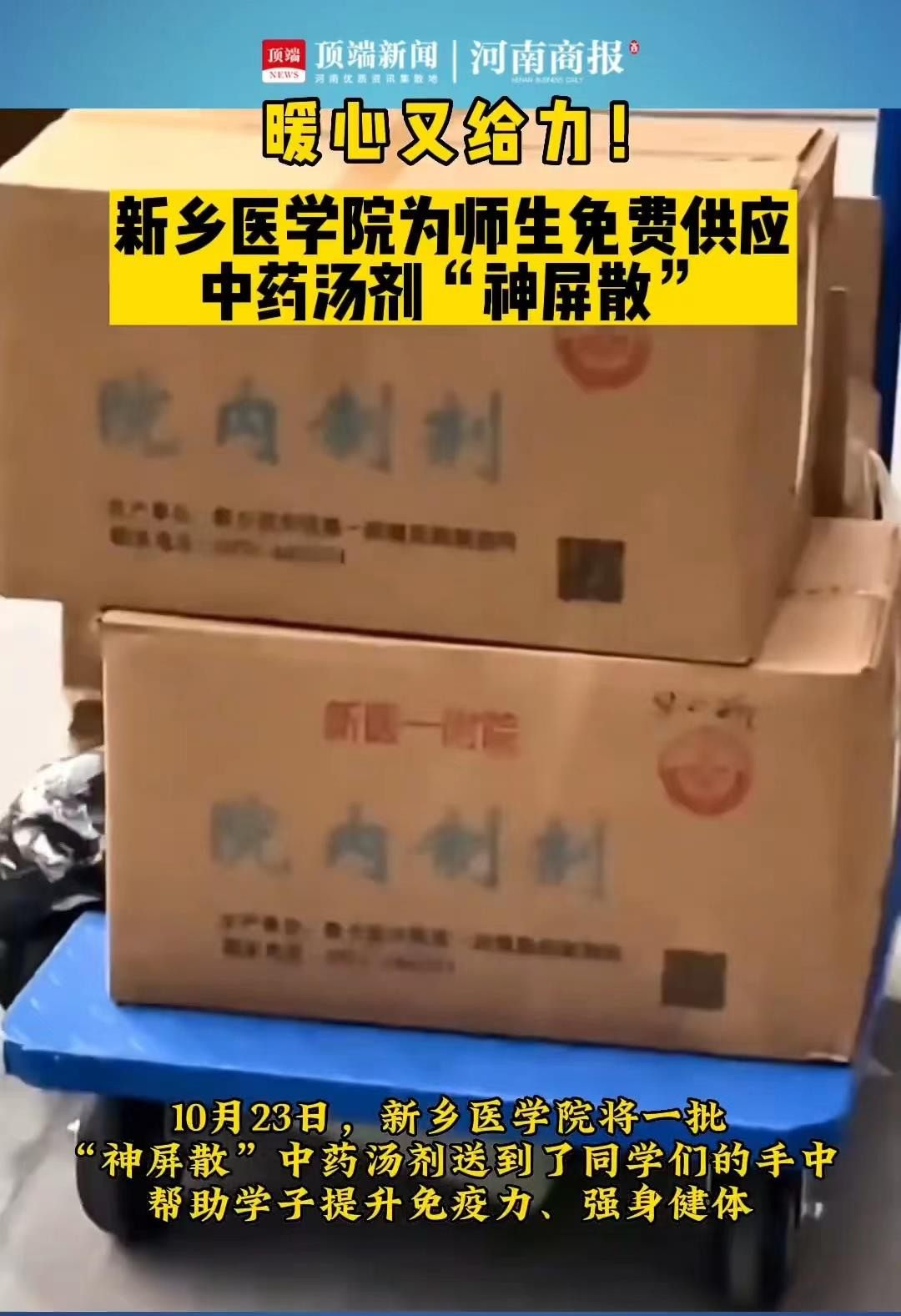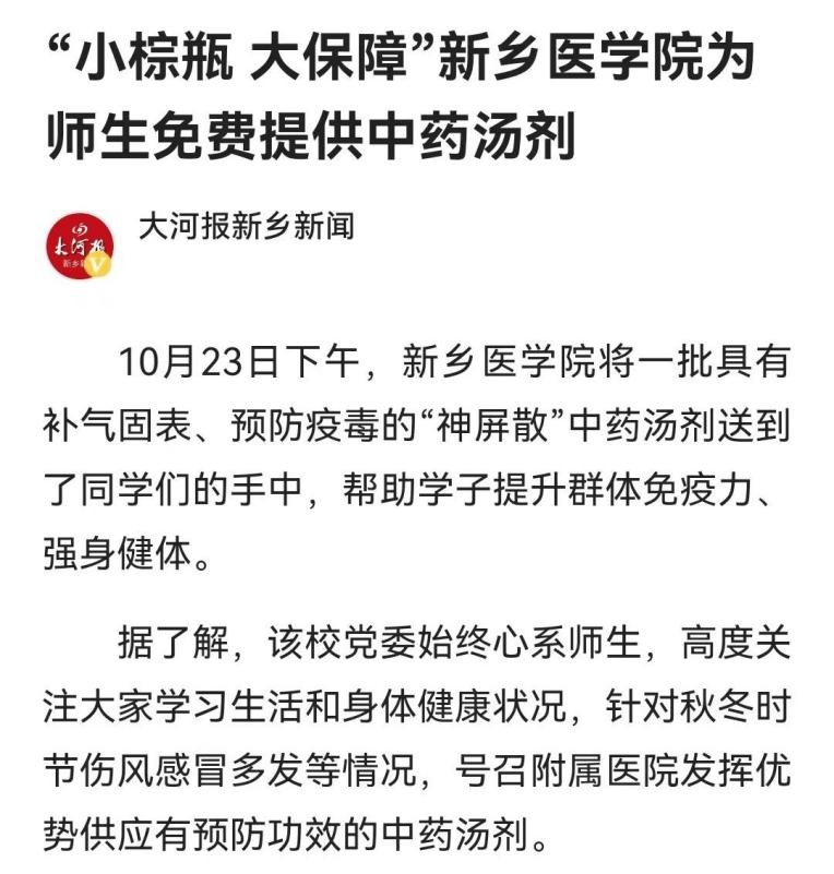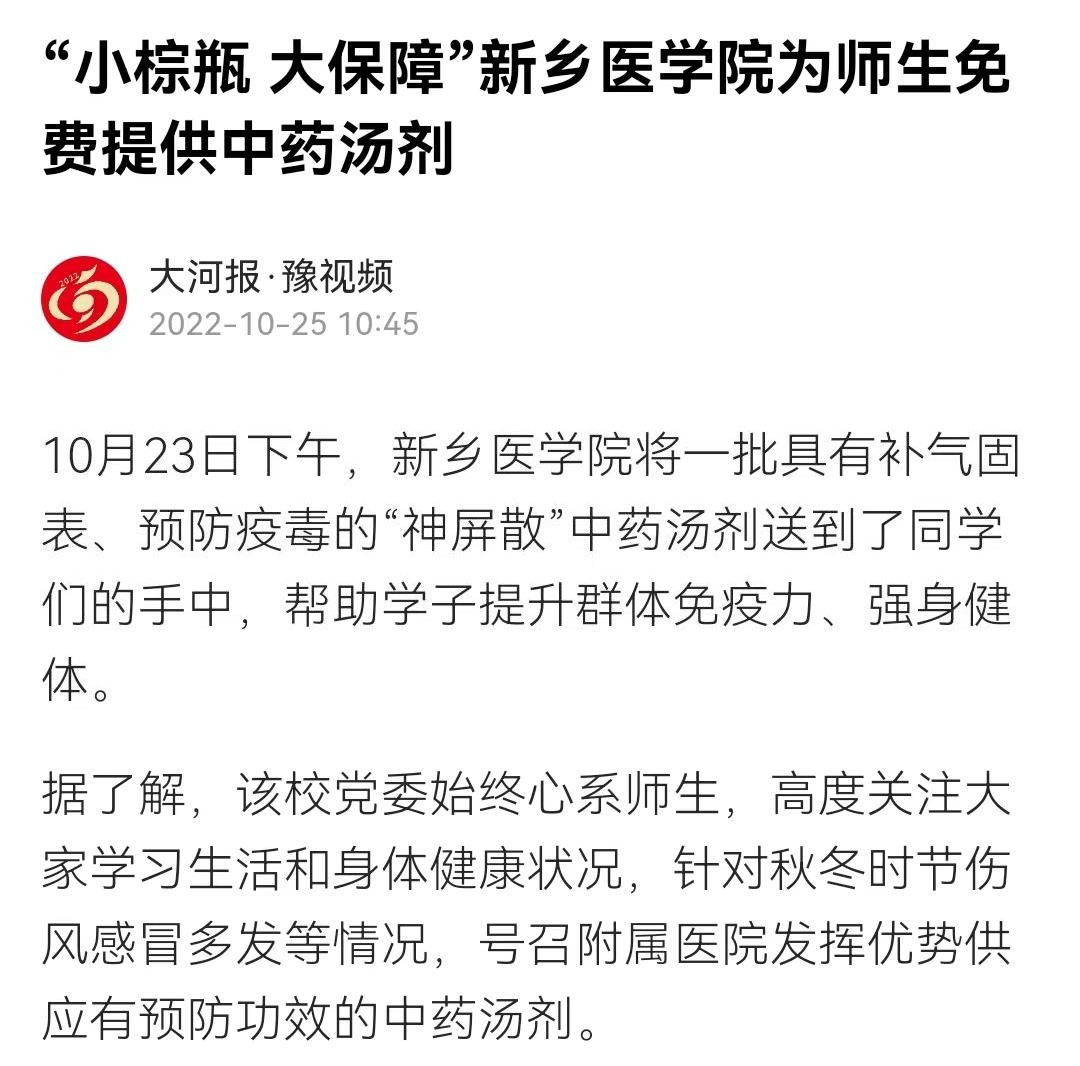 近日,针对新冠肺炎疫情及秋冬时节伤风感冒多发等情况,学校发挥医学高校优势,为学子提供“神屏散”中药汤剂,帮助学子提高免疫力。学习强国等多家媒体报道。(供稿:刘天庆)