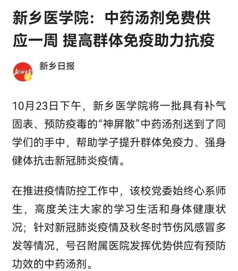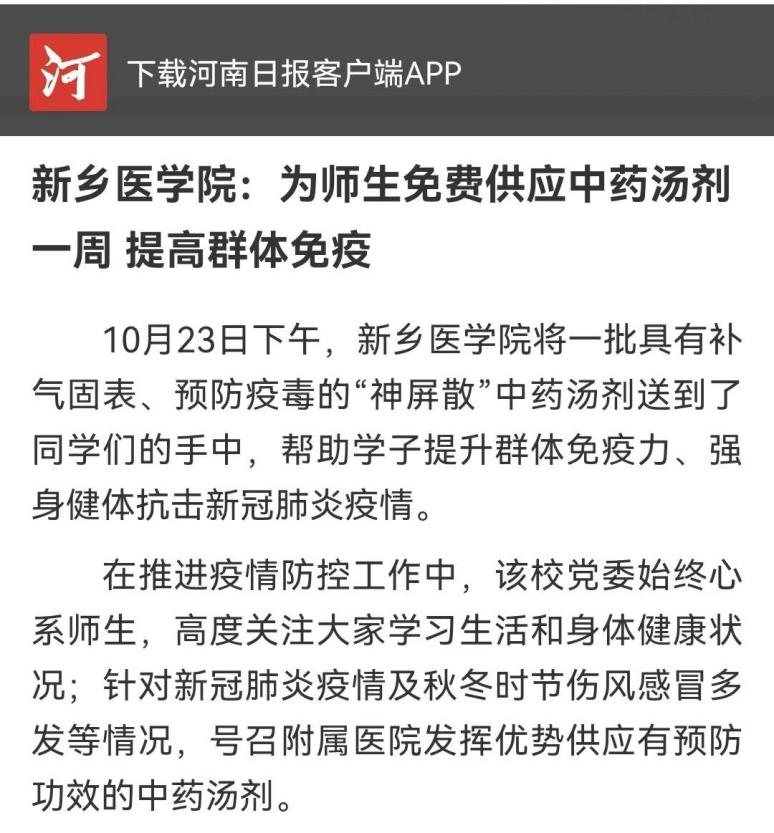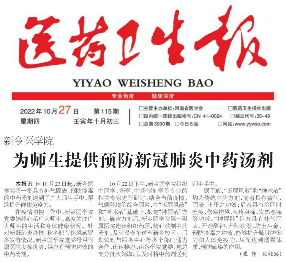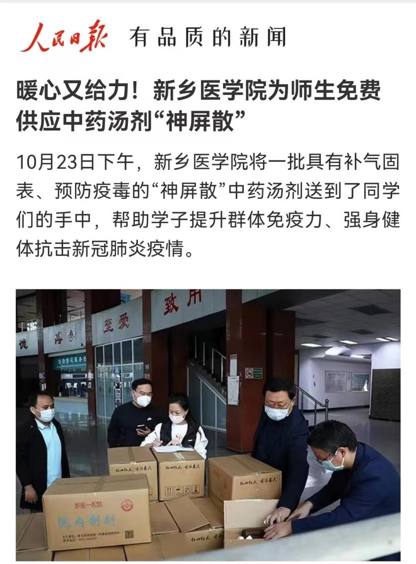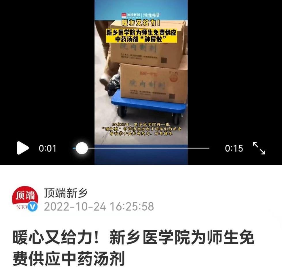 近日,针对新冠肺炎疫情及秋冬时节伤风感冒多发等情况,学校发挥医学高校优势,为学子提供“神屏散”中药汤剂,帮助学子提高免疫力。学习强国等多家媒体报道。(供稿:刘天庆)