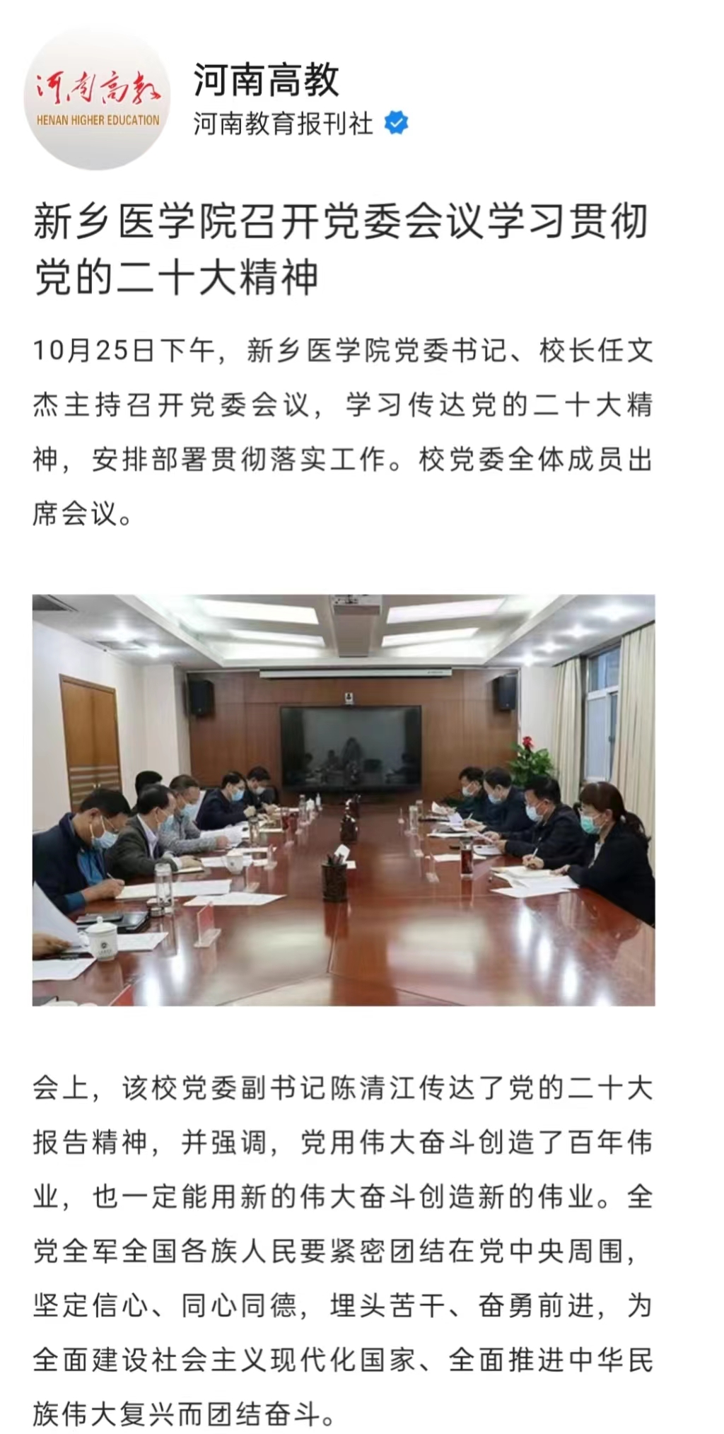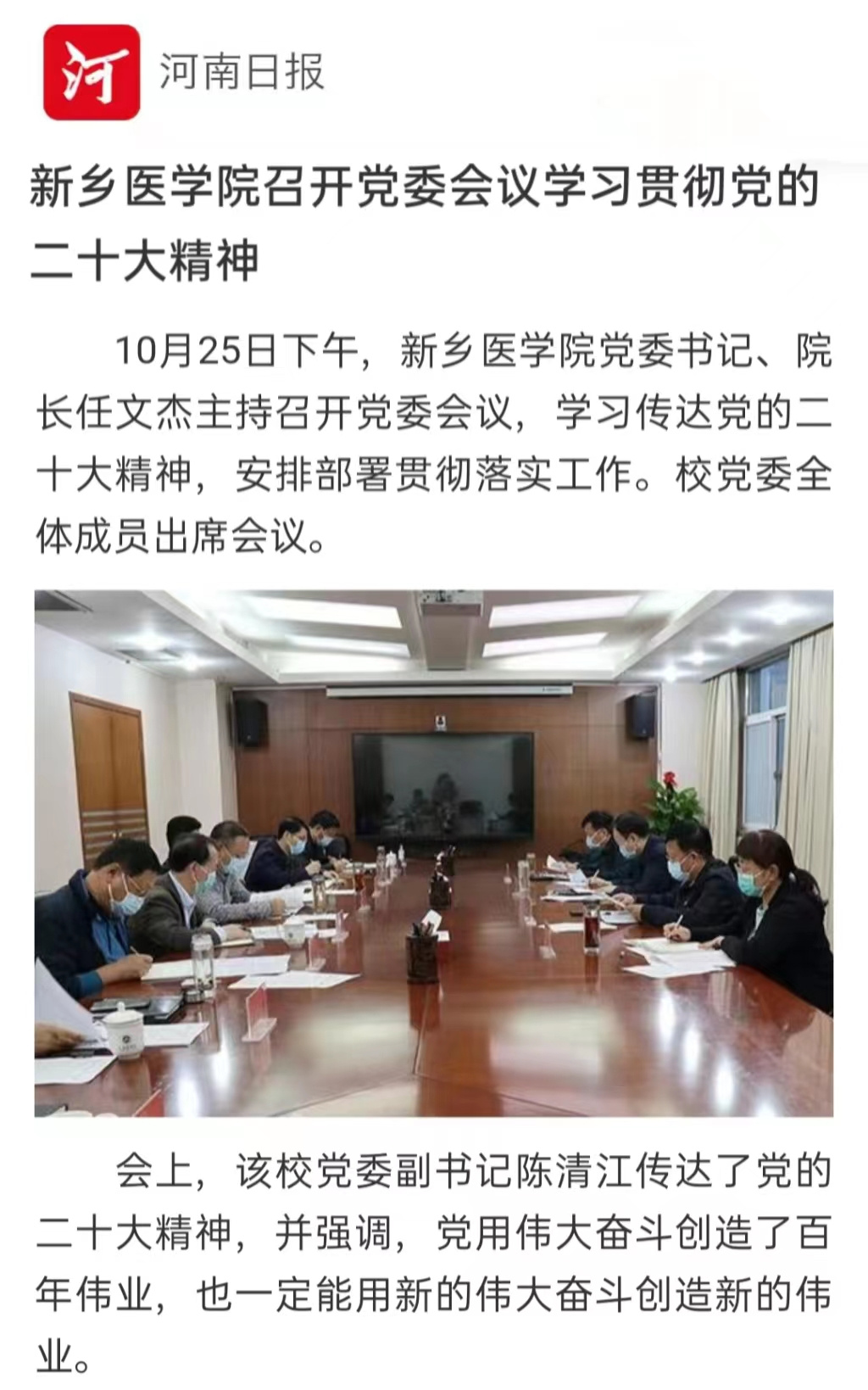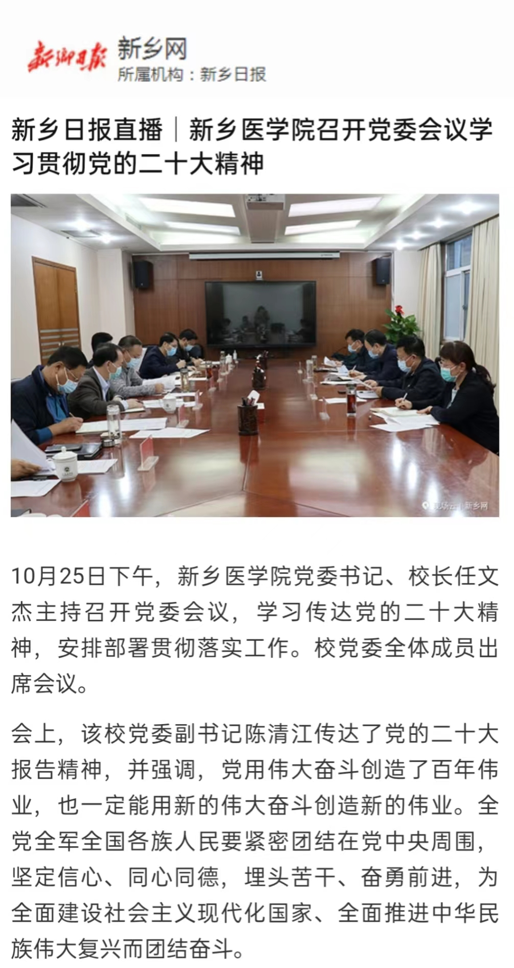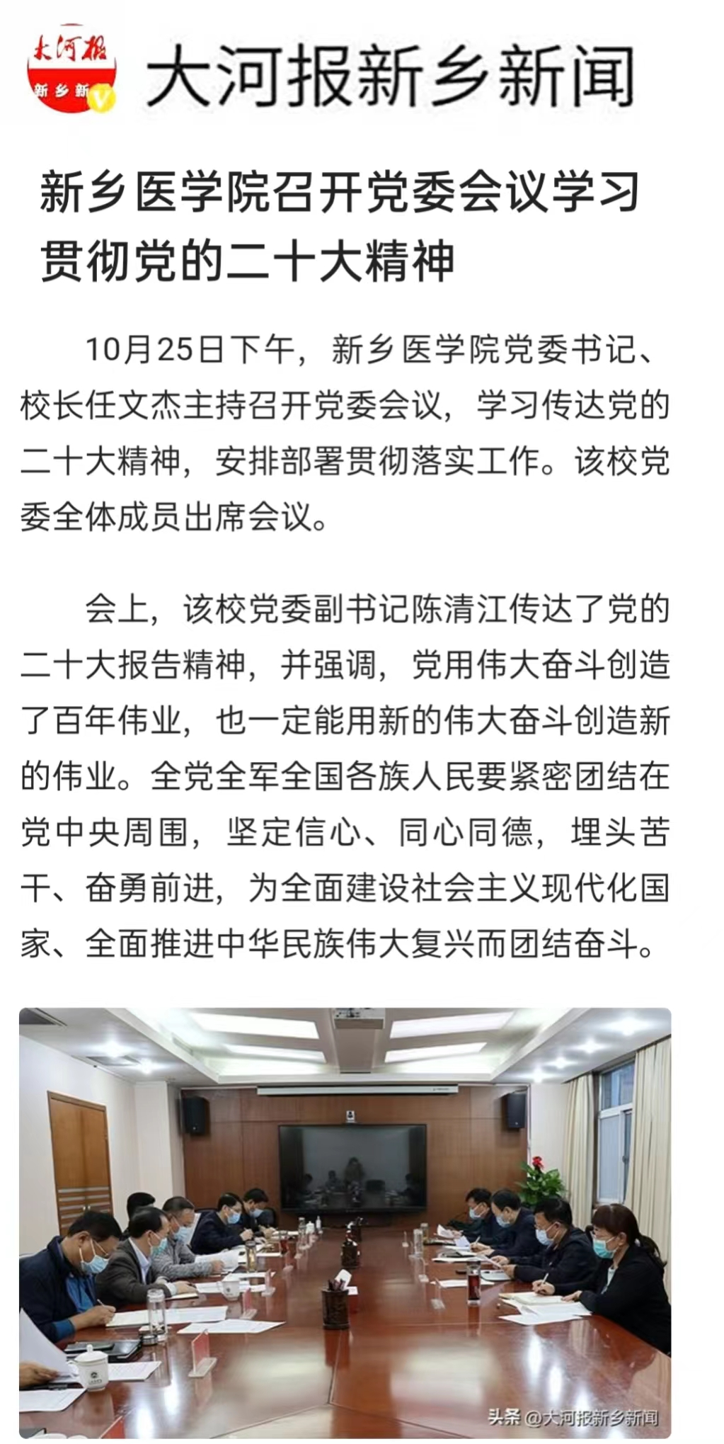 日前,我校召开党委会议学习传达党的二十大精神,安排部署贯彻落实工作。校党委书记、校长任文杰在会议上提出深化认识、把牢方向,精心组织、深入学习,指导实践、引领发展等三点要求。(供稿:刘天庆 周子媛)