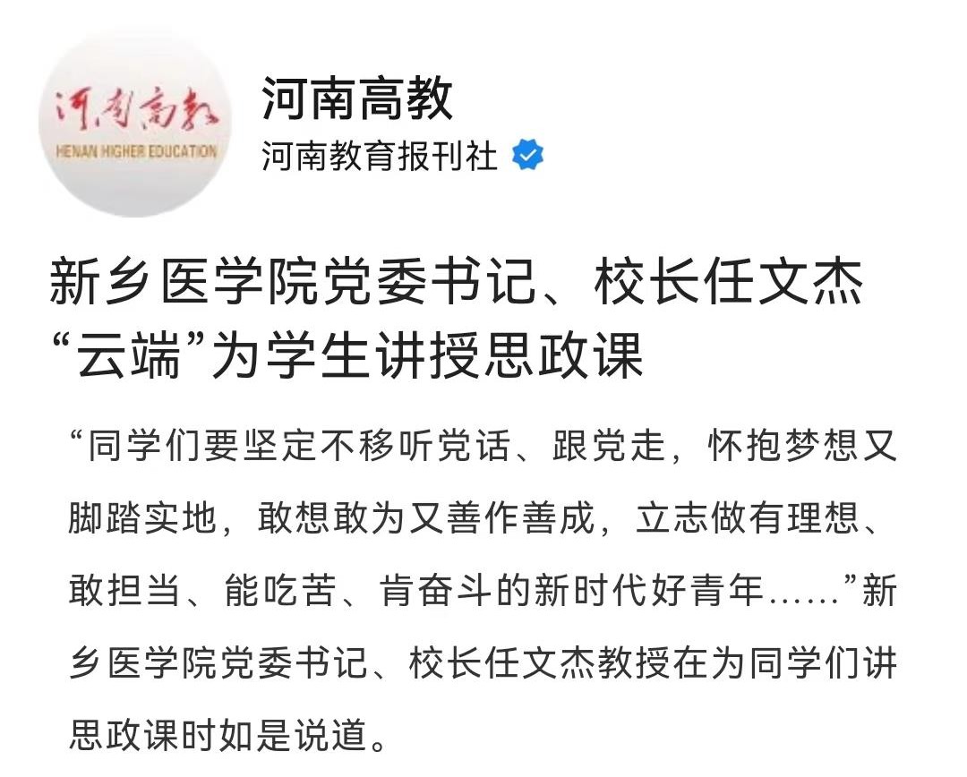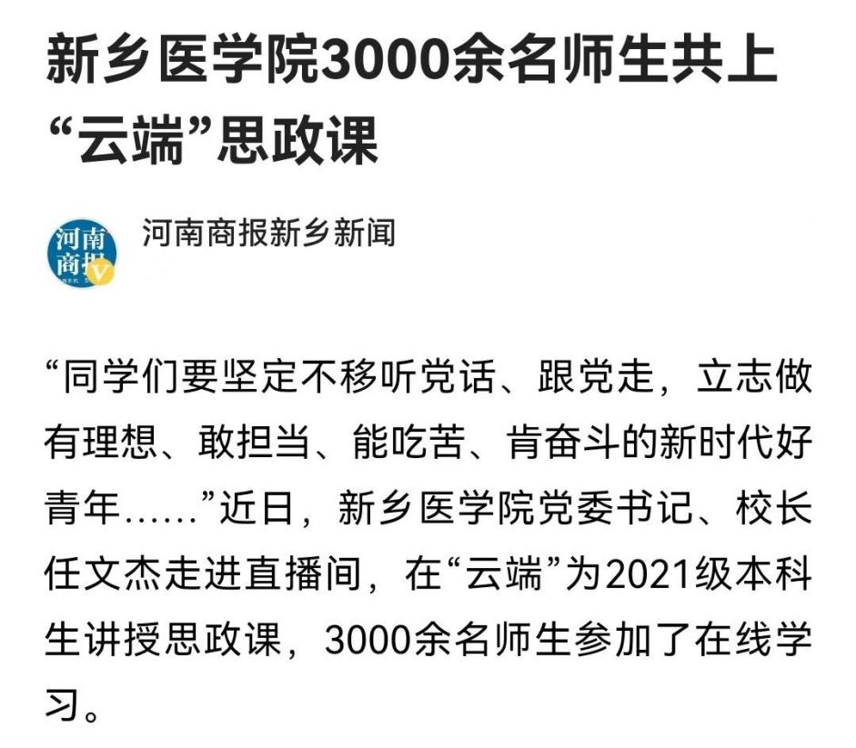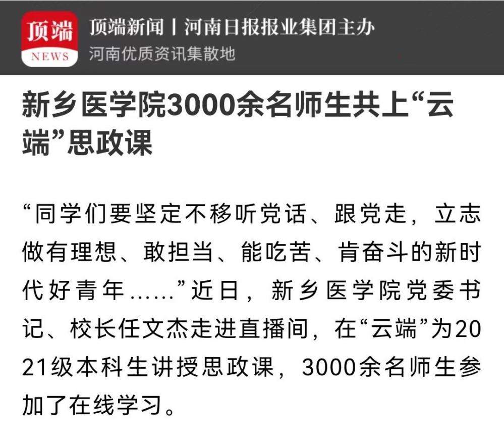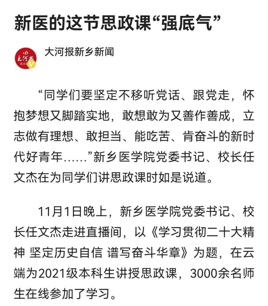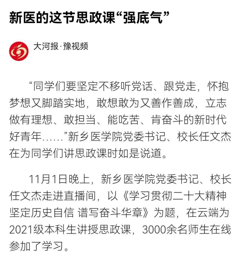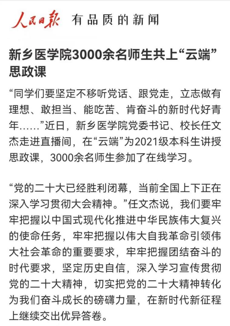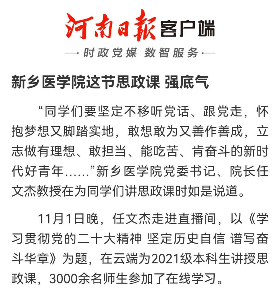 日前,学校党委书记、校长任文杰走进直播间,以《学习贯彻党的二十大精神坚定历史自信谱写奋斗华章》为题,为3000余名师生云端讲授思政课;希望全校青年学子增强新时代青年的志气骨气底气,接过历史的接力棒,在青春的赛道上奋力奔跑,跑出最好的成绩。人民日报客户端等多家媒体报道。(供稿:刘天庆)