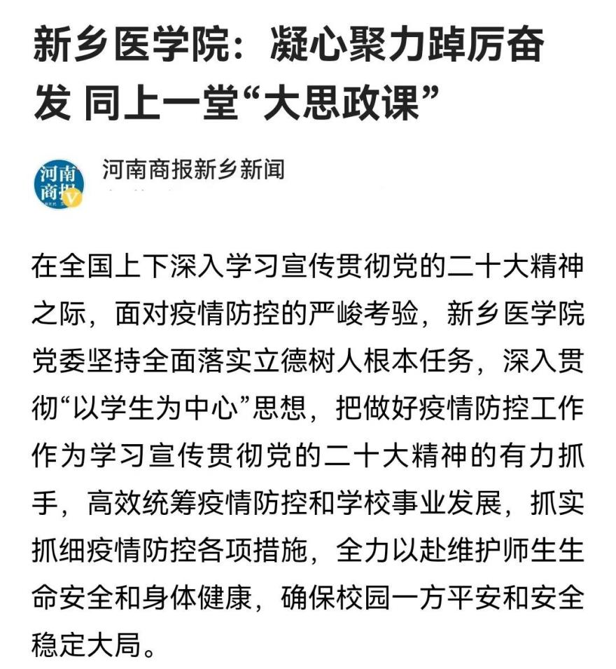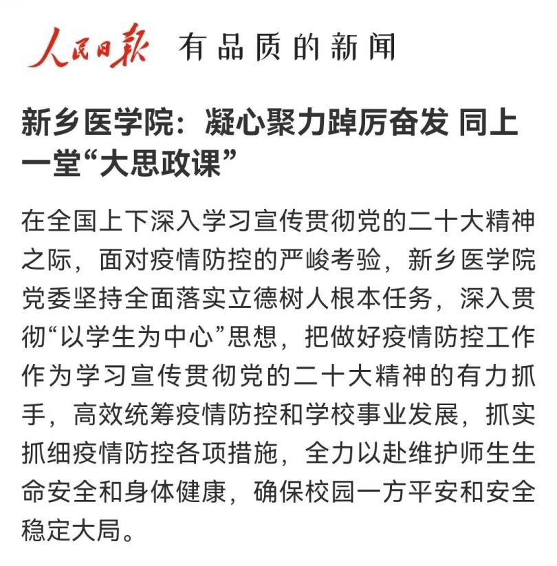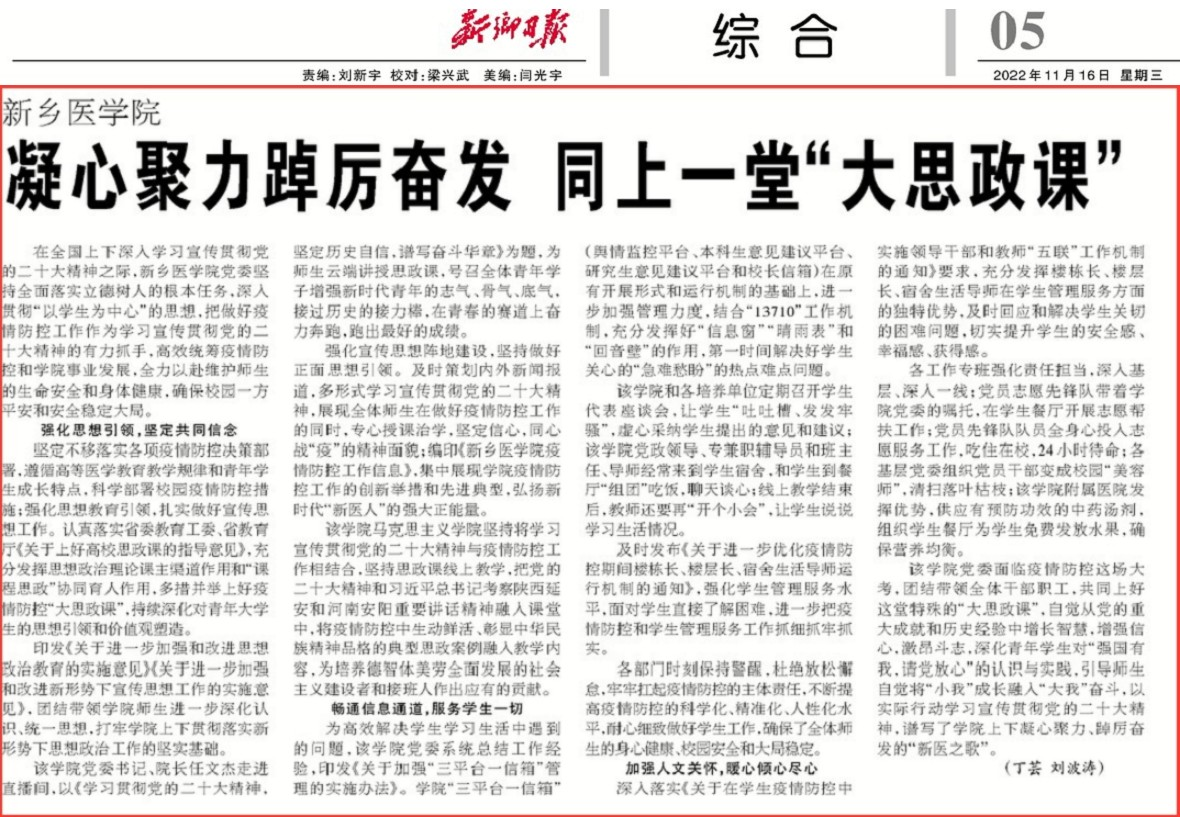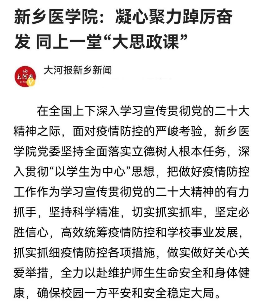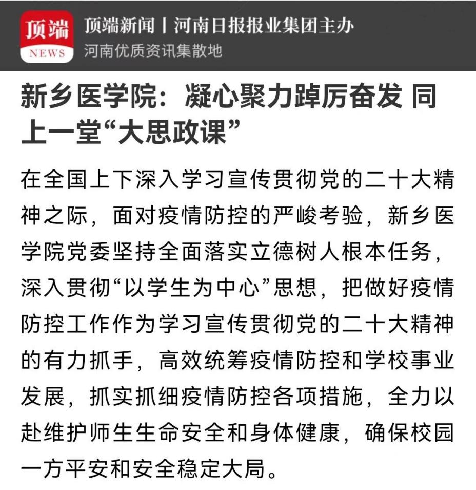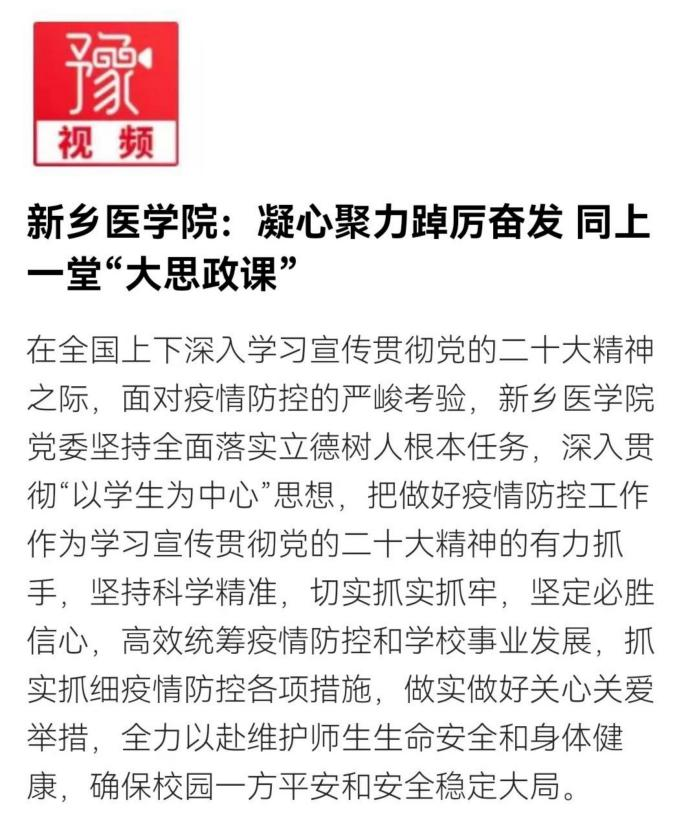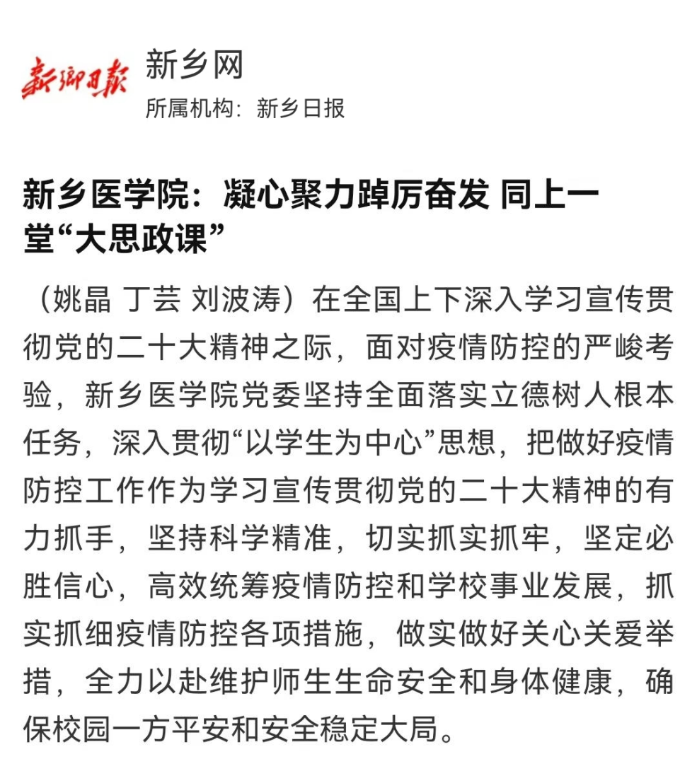 面对疫情防控的严峻考验,我校强化思想引领坚定共同信念,畅通信息通道服务学生一切,加强人文关怀提升学生的获得感、幸福感、安全感,确保校园一方平安和安全稳定大局,全校师生紧紧团结在一起,共同上好这堂特殊的“大思政课”。多家媒体报道。(供稿:刘天庆)