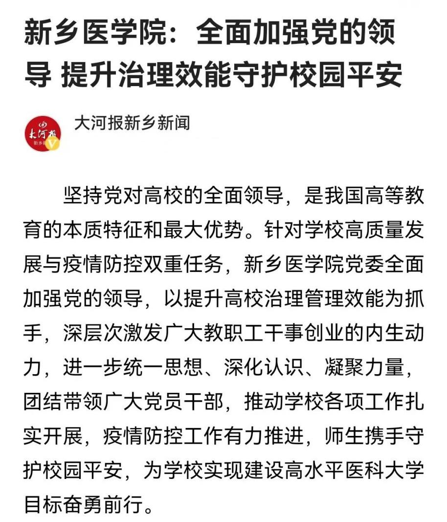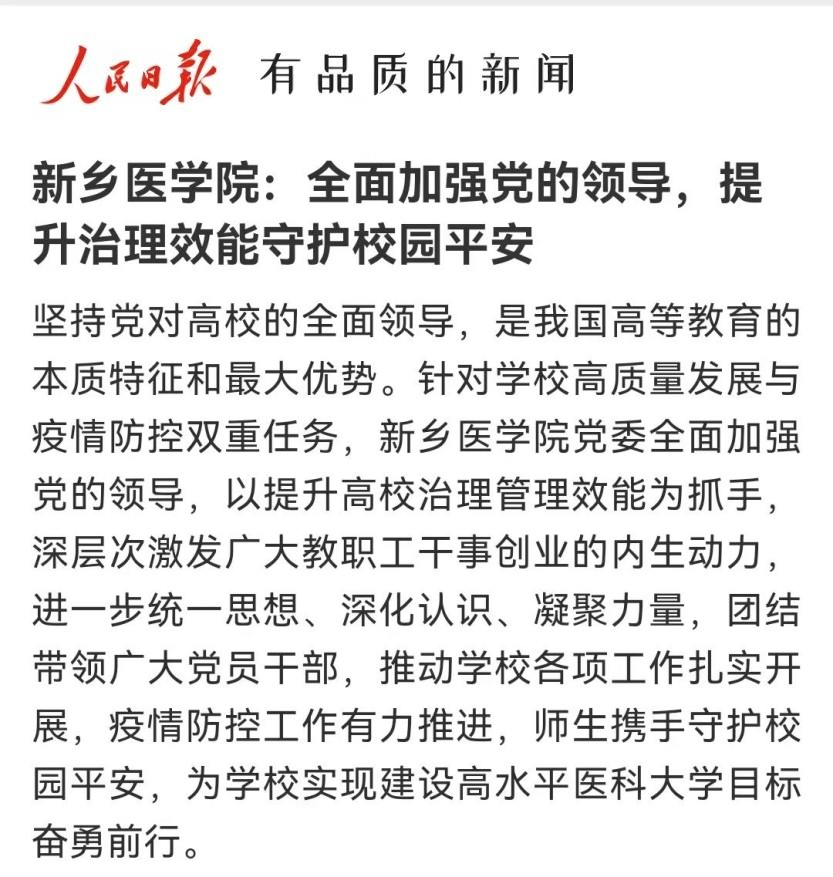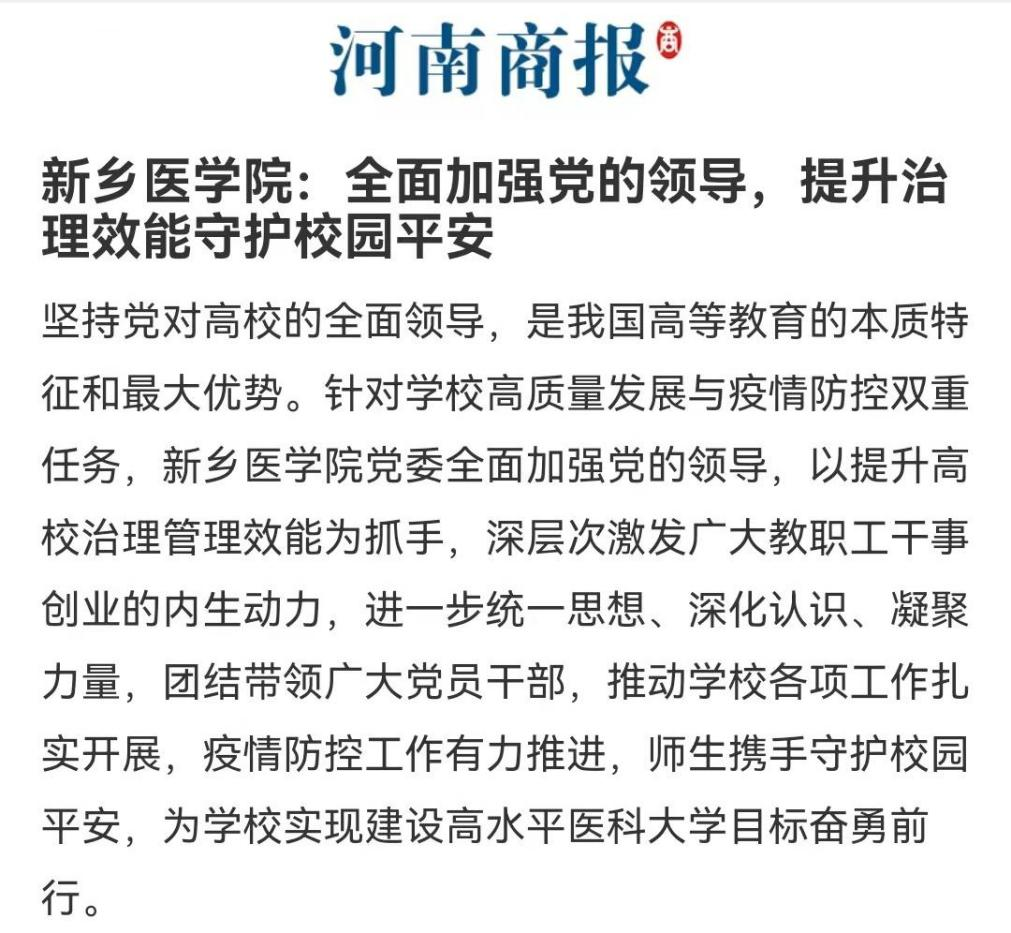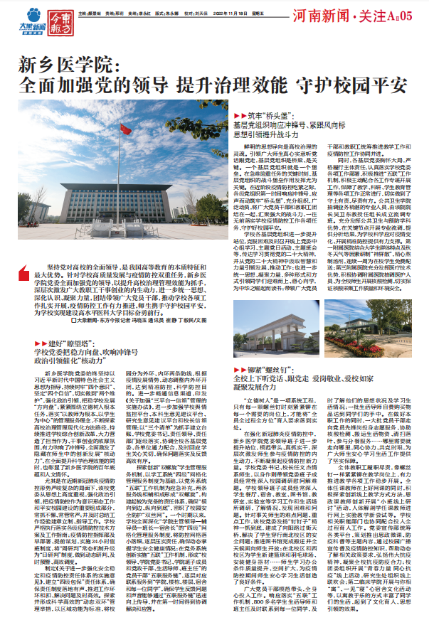 针对学校高质量发展与疫情防控双重任务,我校全面加强党的领导,以提升高校治理管理效能为抓手,团结带领全校师生携手守护校园平安,为学校实现建设高水平医科大学目标奋勇前行。多家媒体以《全面加强党的领导提升治理能效守护校园平安》为题,通过建好“瞭望塔”:学校党委把稳方向盘、吹响冲锋号,政治引领催化“核动力”;筑牢“桥头堡”:基层党组织响应冲锋号、紧跟风向标,思想引领提升战斗力;铆紧“螺丝钉”:全校上下听党话、跟党走,爱岗敬业、爱校如家凝聚发展合力等三个部分对此进行了详细介绍。《东方今报》以整版的篇幅进行报道。(供稿:刘天庆)