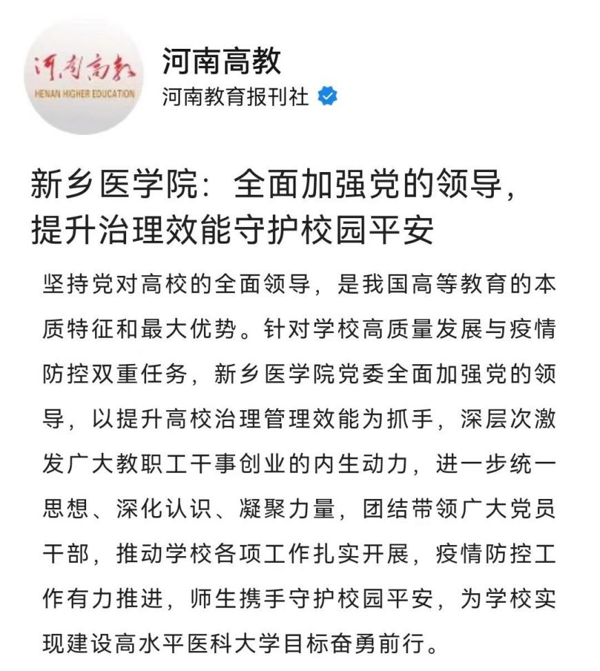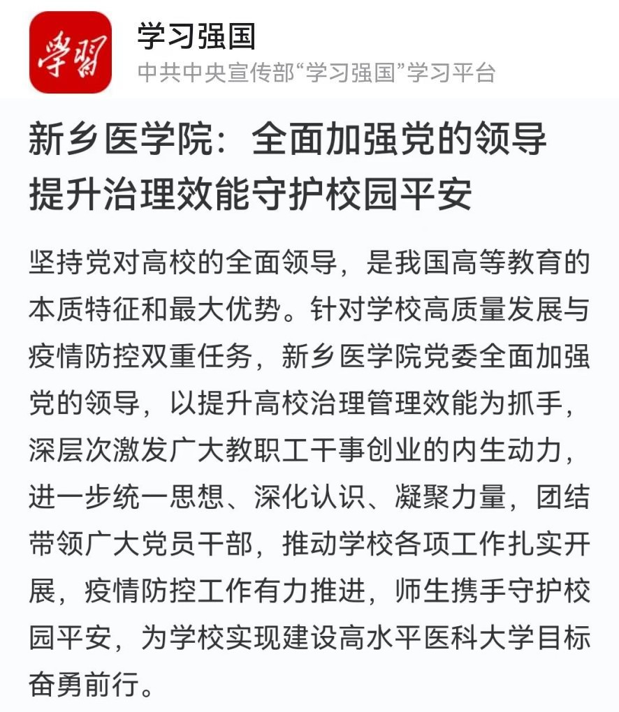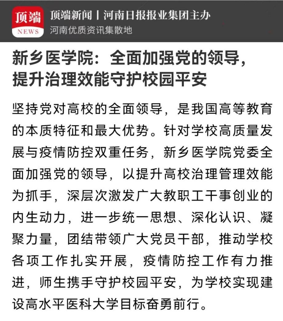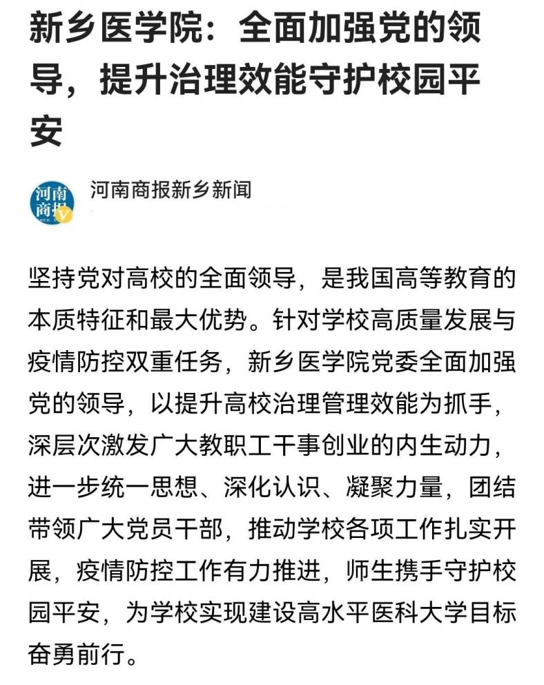 针对学校高质量发展与疫情防控双重任务,我校全面加强党的领导,以提升高校治理管理效能为抓手,团结带领全校师生携手守护校园平安,为学校实现建设高水平医科大学目标奋勇前行。多家媒体以《全面加强党的领导提升治理能效守护校园平安》为题,通过建好“瞭望塔”:学校党委把稳方向盘、吹响冲锋号,政治引领催化“核动力”;筑牢“桥头堡”:基层党组织响应冲锋号、紧跟风向标,思想引领提升战斗力;铆紧“螺丝钉”:全校上下听党话、跟党走,爱岗敬业、爱校如家凝聚发展合力等三个部分对此进行了详细介绍。《东方今报》以整版的篇幅进行报道。(供稿:刘天庆)