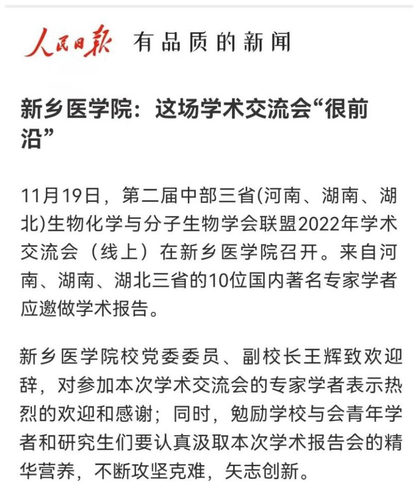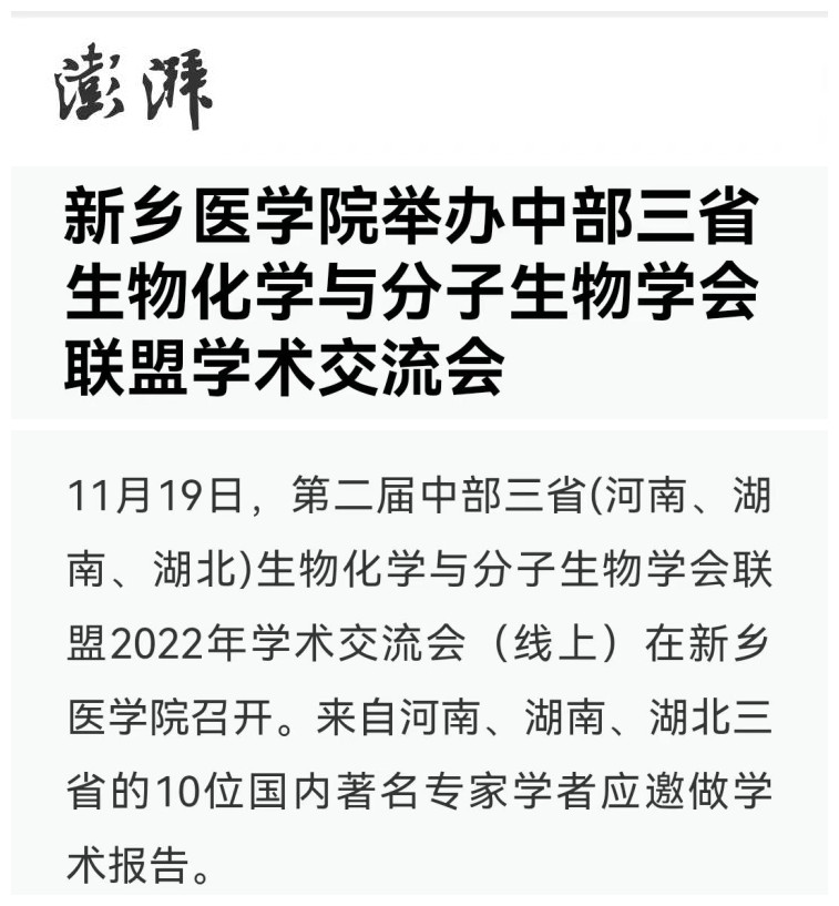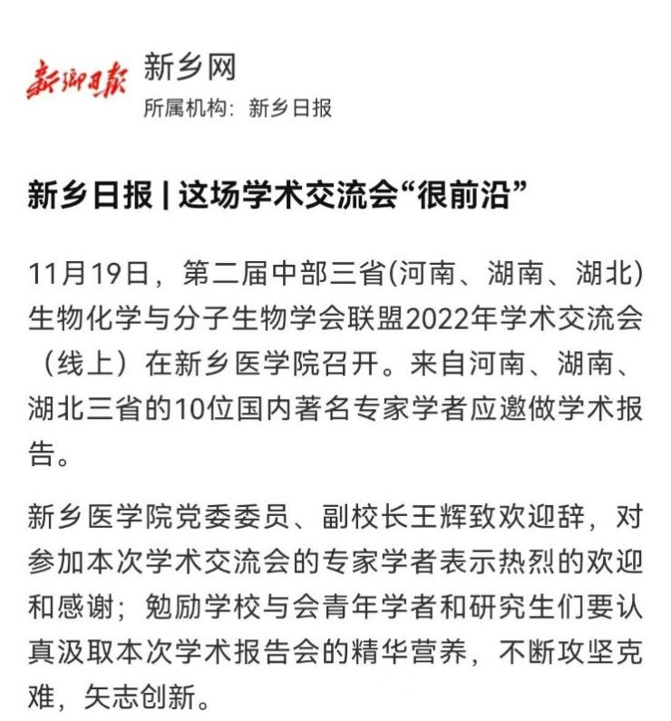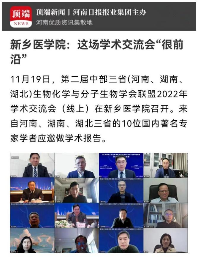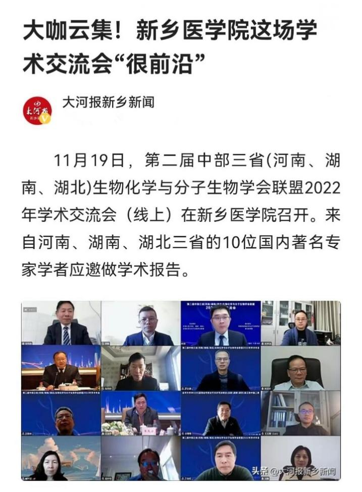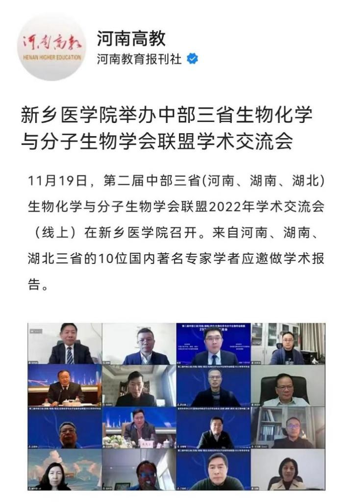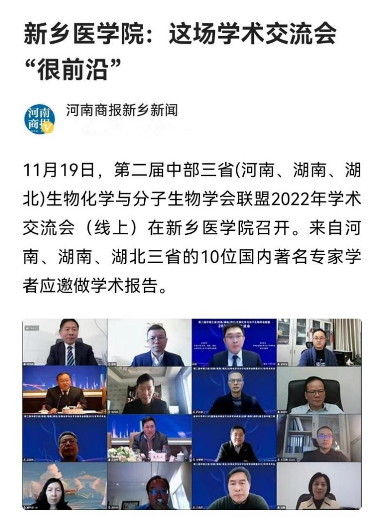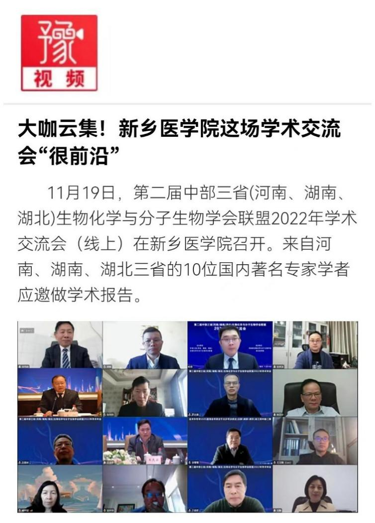 日前,由我校承办的第二届中部三省(河南、湖南、湖北)生物化学与分子生物学会联盟2022年学术交流会以线上的形式召开,来自河南、湖南、湖北三省的10位国内著名专家学者应邀做学术报告。此次交流会促进了中部三省生物化学与分子生物学领域教学科研工作者的交流和合作。多家媒体报道。(供稿:刘天庆)