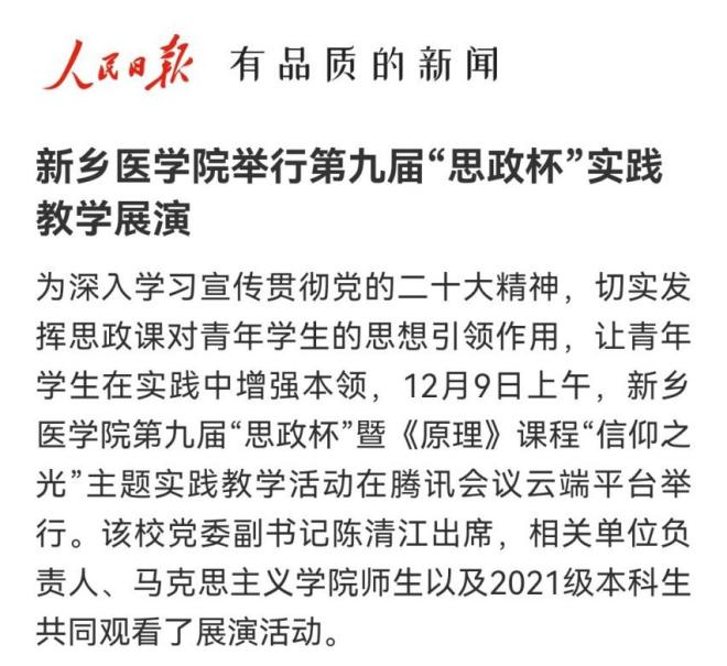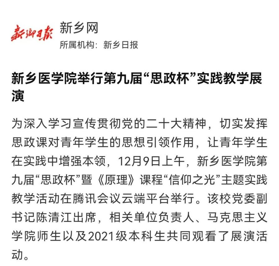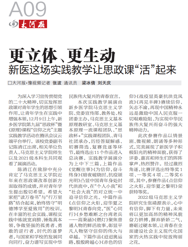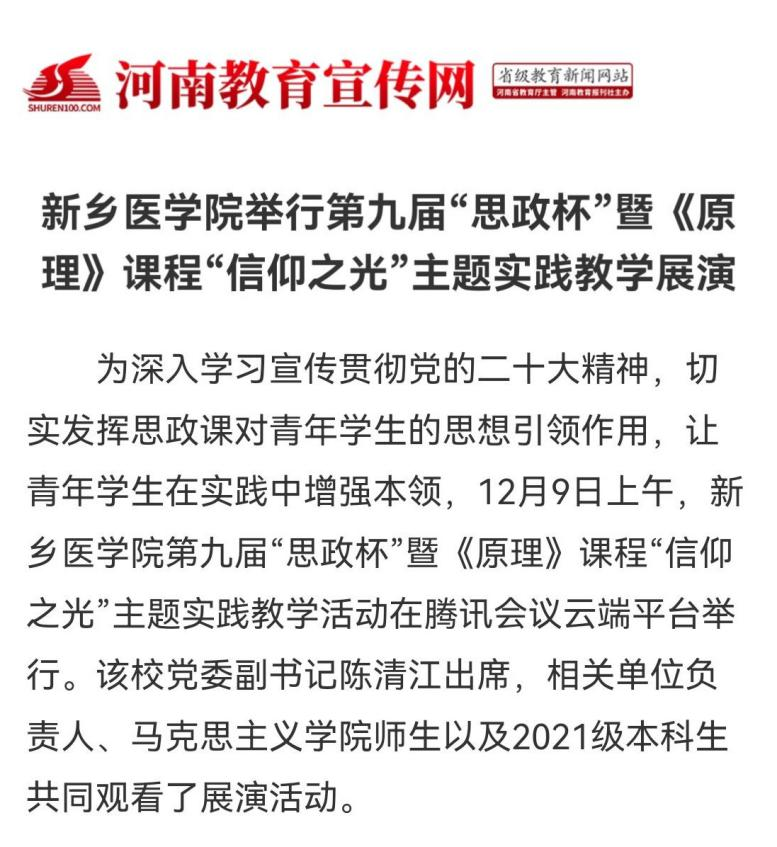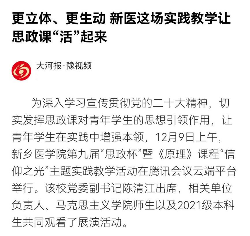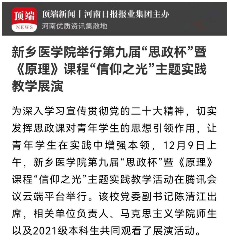 日前,我校第九届“思政杯”暨《原理》课程“信仰之光”主题实践教学活动在腾讯会议云端平台举行。11个参赛作品,分为上中下三篇,以情景剧、微视频、朗诵等多种形式,生动诠释了信仰的力量,完美展现了新医学子积极阳光的精神面貌。多家媒体进行报道。(供稿:刘天庆)
