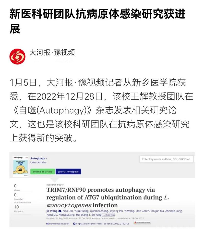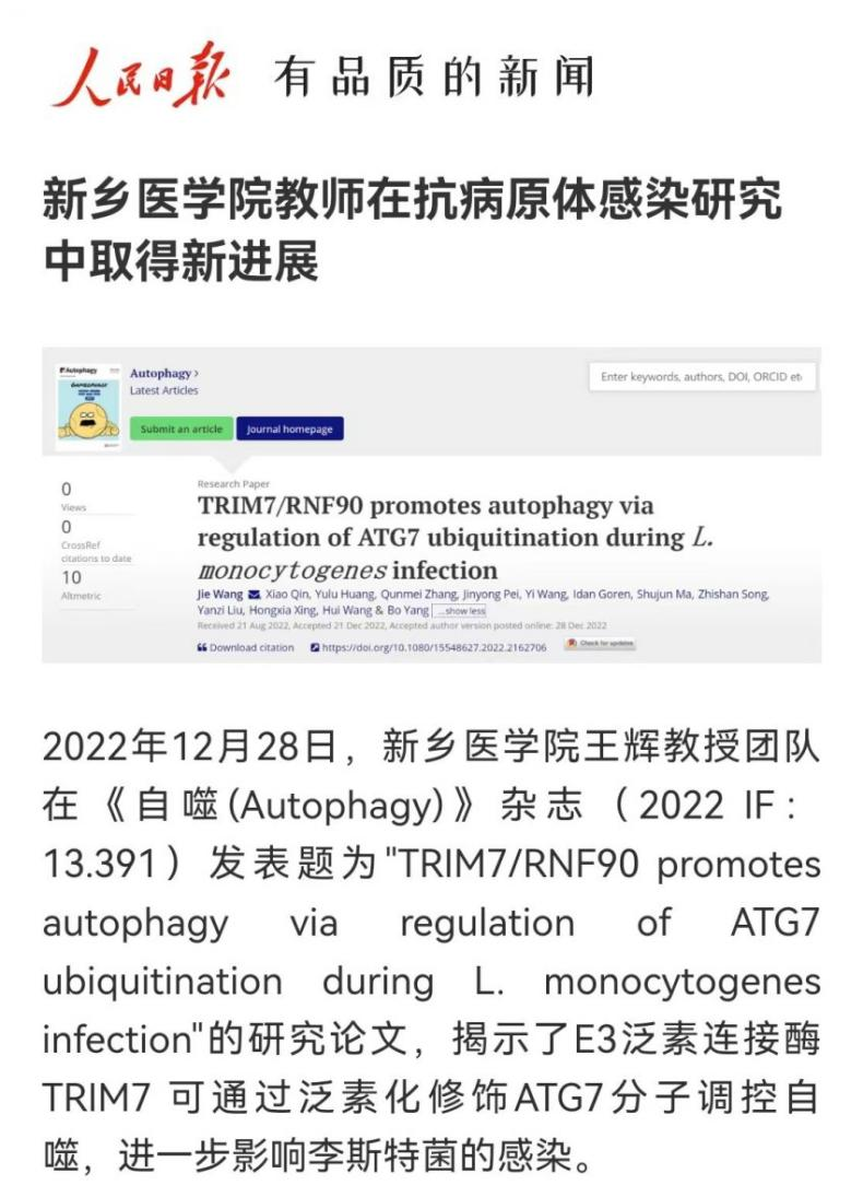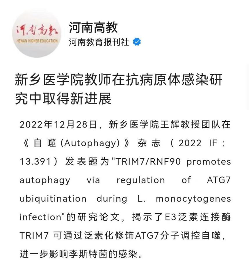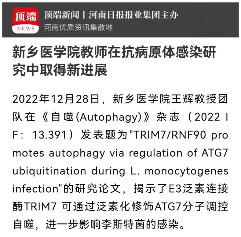 我校医学检验学院王洁博士在国际著名期刊《Autophagy》杂志上发表题为“TRIM7/RNF90 promotes autophagy via regulation of ATG7 ubiquitination duringL. monocytogenesinfection”的研究论文,揭示了E3泛素连接酶TRIM7 可通过泛素化修饰ATG7分子调控自噬,进一步影响李斯特菌的感染。多家媒体报道。(供稿:刘天庆)