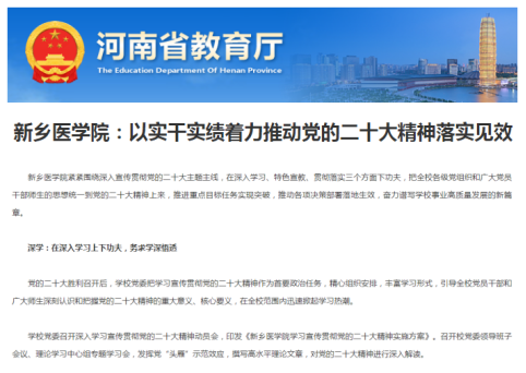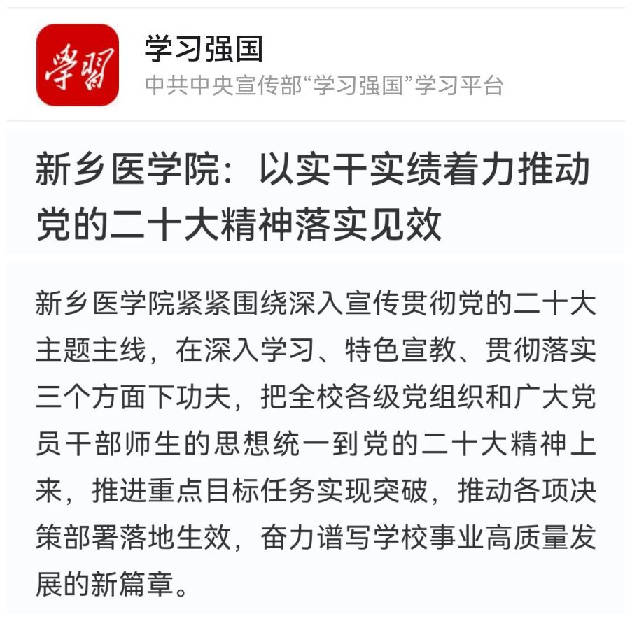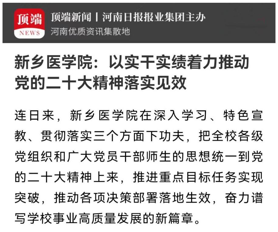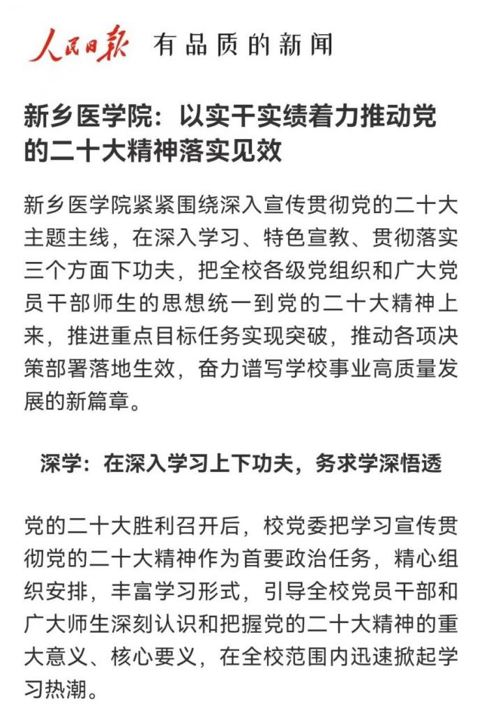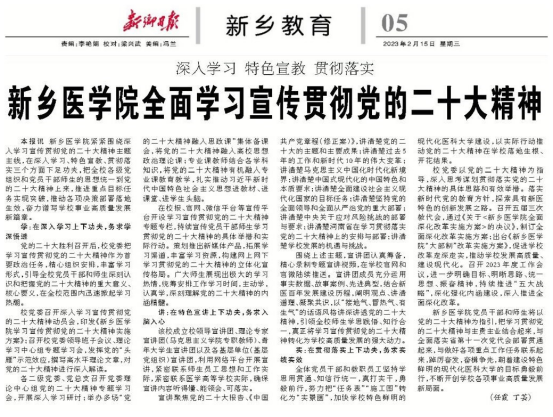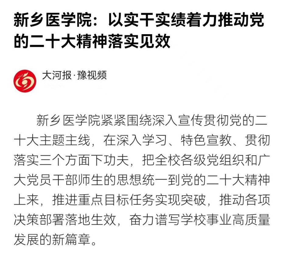 自党的二十大召开以来,我校紧紧围绕深入宣传贯彻党的二十大主题主线,做到深学,在深入学习上下功夫,务求学深悟透;细讲,在特色宣讲上下功夫,务求入脑入心;实干:在贯彻落实上下功夫,务求实绩实效;把全校各级党组织和广大党员干部师生的思想统一到党的二十大精神上来,推进重点目标任务实现突破,推动各项决策部署落地生效。多家媒体报道。(供稿:刘天庆)