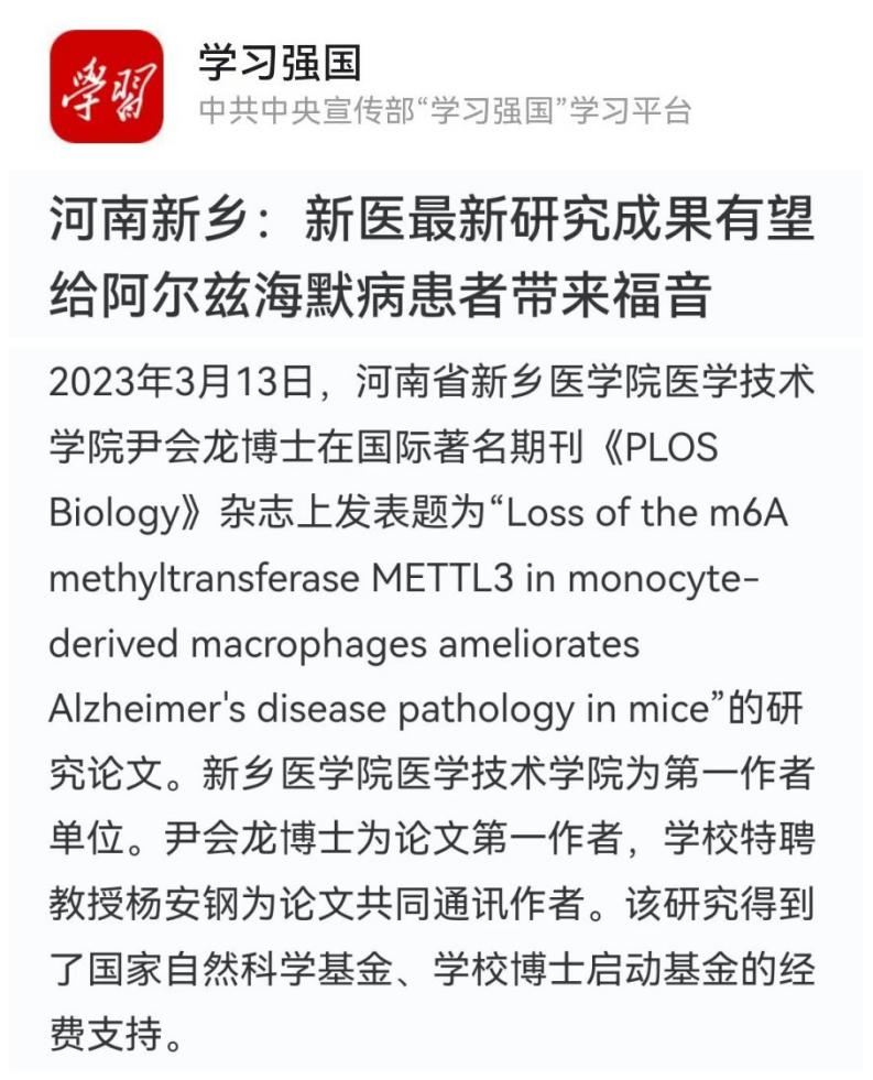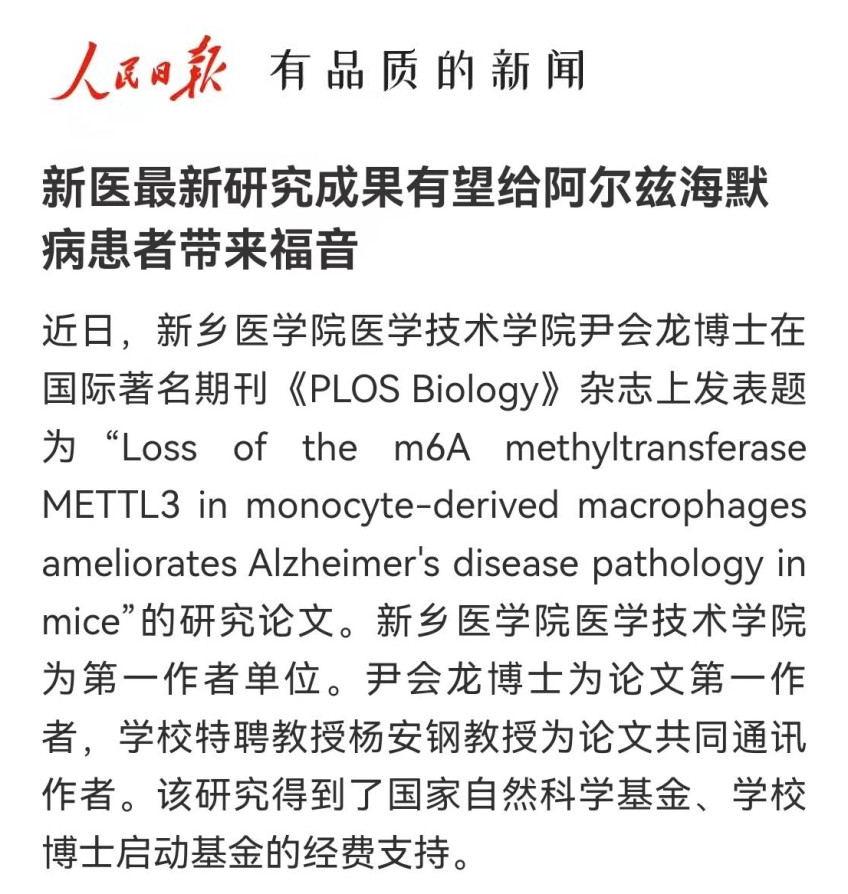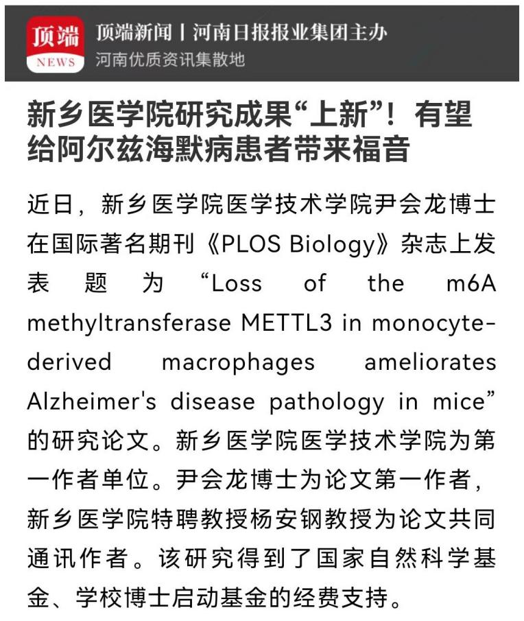 我校医学技术学院尹会龙博士在国际著名期刊《PLOS Biology》杂志上发表题为“Loss of the m6A methyltransferase METTL3 in monocyte-derived macrophages ameliorates Alzheimer's disease pathology in mice”的研究论文。该研究所揭示的机制给我们提供了阿尔兹海默病发生的新解释,也为设计相应的靶向药物提供具有启发性的思路,有望改善AD病人的症状,给AD病人带来福音。(供稿:刘天庆)