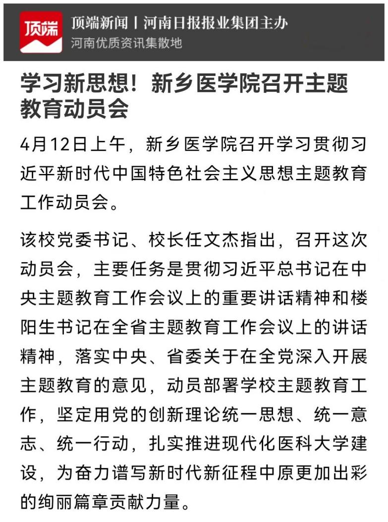 日前,我校召开学习贯彻习近平新时代中国特色社会主义思想主题教育动员会,对学校主题教育进行安排部署,动员广大党员干部把思想和行动统一到中央、省委部署要求上来。校党委书记、校长任文杰提出提高政治站位、领悟重大意义,切实增强开展主题教育的政治责任感和历史使命感;明确目标要求、把握工作重点,全力推动主题教育各项任务落到实处;周密安排部署、精心组织实施,确保主题教育取得实实在在成效等三点要求。多家媒体报道。(供稿:刘天庆)