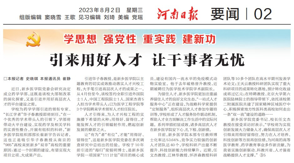 8月2日,《河南日报》要闻版以《引来用好人才 让干事者无忧》为题报道我校人才引得来,为人才兴校工程的实施播下希望的火种;用得好、留得住,发挥人才的引领辐射作用,燃起创新发展的燎原之火。