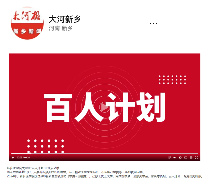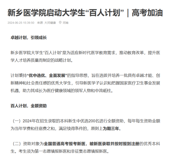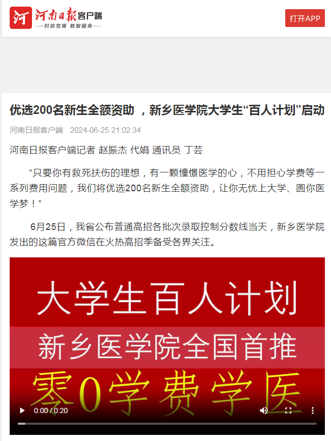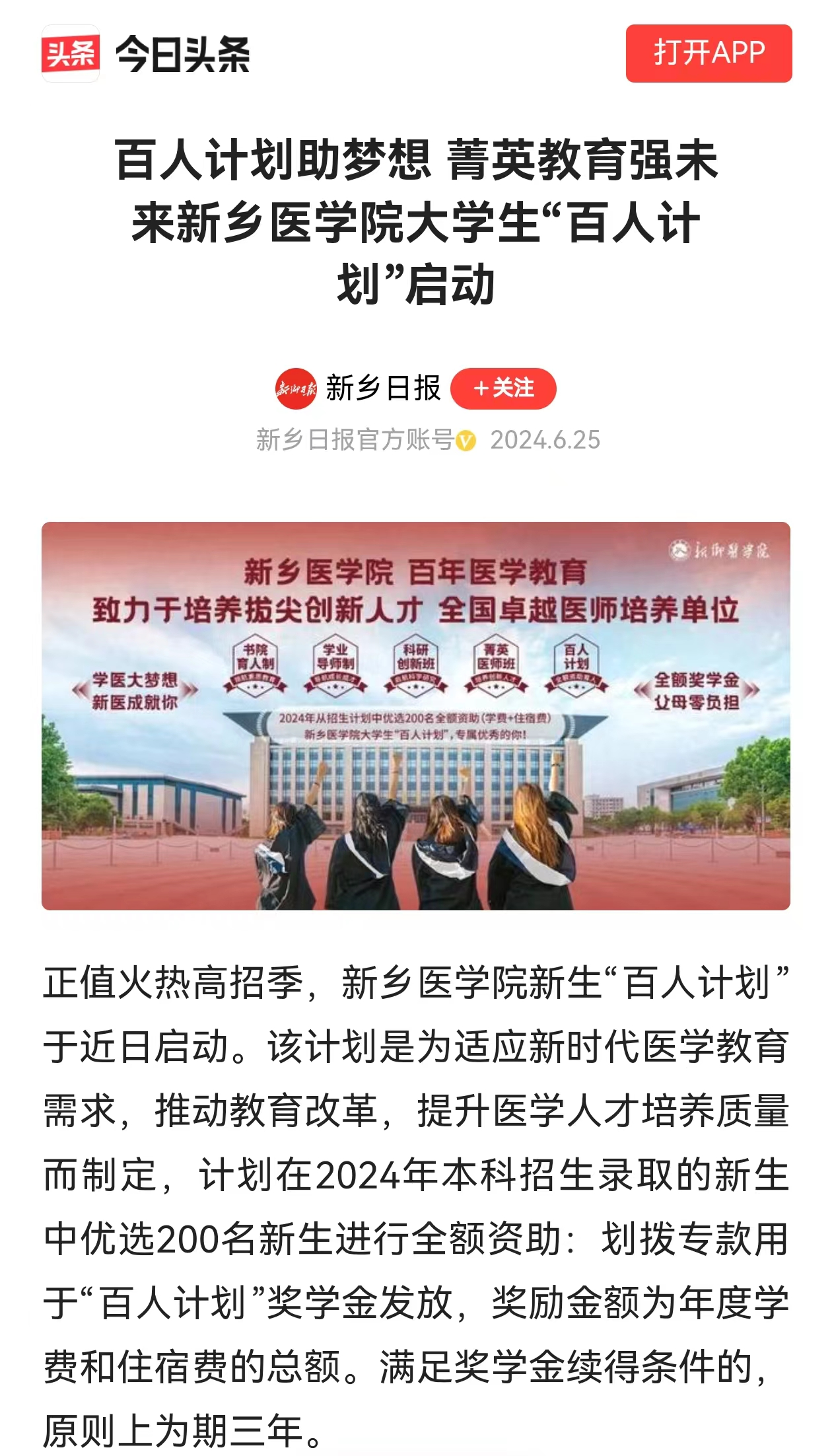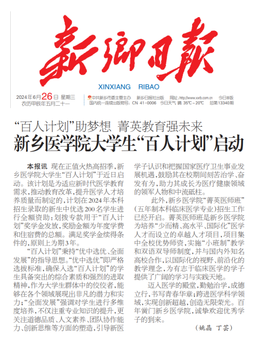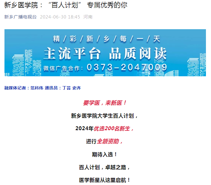 要学医,来新医!为适应新时代医学教育需求,推动教育改革,提升医学人才培养质量而制定的战略计划——大学生“百人计划”今年在我校启动。计划优选200名新生全额资助(学费+住宿费),秉持“优中选优、全面发展”的指导思想,不仅注重专业知识的提升,更关注道德品质、人文素养、团队协作能力、创新思维等方面的塑造,引导学子认识和把握国家医疗卫生事业发展机遇,鼓励其刻苦治学,奋发有为,助力其成长为医疗健康领域的领军人物和中流砥柱。河南日报客户端、今日头条、大河健康官方网易号、新乡日报、新乡广播电视台等多家媒体报道。(供稿:秦亚如)