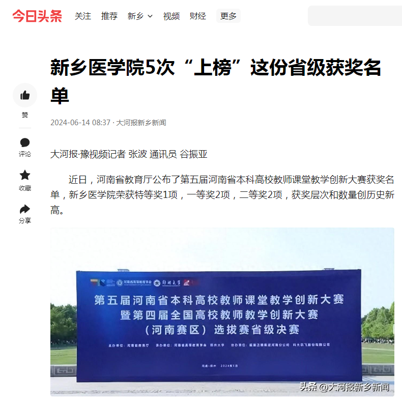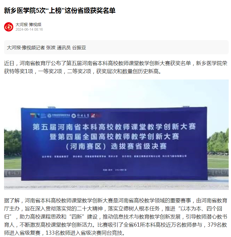 近日,河南省教育厅公布了第五届河南省本科高校教师课堂教学创新大赛获奖名单,我校荣获特等奖1项,一等奖2项,二等奖2项,获奖层次和数量创历史新高。大赛展现了我校教师个人能力和教学团队综合实力,体现了学校近年来的教学改革与建设成果。长期以来,我校坚持以赛促教、以赛促研、以赛促建、以赛促创,通过构建“院-校-省-国”四级教学竞赛体系,持续深入推动教学改革,促进教学理念及教学手段的创新,不断提升教师教学能力和人才培养质量。大河报客户端、今日头条等媒体报道。(供稿:秦亚如)