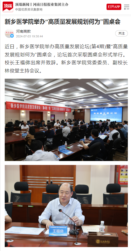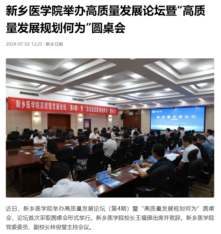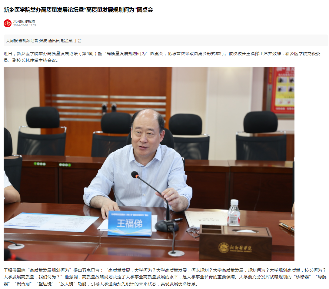 近日,我校举办以“高质量发展规划何为”为主题的第四期高质量发展论坛,并首次采用圆桌讨论的形式进行。校长王福俤围绕“高质量发展规划何为”这一主题提出五点思考;河南师范大学副校长、新乡市政协副主席、河南省政协常委宋晔教授受邀作主旨报告;与会专家学者深入探讨大学战略规划管理和大学治理体系改进,共谋规划引领大学高质量发展之路。人民日报客户端、大河报豫视频、顶端新闻、今日头条、河南高教、大象新闻、新乡日报客户端等媒体报道。(供稿:秦亚如)
