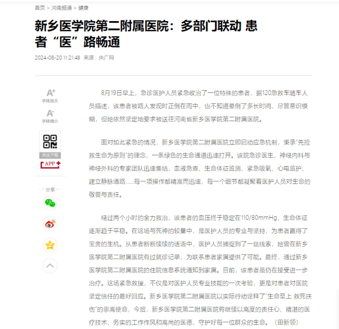 8月19日上午,我校第二附属医院急诊医学科医护人员紧急收治了一位特殊的患者,据120急救车随车人员描述,该患者被路人发现时正倒在雨中,也不知道晕倒了多长时间,尽管意识模糊,但她依然坚定地要求被送往我校第二附属医院。医院秉承“先抢救生命为原则”的理念,一条绿色的生命通道迅速打开,经过两个小时的全力救治,患者生命体征逐渐趋于平稳。央广网、今日头条、大河报·豫视频等媒体报道。(供稿:刘文静)