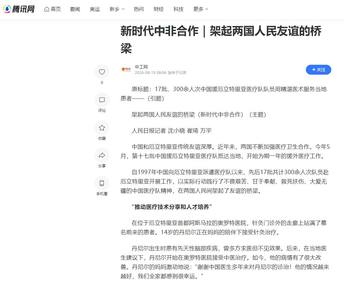 今年5月,我校医学影像学院副院长韩东明教授率领第十七批中国援厄立特里亚医疗队,抵达当地开展援外医疗工作。其间,医疗队秉承不畏艰苦、甘于奉献、救死扶伤、大爱无疆的中国医疗队精神,为当地人民提供了高质量医疗服务,增进了他们的健康与福祉,更升华了中非人民的友谊。此次援外医疗工作中涌现了一系列感人事迹。8月19日,恰逢第七个中国医师节之际,人民日报、中国共产党新闻网、光明网、腾讯网、搜狐网、网易等媒体以《架起两国人民友谊的桥梁(新时代中非合作)》为题对此进行了报道,中国驻厄立特里亚李响大使到医疗队驻地进行慰问。(供稿:钱思齐)