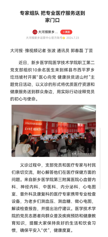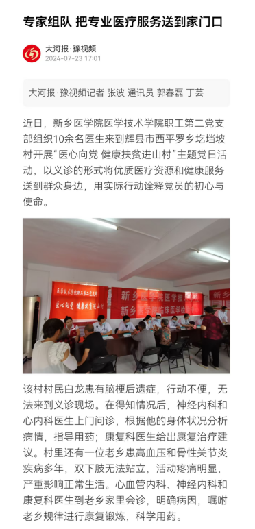 【大河报客户端】等媒体报道我校把专业医疗服务送到群众身边