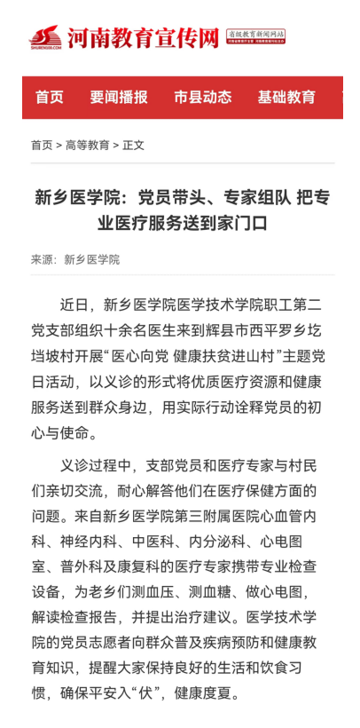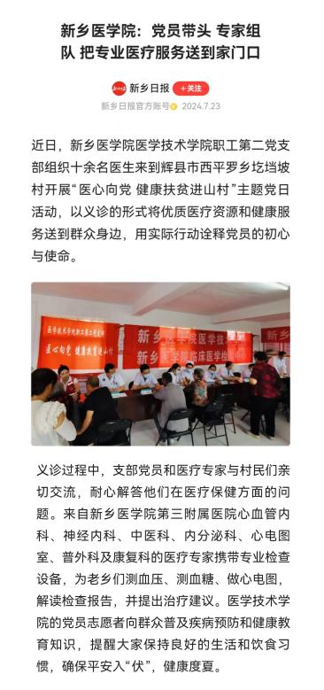 近日,我校医学技术学院职工第二党支部组织十余名医生来到辉县市西平罗乡圪垱坡村开展“医心向党 健康扶贫进山村”主题党日活动,以义诊的形式将优质医疗资源和健康服务送到群众身边,用实际行动诠释党员的初心与使命。义诊活动持续了近4个小时,百余位群众来到现场咨询,大家对华亿在线手机版(大中国区)送到家门口的优质医疗服务高度赞扬。大河报豫视频、今日头条、河南教育宣传网、新乡日报客户端等多家媒体报道。(供稿:丁芸)
