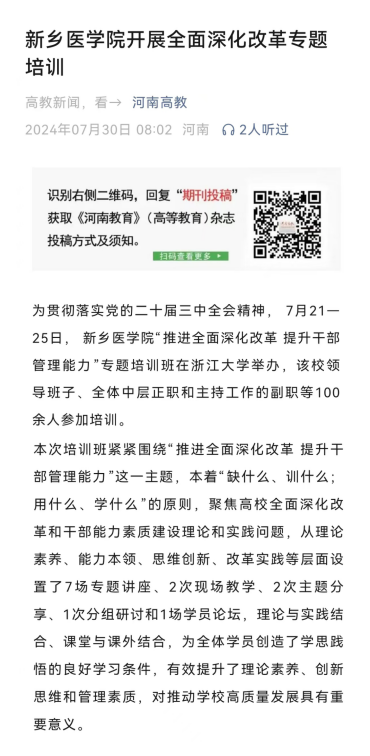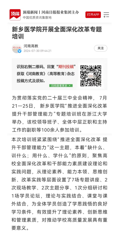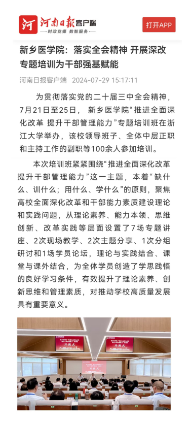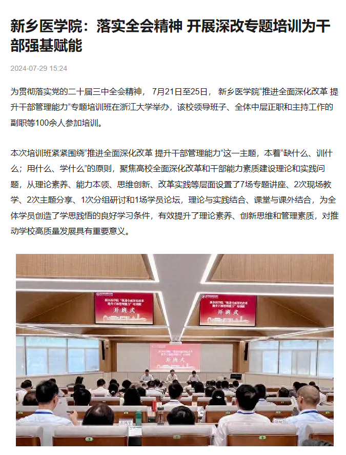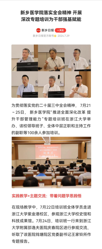 为贯彻落实党的二十届三中全会精神,学校于7月21至25日在浙江大学举办“推进全面深化改革 提升干部管理能力”专题培训班。培训班围绕“推进全面深化改革 提升干部管理能力”这一主题,本着“缺什么、训什么;用什么、学什么”的原则,聚焦高校全面深化改革和干部能力素质建设理论和实践问题,设置了7场专题讲座、2次现场教学、2次主题分享、1次分组研讨和1场学员论坛,为学员创造了学思践悟的良好学习条件,对推动学校高质量发展具有重要意义。河南日报客户端、顶端新闻、今日头条、河南高教、搜狐网、河南教育信息等刊发报道。