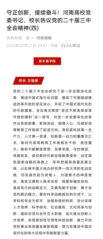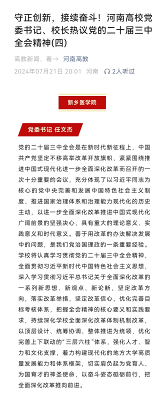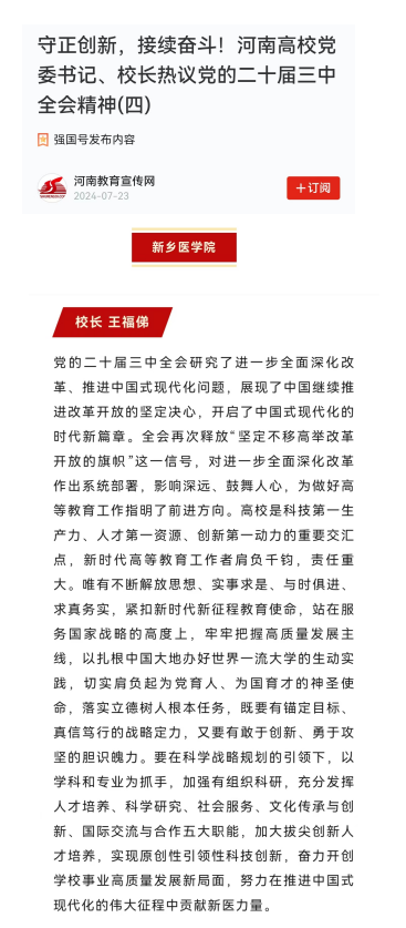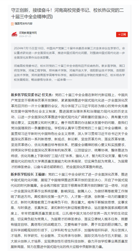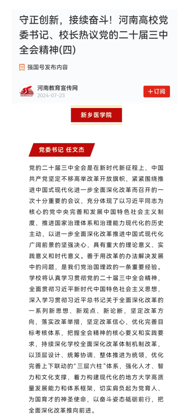 2024年7月15日至18日,中国共产党第二十届中央委员会第三次全体会议在北京举行。会议重点研究进一步全面深化改革、推进中国式现代化问题,对围绕中国式现代化进一步全面深化改革作出总体部署。河南高校党委书记、校长对党的二十届三中全会胜利召开反响热烈。我校党委书记任文杰,校长王福俤结合学校发展规划,畅谈感悟与体会。学习强国、河南高教等媒体报道。