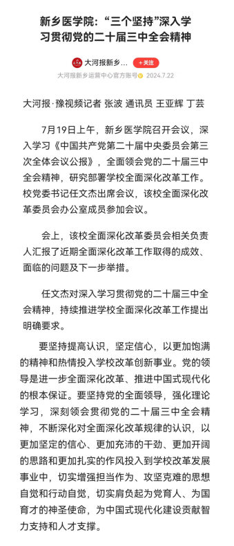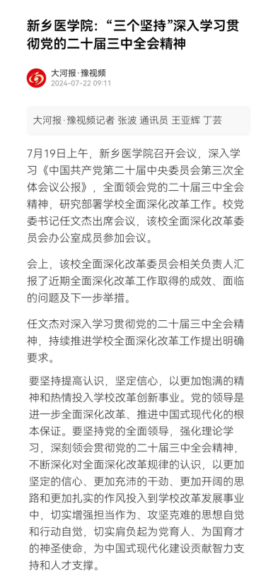 在以中国式现代化全面推进强国建设、民族复兴伟业的关键时期,党的二十届三中全会在北京胜利举行。学校第一时间召开会议,深入学习《中国共产党第二十届中央委员会第三次全体会议公报》,全面领会党的二十届三中全会精神,研究部署学校全面深化改革工作。校党委书记任文杰出席会议,对深入学习贯彻党的二十届三中全会精神,持续推进学校全面深化改革工作提出“三个坚持”的明确要求。大河报豫视频、今日头条等媒体报道。