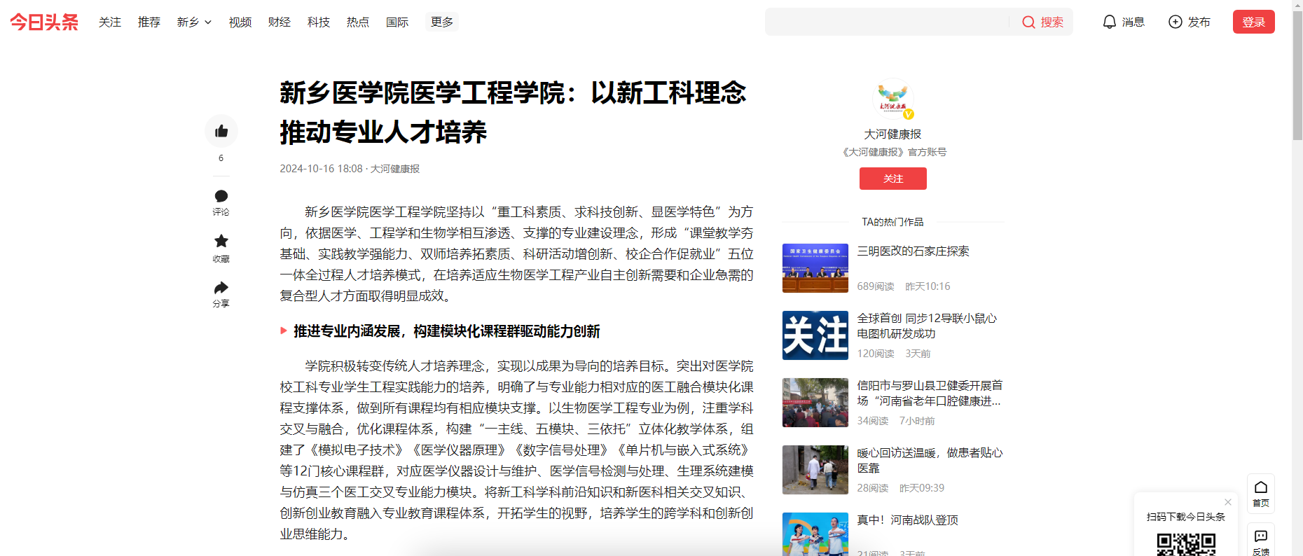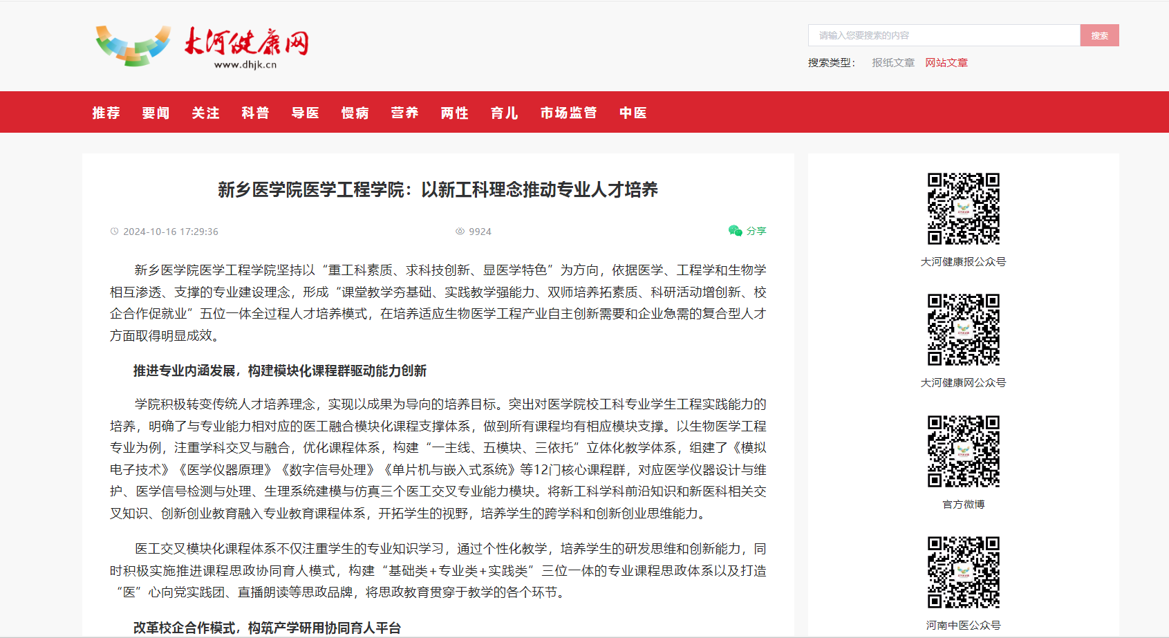 【大河健康网、今日头条、顶端新闻】等媒体聚焦医学工程学院新工科理念引领人才培养成效显著
