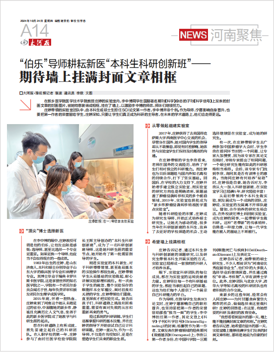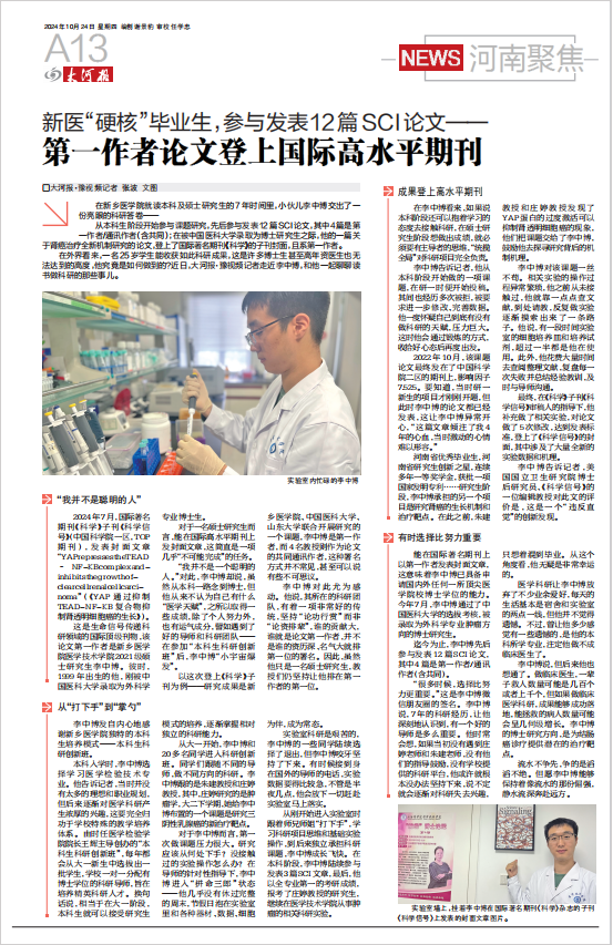 2024年7月,国际著名期刊《科学》子刊《科学信号》发表封面文章《YAP过抑制TEAD-NF-KB合物抑制肾透明细胞癌的生长》。该期刊是生命信号传递科研领域的国际顶级刊物,该论文第一作者是我校医学技术学院2021级硕士研究生李中博。1999年出生的他,前不久被中国医科大学录取为外科学专业博士生。李中博从本科生阶段开始参与课题研究,先后参与发表12篇SCI论文,其中4篇是第一作者/通讯作者(含共同)。本科刚毕业的学生为何能收获如此丰硕的科研成果,他究竟是如何做到的?大河报·豫视频记者走近李中博,挖掘他身上的科研故事,了解我校高水平人才的培养之道。报道详见大河报2024年10月24日A17、A18版。