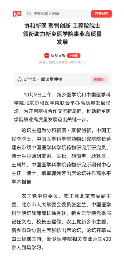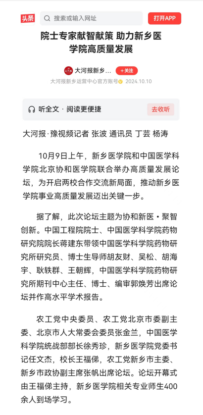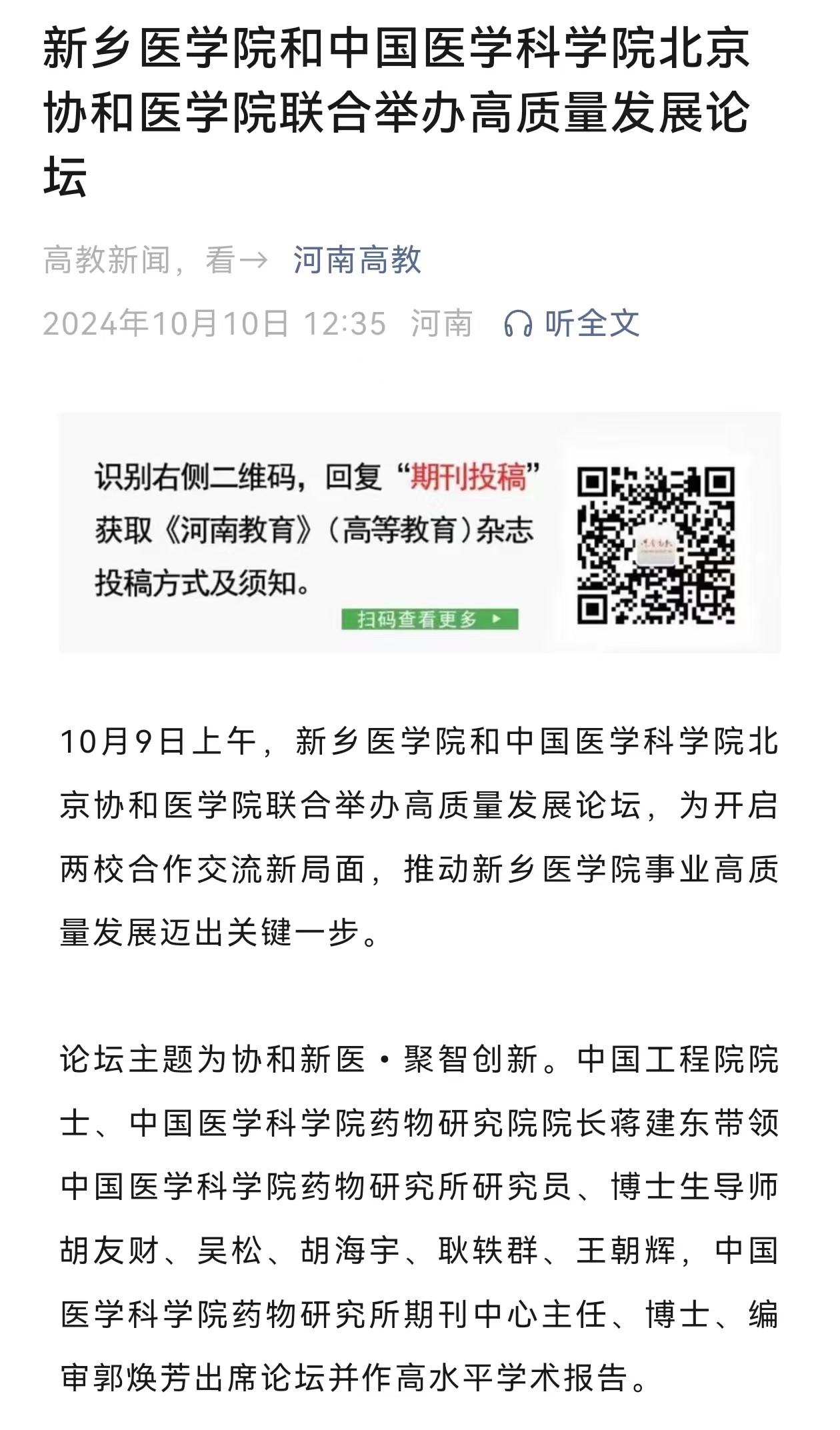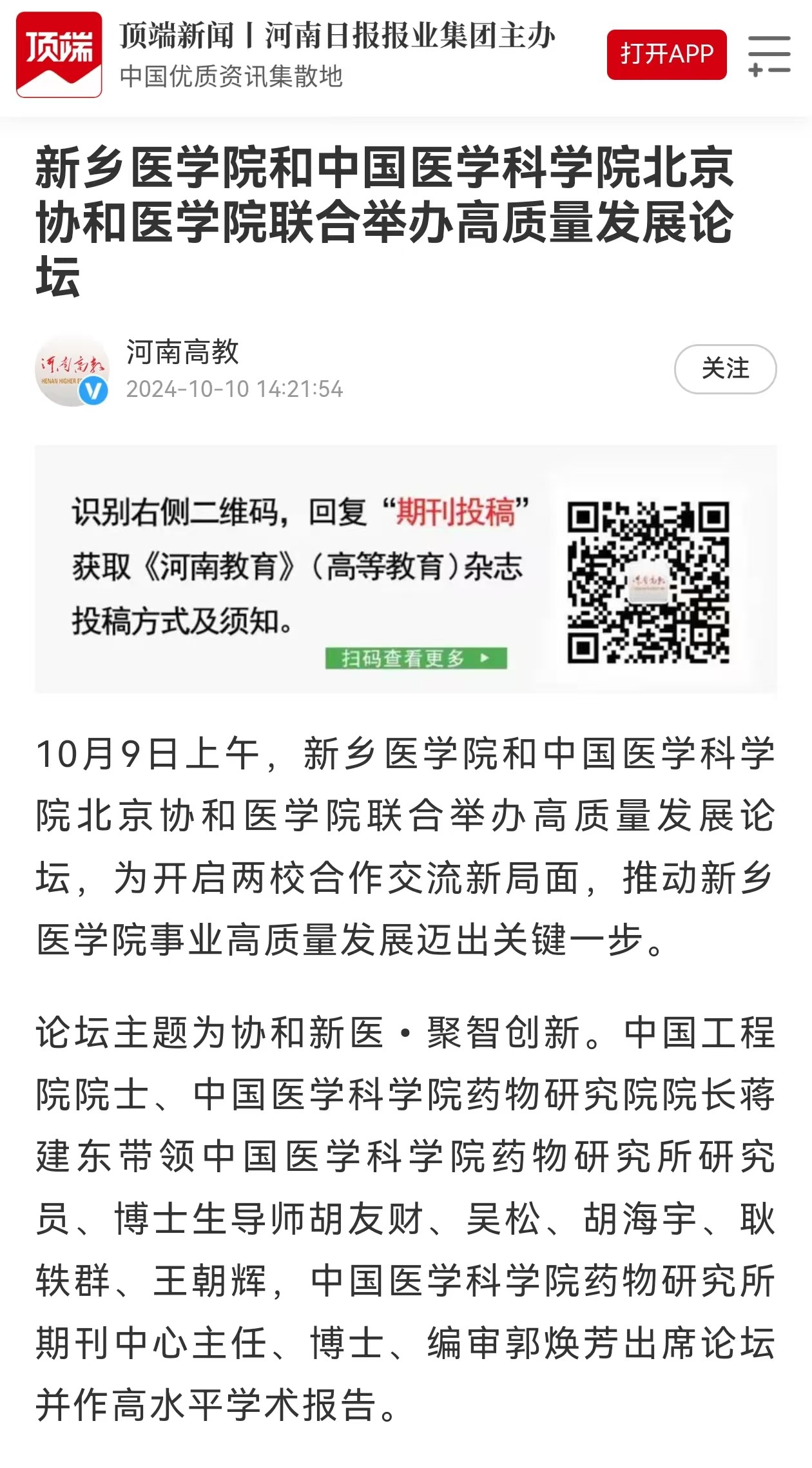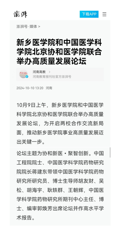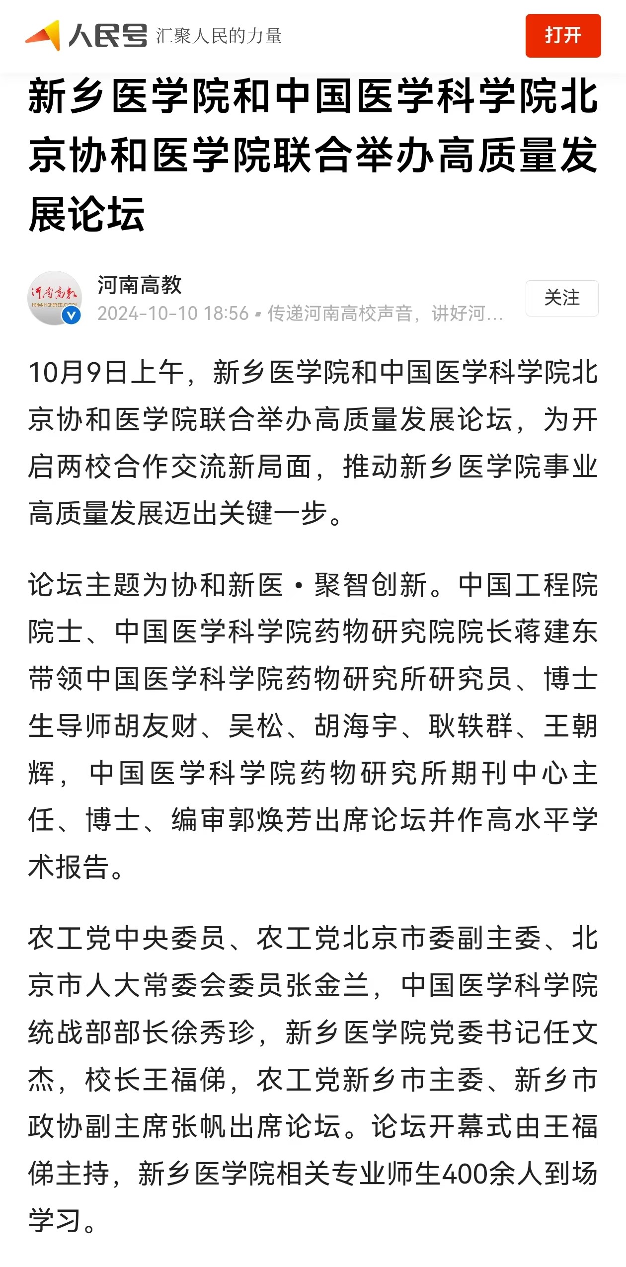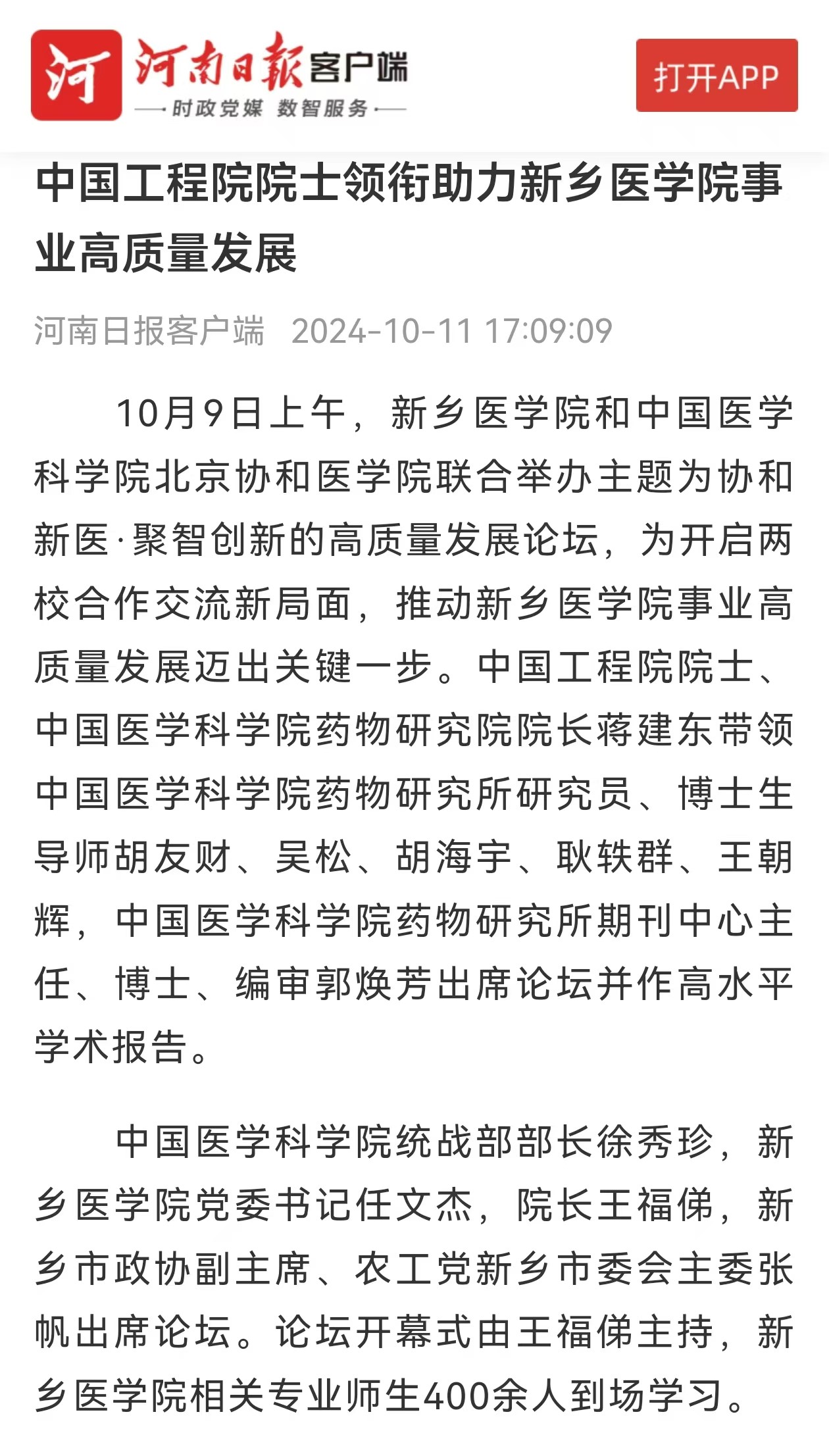 中国工程院院士、中国医学科学院药物研究院院长蒋建东带领中国医学科学院药物研究所研究员、博士生导师胡友财、吴松、胡海宇、耿轶群、王朝辉,中国医学科学院药物研究所期刊中心主任、博士、编审郭焕芳出席论坛并作高水平学术报告。农工党中央委员、农工党北京市委副主委、北京市人大常委会委员张金兰,中国医学科学院统战部部长徐秀珍,我校党委书记任文杰,校长王福俤,农工党新乡市主委、新乡市政协副主席张帆出席论坛,相关专业师生400余人到场学习。人民日报客户端、河南日报客户端、顶端新闻、大河报·豫视频、今日头条、澎湃号、河南高教等多家媒体报道。