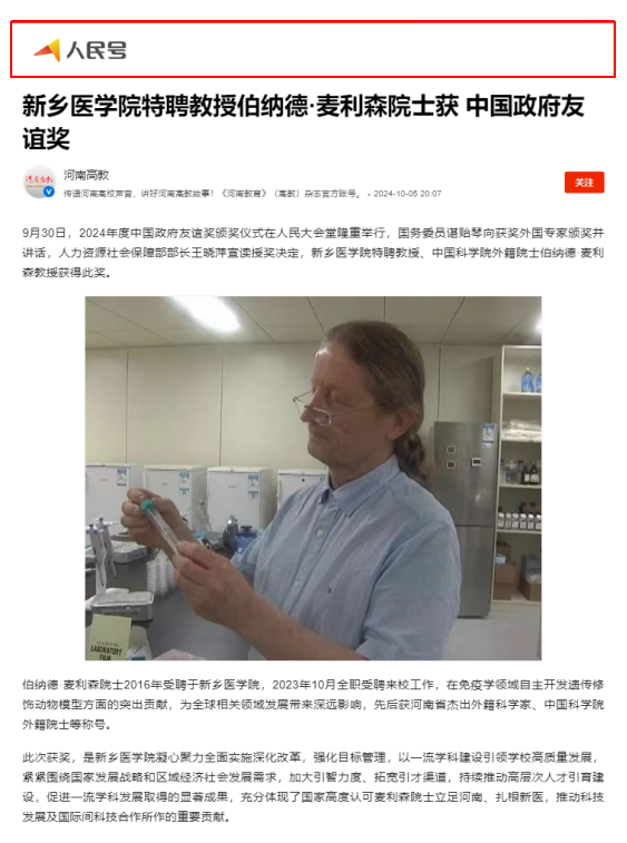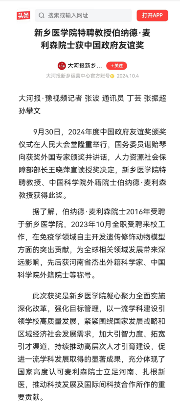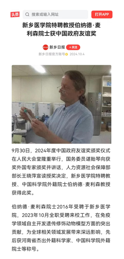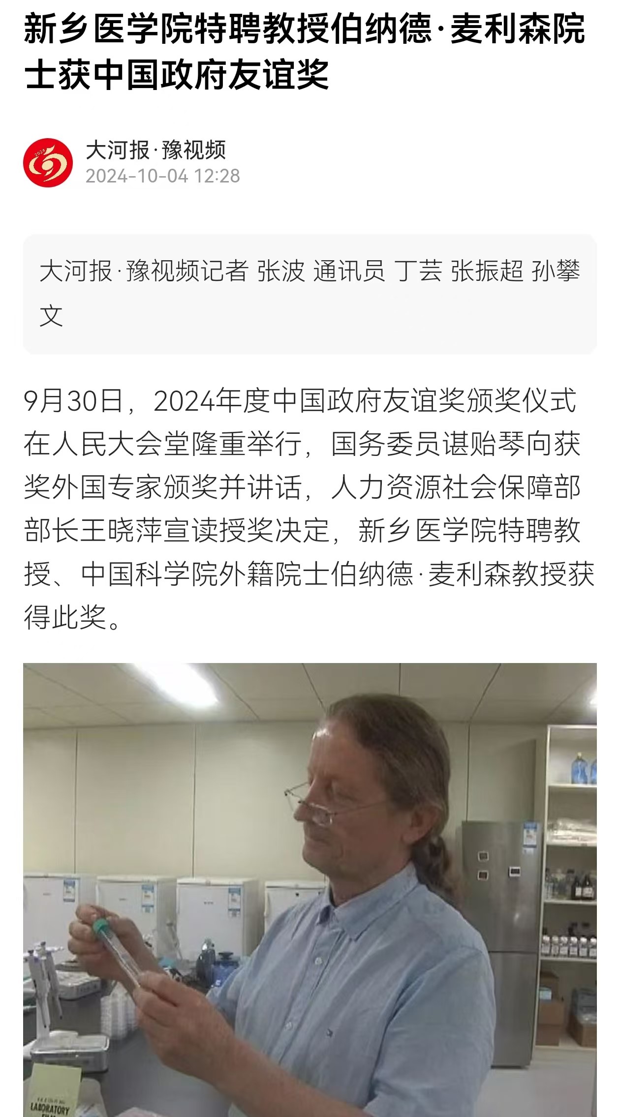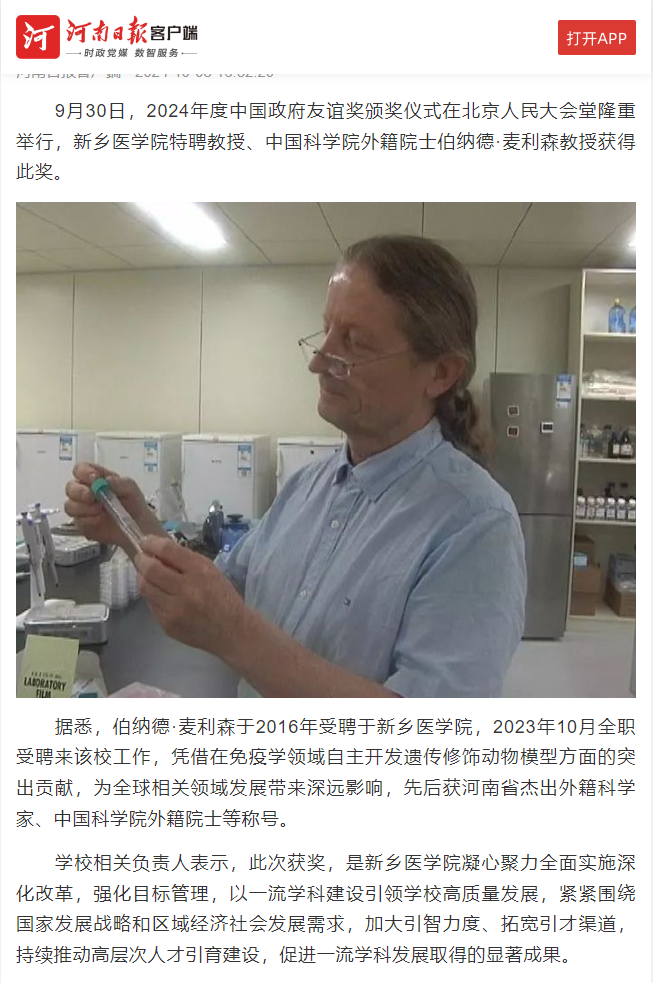9月30日,我校特聘教授、中国科学院外籍院士伯纳德·麦利森教授获得2024年度中国政府友谊奖。伯纳德·麦利森于2016年受聘于我校,2023年10月全职受聘来校工作,凭借在免疫学领域自主开发遗传修饰动物模型方面的突出贡献,为全球相关领域发展带来深远影响,先后获河南省杰出外籍科学家、中国科学院外籍院士等称号。此次获奖是学校凝心聚力全面实施深化改革,强化目标管理,以一流学科建设引领学校高质量发展,紧紧围绕国家发展战略和区域经济社会发展需求,加大引智力度、拓宽引才渠道,持续推动高层次人才引育建设,促进一流学科发展取得的显著成果。人民日报客户端、河南日报客户端、顶端新闻、大河报·豫视频、今日头条、河南教育宣传网等多家媒体报道。