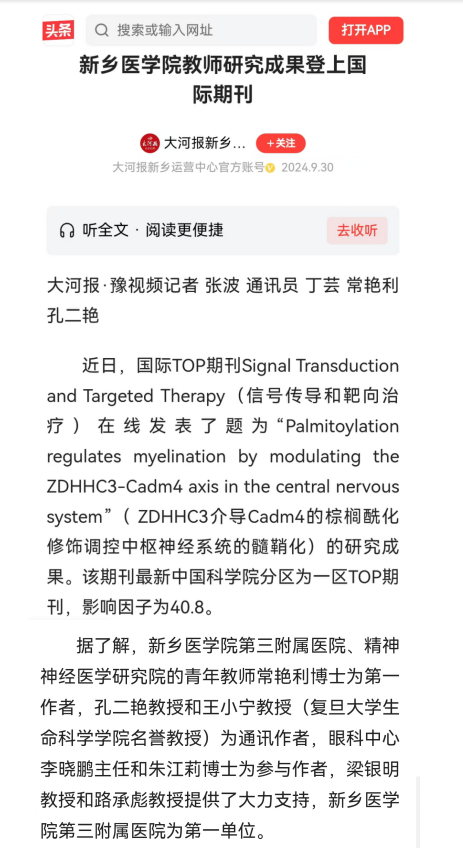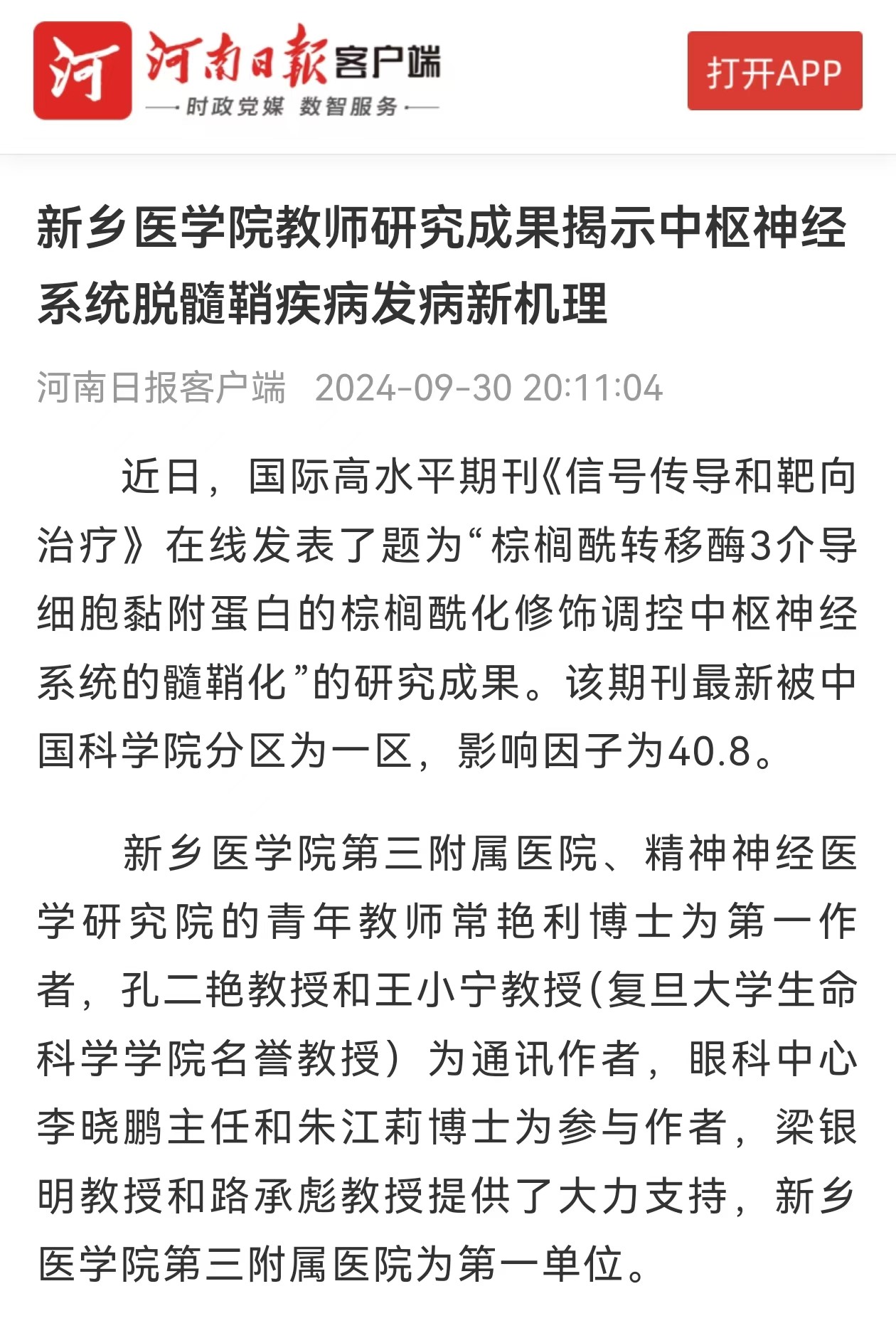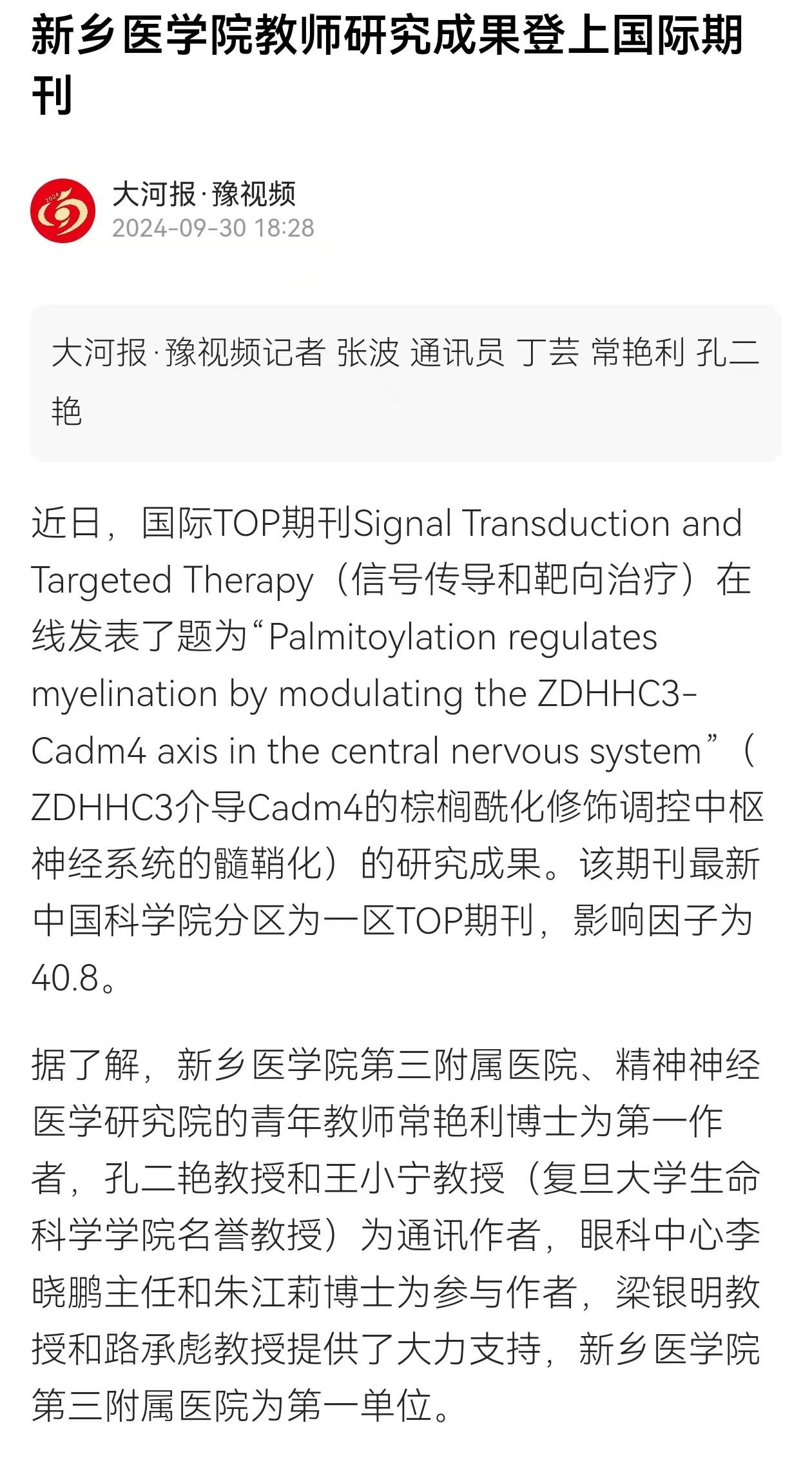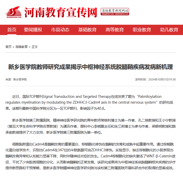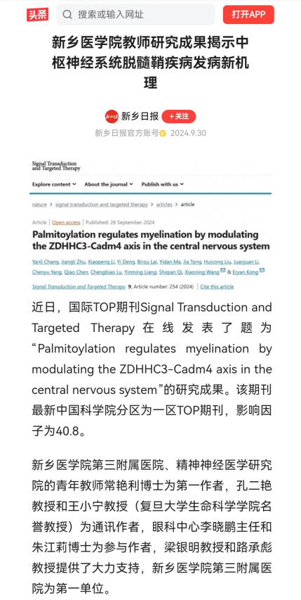 近日,国际TOP期刊Signal Transduction and Targeted Therapy(信号传导和靶向治疗)在线发表题为“Palmitoylation regulates myelination by modulating the ZDHHC3-Cadm4 axis in the central nervous system”(ZDHHC3介导Cadm4的棕榈酰化修饰调控中枢神经系统的髓鞘化)的研究成果。该期刊最新中国科学院分区为一区TOP期刊,影响因子为40.8。华亿在线手机版(大中国区)青年教师常艳利博士为第一作者,孔二艳教授和王小宁教授(复旦大学生命科学学院名誉教授)为通讯作者。河南日报客户端、大河报·豫视频、今日头条、河南教育宣传网等多家媒体报道。