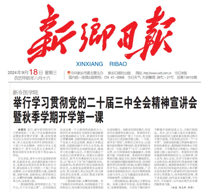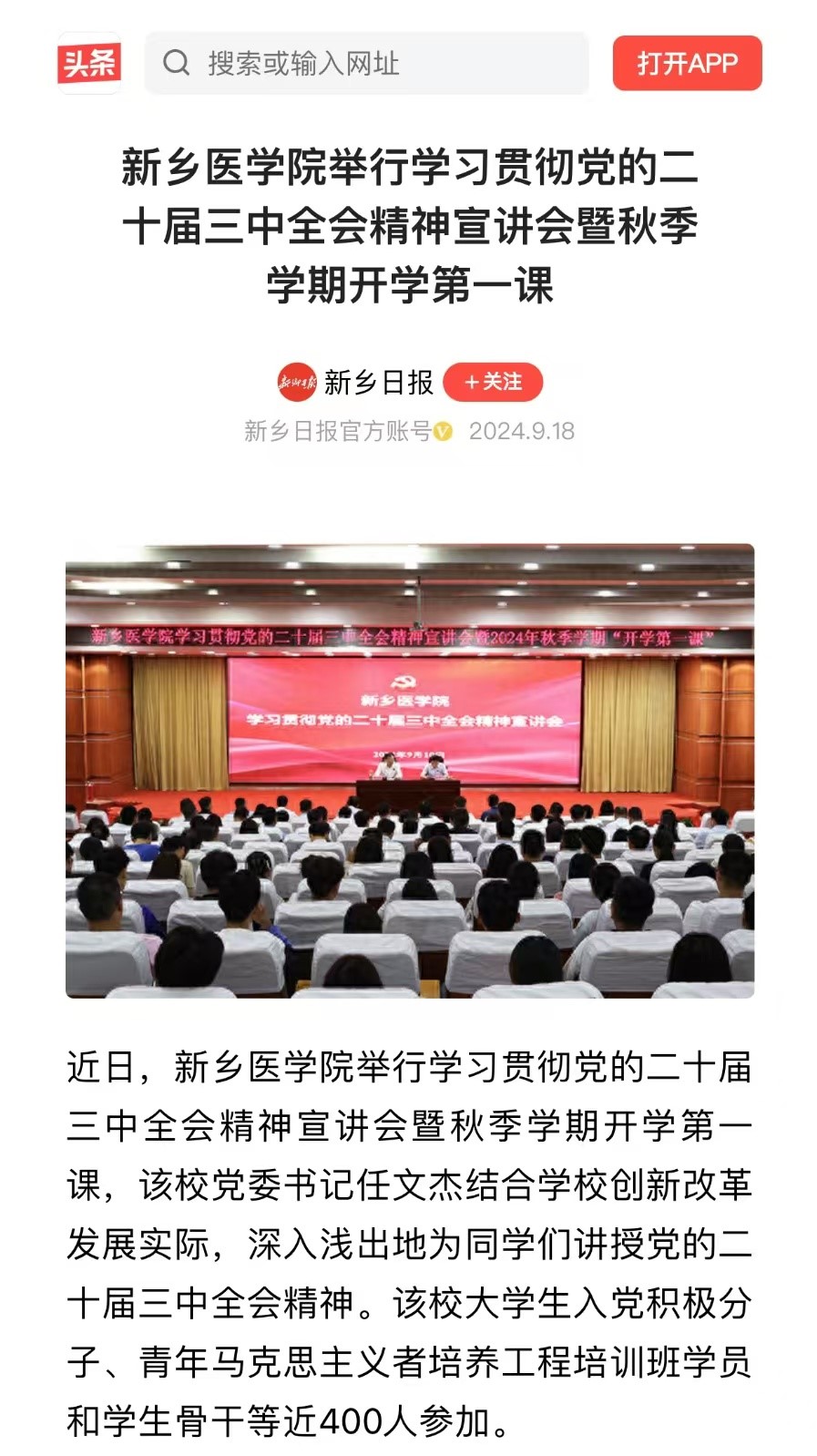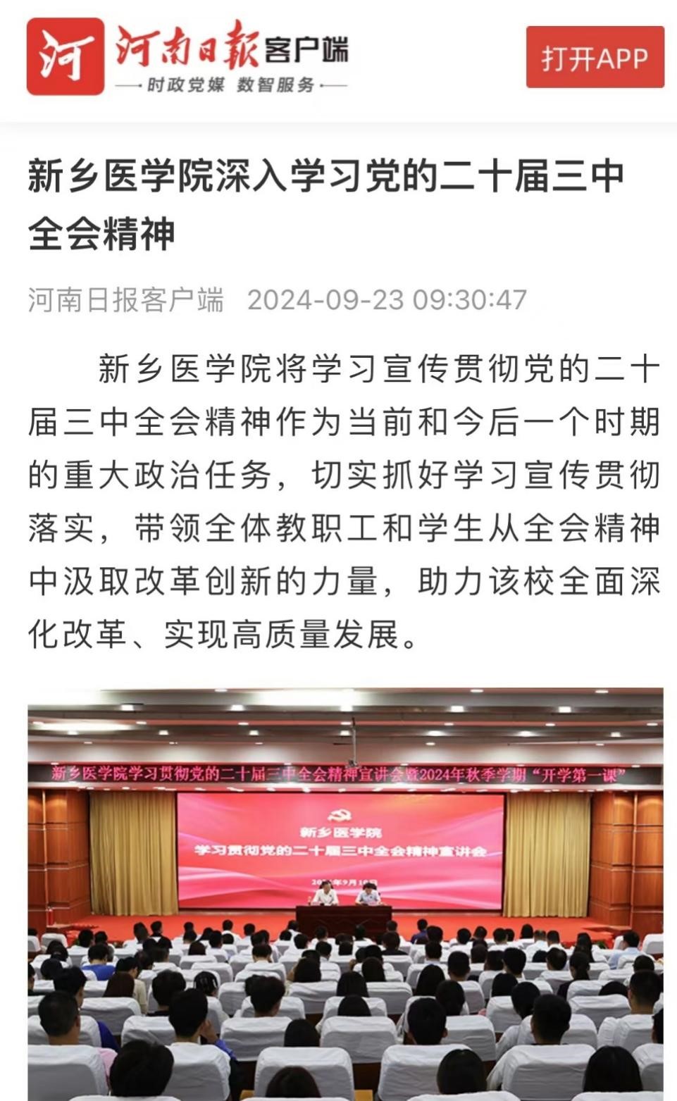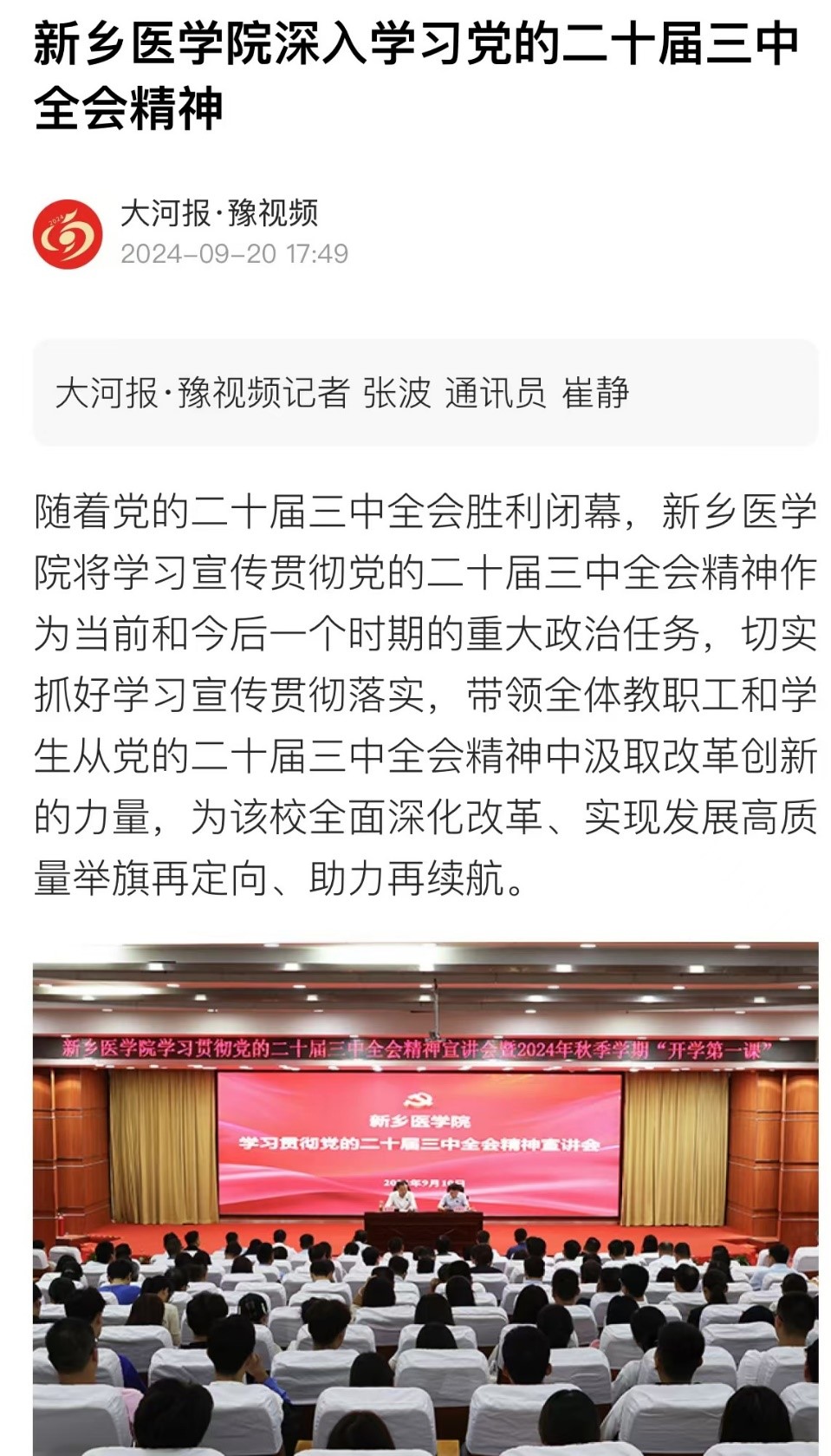 近日,我校举行学习贯彻党的二十届三中全会精神宣讲会暨秋季学期开学第一课,党委书记任文杰结合学校创新改革发展实际,深入浅出地为同学们讲授党的二十届三中全会精神。我校大学生入党积极分子、青年马克思主义者培养工程培训班学员和学生骨干等近400人参加。此次会议旨在鼓舞青年学子全面深入学习党的二十届三中全会精神,从中汲取智慧和力量,肩负起民族复兴的大业。河南日报客户端、河南高教、大河报·豫视频、今日头条客户端、澎湃新闻客户端、新乡日报等多家媒体报道。
