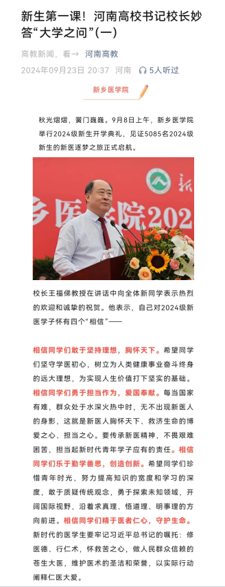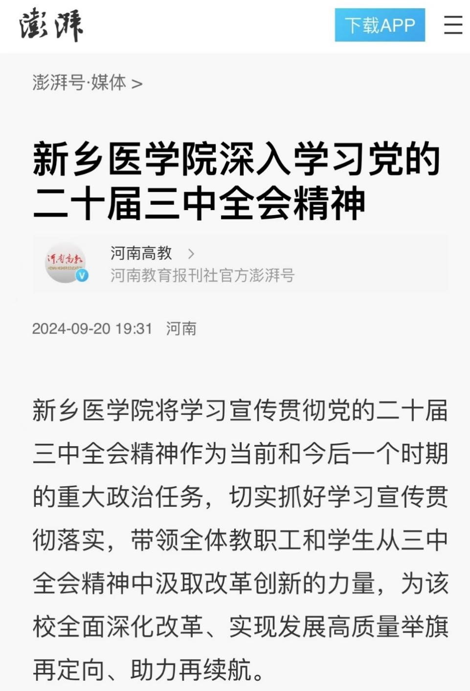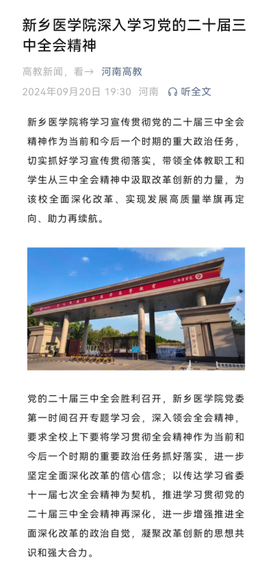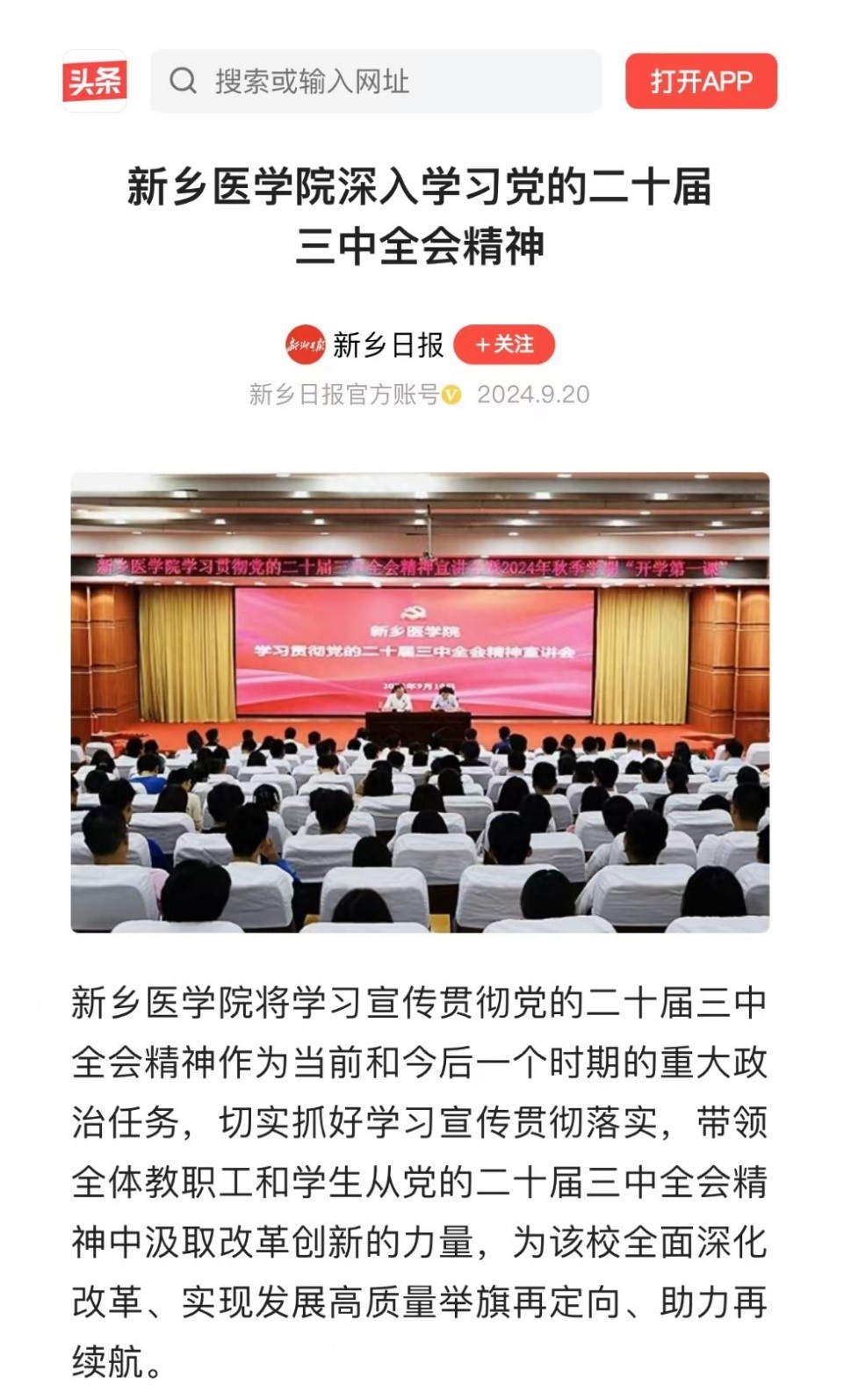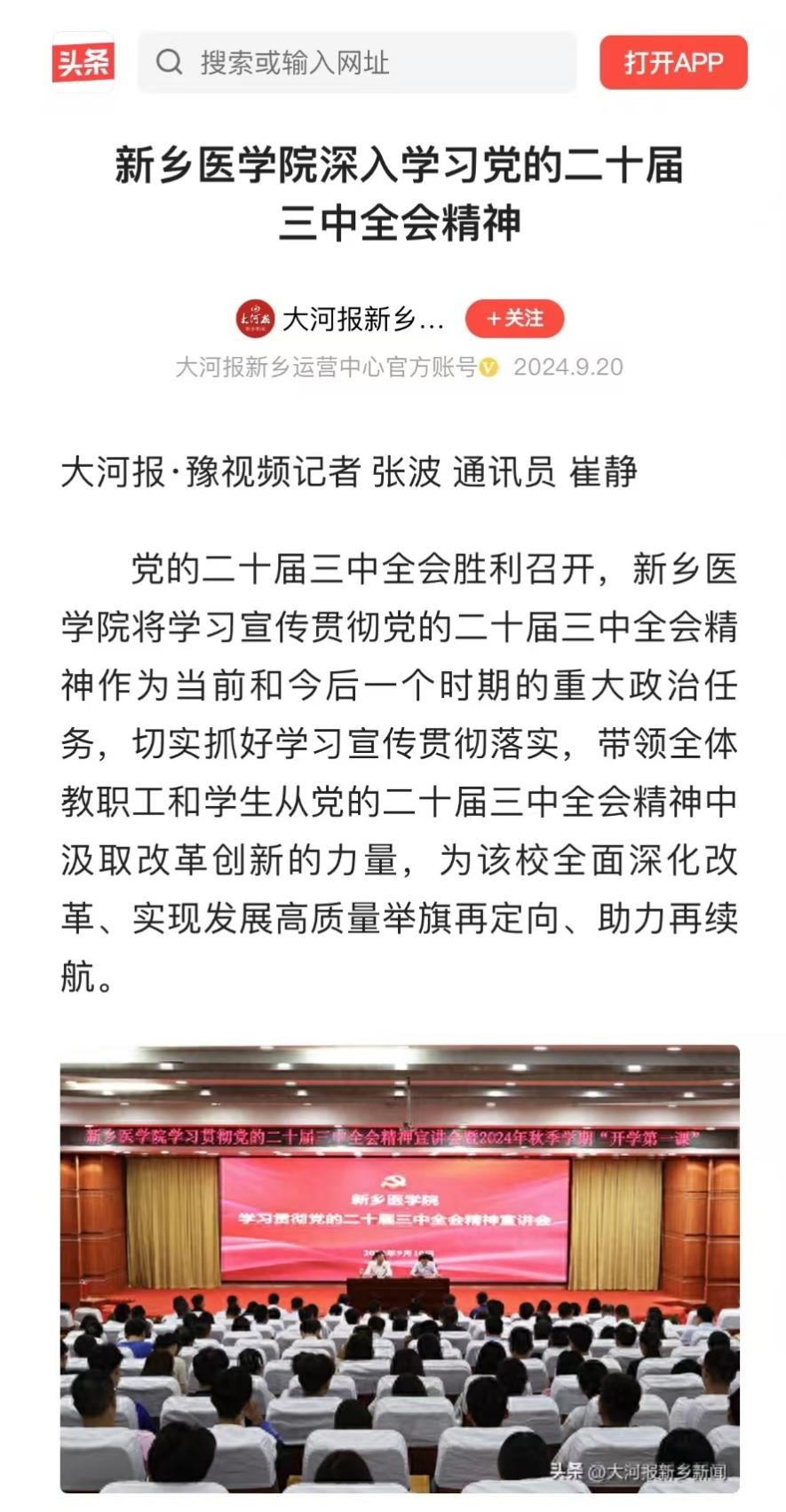 近日,我校举行学习贯彻党的二十届三中全会精神宣讲会暨秋季学期开学第一课,党委书记任文杰结合学校创新改革发展实际,深入浅出地为同学们讲授党的二十届三中全会精神。我校大学生入党积极分子、青年马克思主义者培养工程培训班学员和学生骨干等近400人参加。此次会议旨在鼓舞青年学子全面深入学习党的二十届三中全会精神,从中汲取智慧和力量,肩负起民族复兴的大业。河南日报客户端、河南高教、大河报·豫视频、今日头条客户端、澎湃新闻客户端、新乡日报等多家媒体报道。