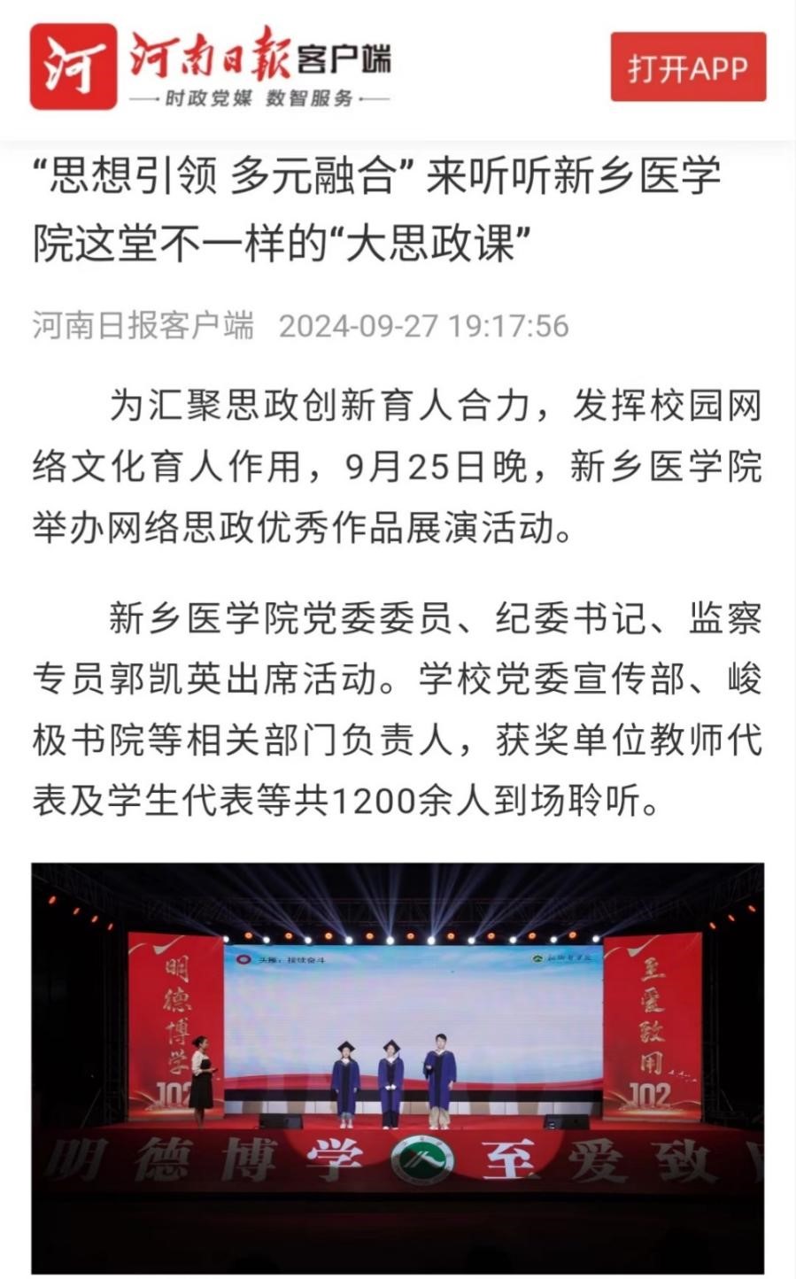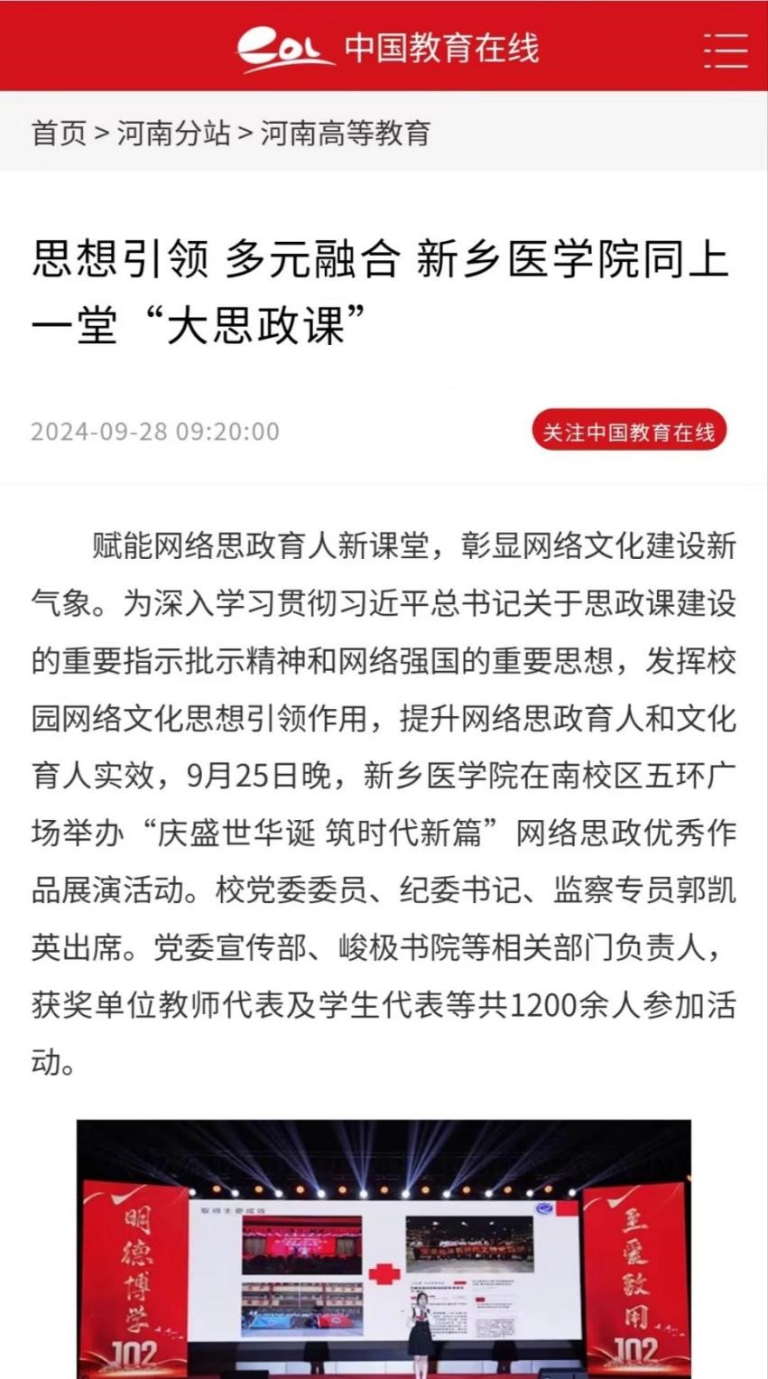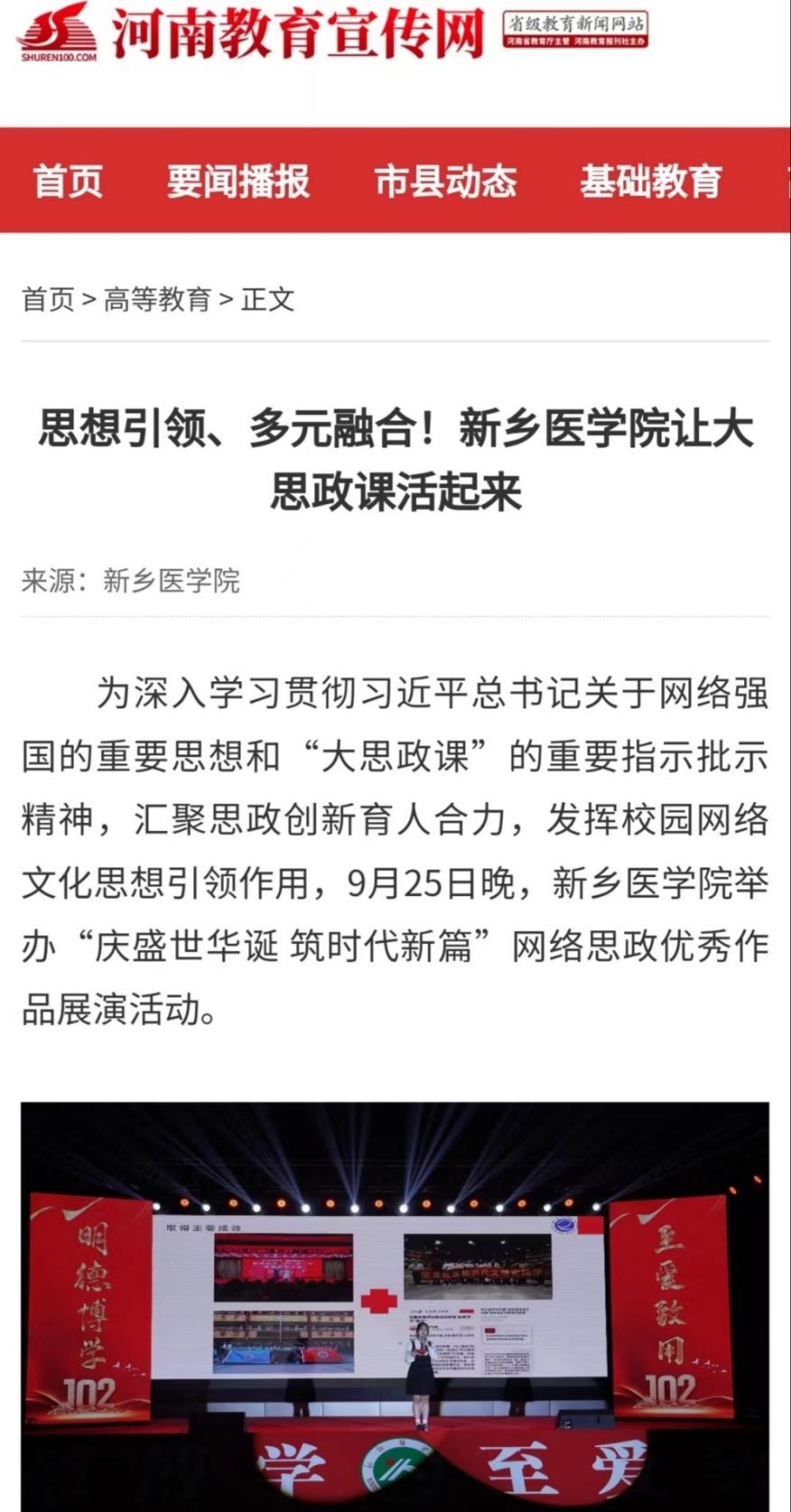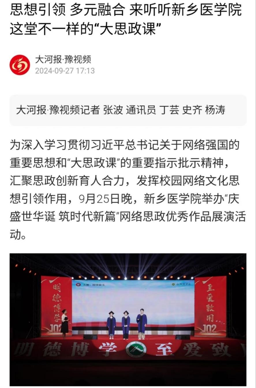 为深入学习贯彻习近平总书记关于网络强国的重要思想和“大思政课”的重要指示批示精神,汇聚思政创新育人合力,发挥校园网络文化思想引领作用,9月25日晚,我校举办“庆盛世华诞 筑时代新篇”网络思政优秀作品展演活动。校党委委员、纪委书记、监察专员郭凯英出席活动,党委宣传部、峻极书院等相关部门负责人,获奖单位教师代表及学生代表等1200余人到场聆听。活动充分赋能网络思政育人新课堂,彰显网络文化建设新气象。河南日报客户端、大河报·豫视频、顶端新闻客户端、今日头条客户端、新乡日报客户端、中国教育在线、河南教育宣传网等多家媒体报道。