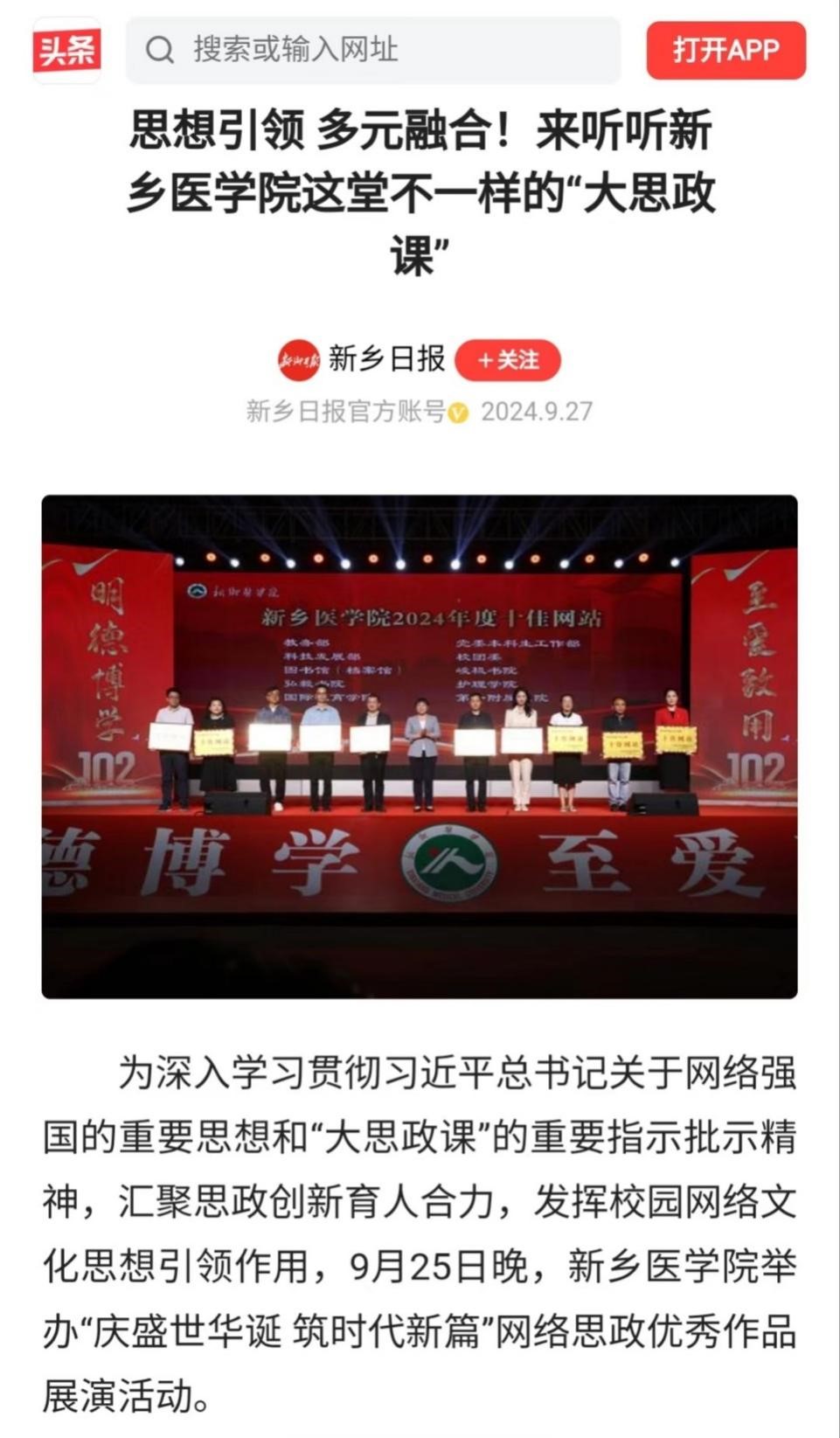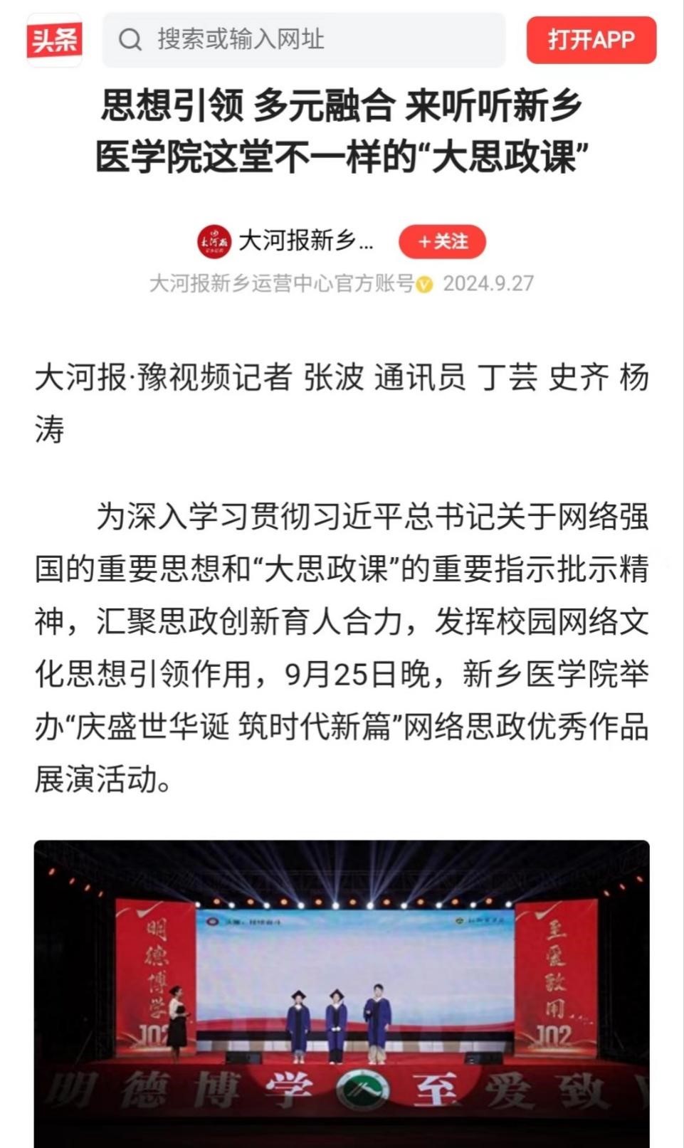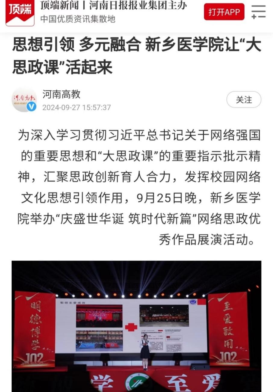 为深入学习贯彻习近平总书记关于网络强国的重要思想和“大思政课”的重要指示批示精神,汇聚思政创新育人合力,发挥校园网络文化思想引领作用,9月25日晚,我校举办“庆盛世华诞 筑时代新篇”网络思政优秀作品展演活动。校党委委员、纪委书记、监察专员郭凯英出席活动,党委宣传部、峻极书院等相关部门负责人,获奖单位教师代表及学生代表等1200余人到场聆听。活动充分赋能网络思政育人新课堂,彰显网络文化建设新气象。河南日报客户端、大河报·豫视频、顶端新闻客户端、今日头条客户端、新乡日报客户端、中国教育在线、河南教育宣传网等多家媒体报道。