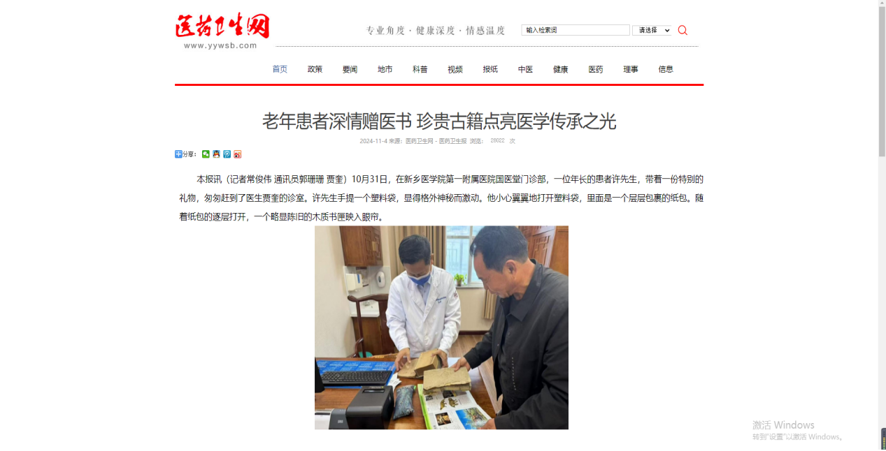 【学习强国、河南日报客户端、医药卫生报】等媒体报道我校第一附属医院患者赠医书暖闻