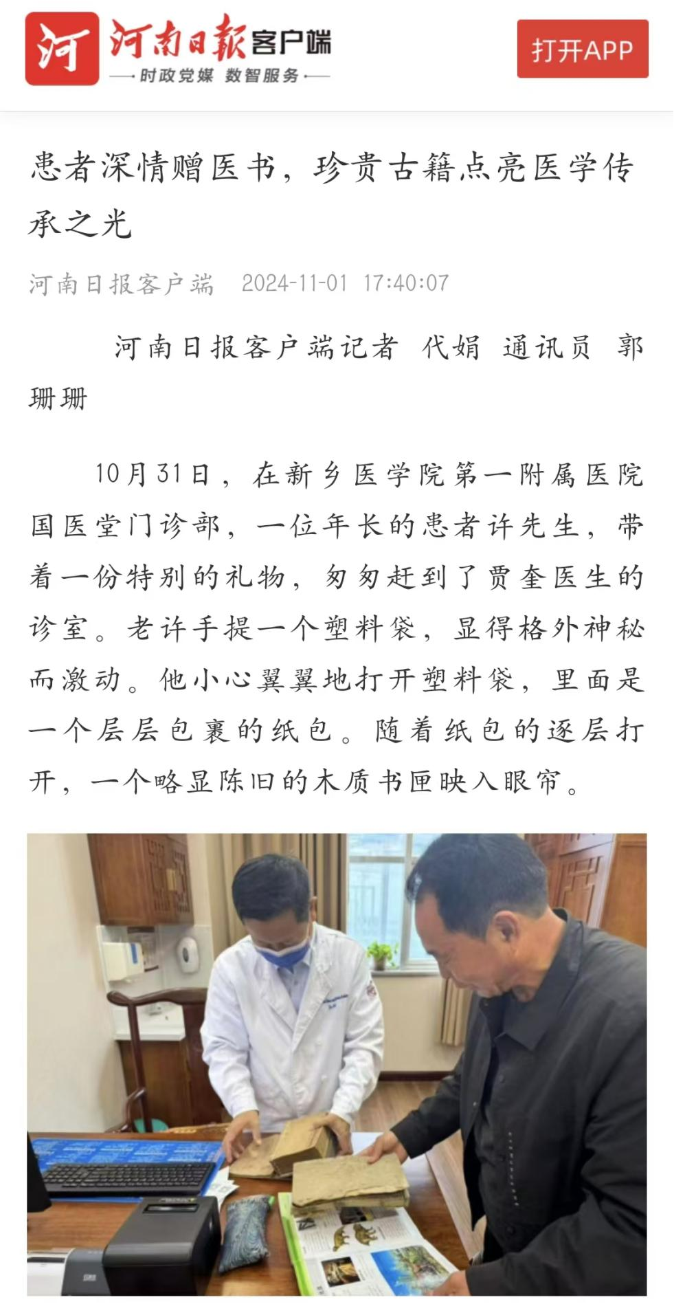 患者深情赠医古书,点亮医学传承之光。10月31日,在我校第一附属医院国医堂门诊部,一位年长的患者许先生,出于对贾奎医生的信任与钦佩,热心捐赠出几本泛黄的古医书,希望能够在增进百姓健康福祉中发挥更大的作用。多家媒体报道。