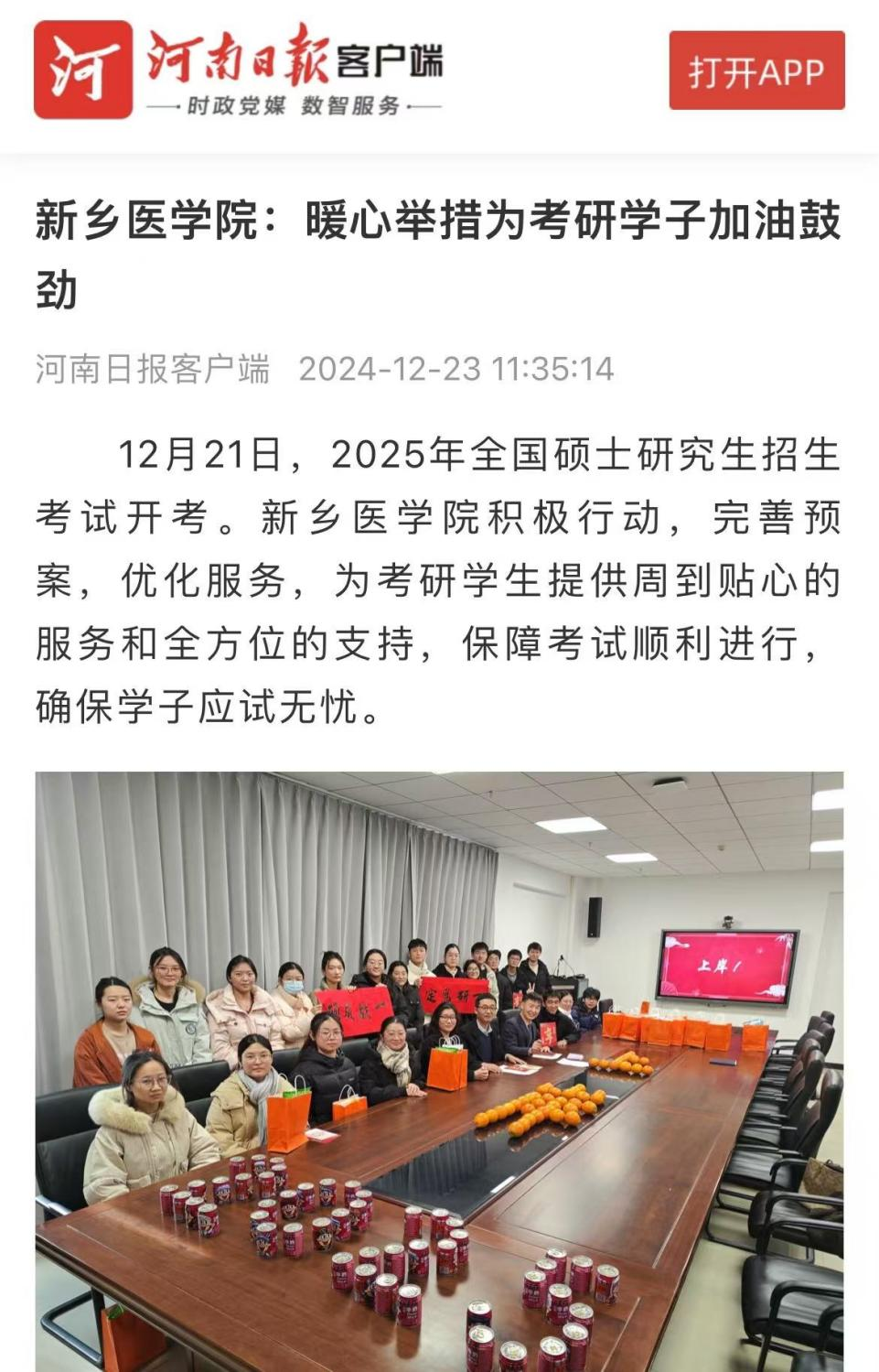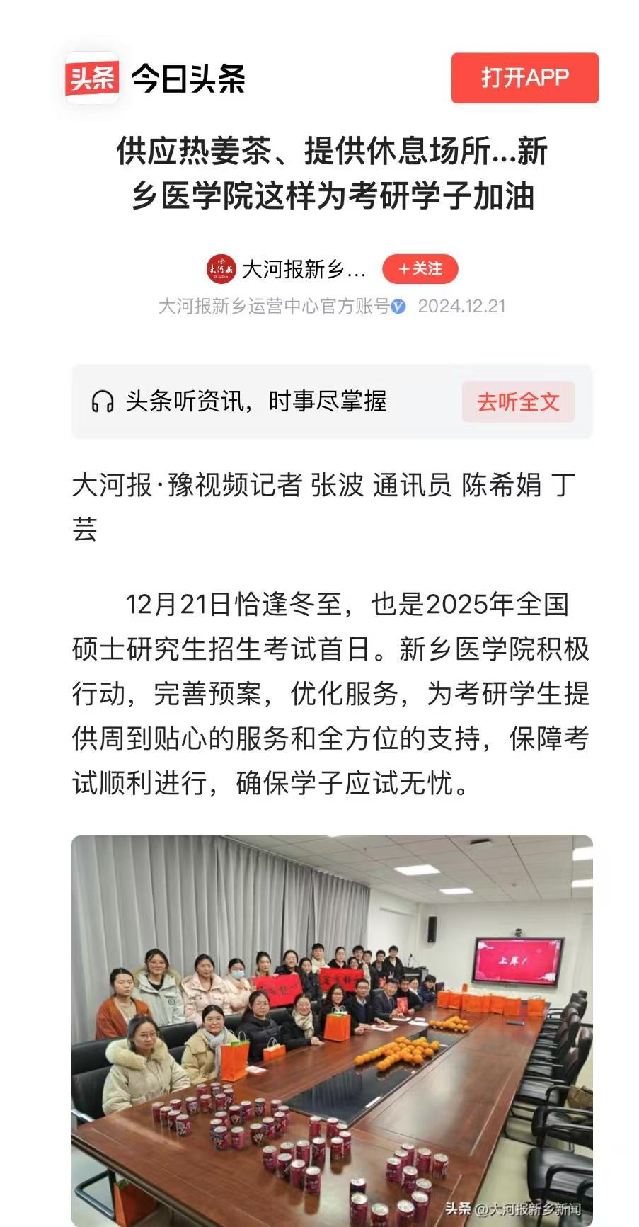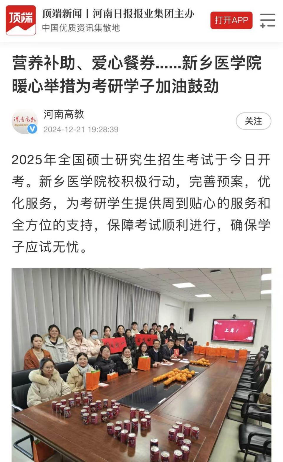 12月21日,2025年全国硕士研究生招生考试开考。我校积极行动,完善预案,优化服务,为考研学生提供周到贴心的服务和全方位的支持,保障考试顺利进行,确保学子应试无忧。发放免费餐券、提供心理疏导服务、定制“加油”卡和文具……各种暖心举措帮助考研学生减轻压力,让他们在追逐梦想的道路上更加坚定自信,安心备考,为实现自己的人生目标奋勇前行。河南日报客户端、顶端新闻、大象新闻、今日头条、河南教育宣传网等多家媒体报道。