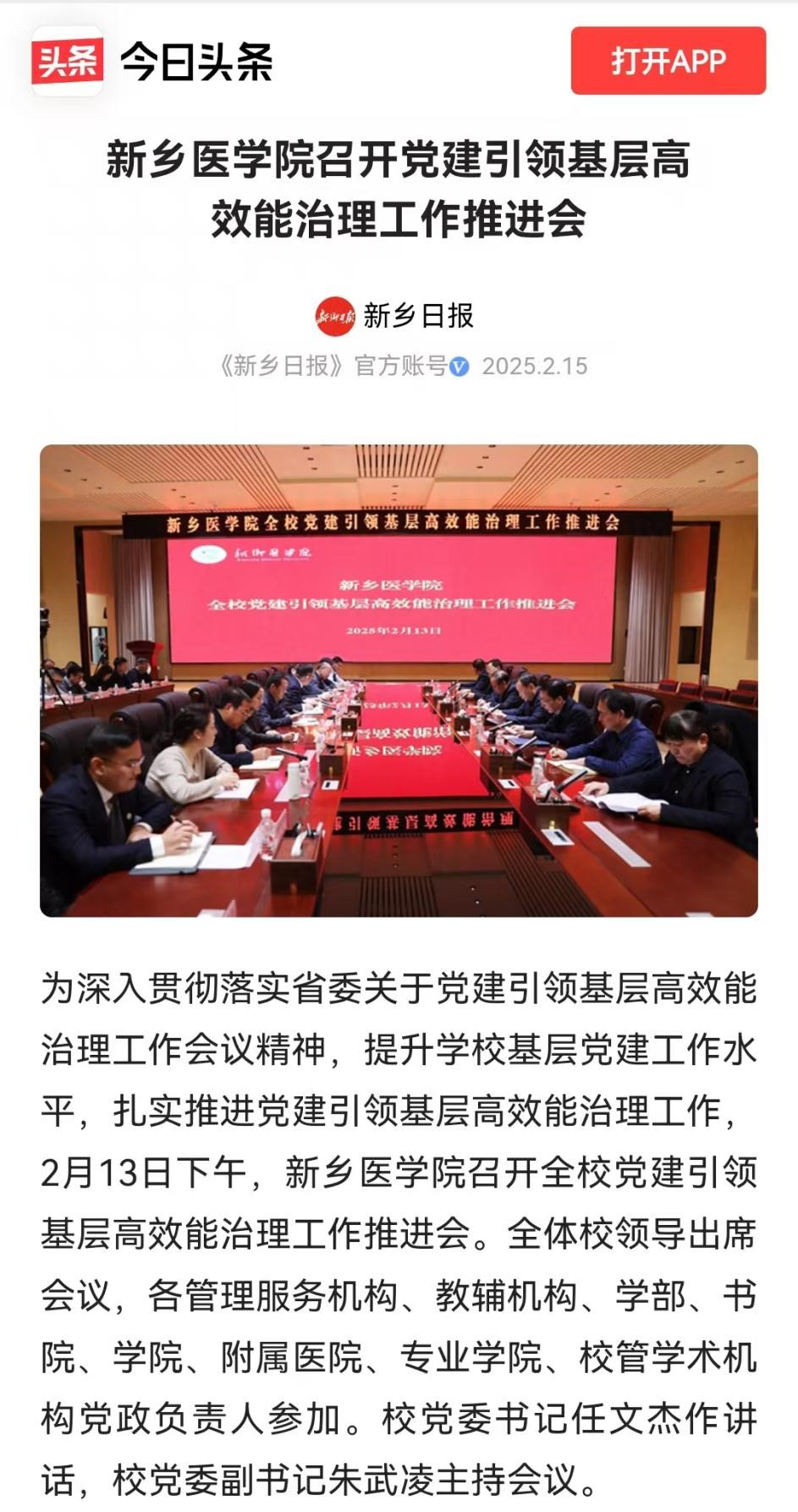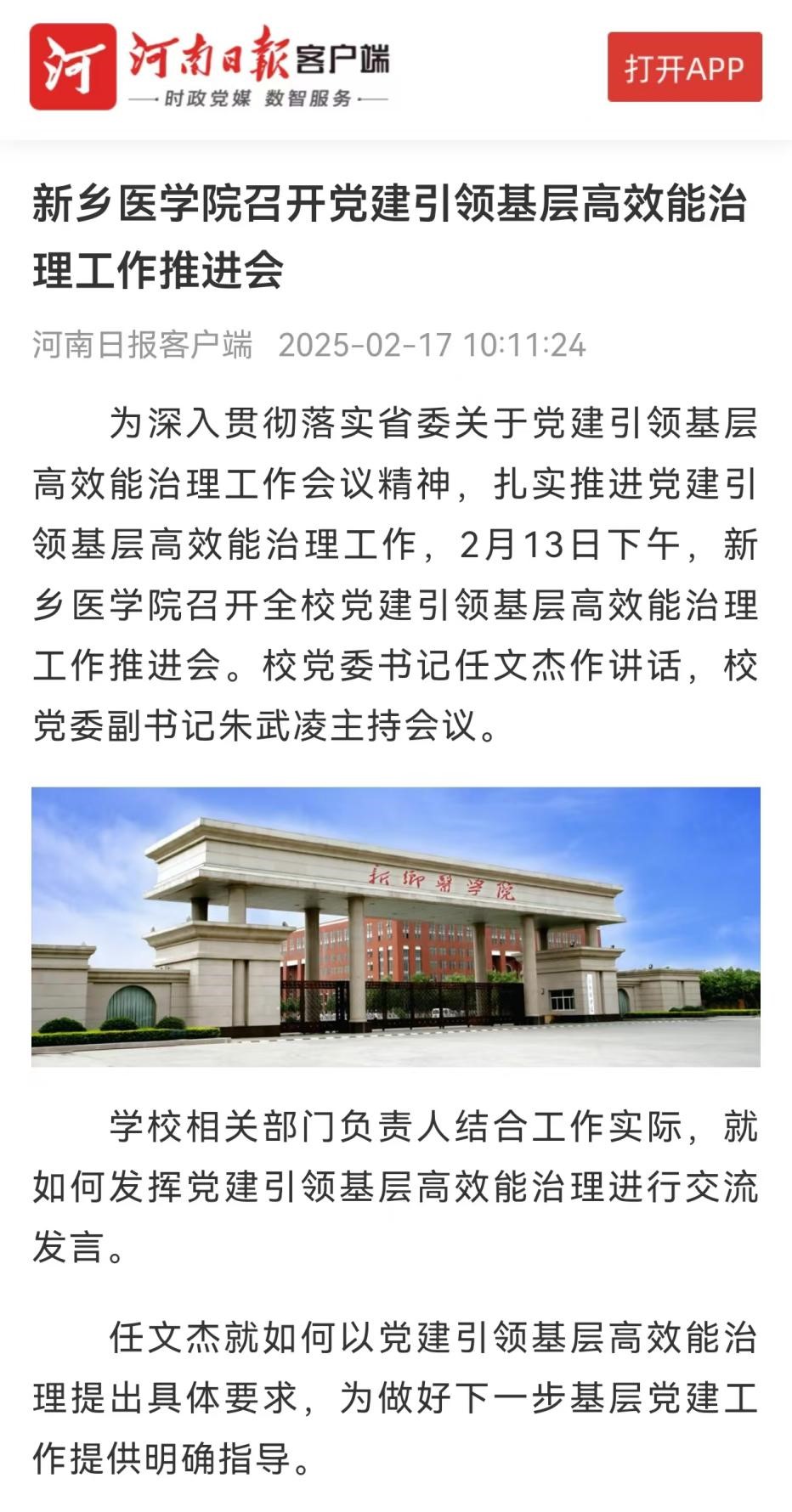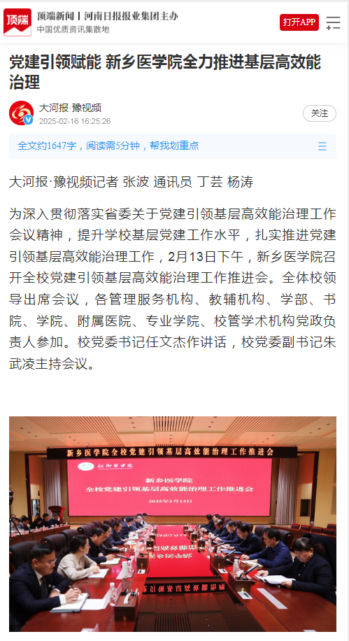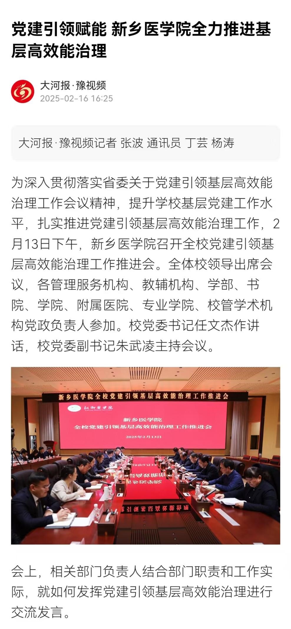 2月13日下午,我校召开全校党建引领基层高效能治理工作推进会。全体校领导出席,各管理服务机构、教辅机构、学部、书院、学院、附属医院等党政负责人参会。校党委书记任文杰就党建引领基层高效能治理提出具体要求,为基层党建工作指明方向。校党委副书记朱武凌主持总结并对落实会议精神提要求。相关部门负责人结合工作实际交流发言。河南日报客户端、顶端新闻、大河报•豫视频等多家媒体报道。