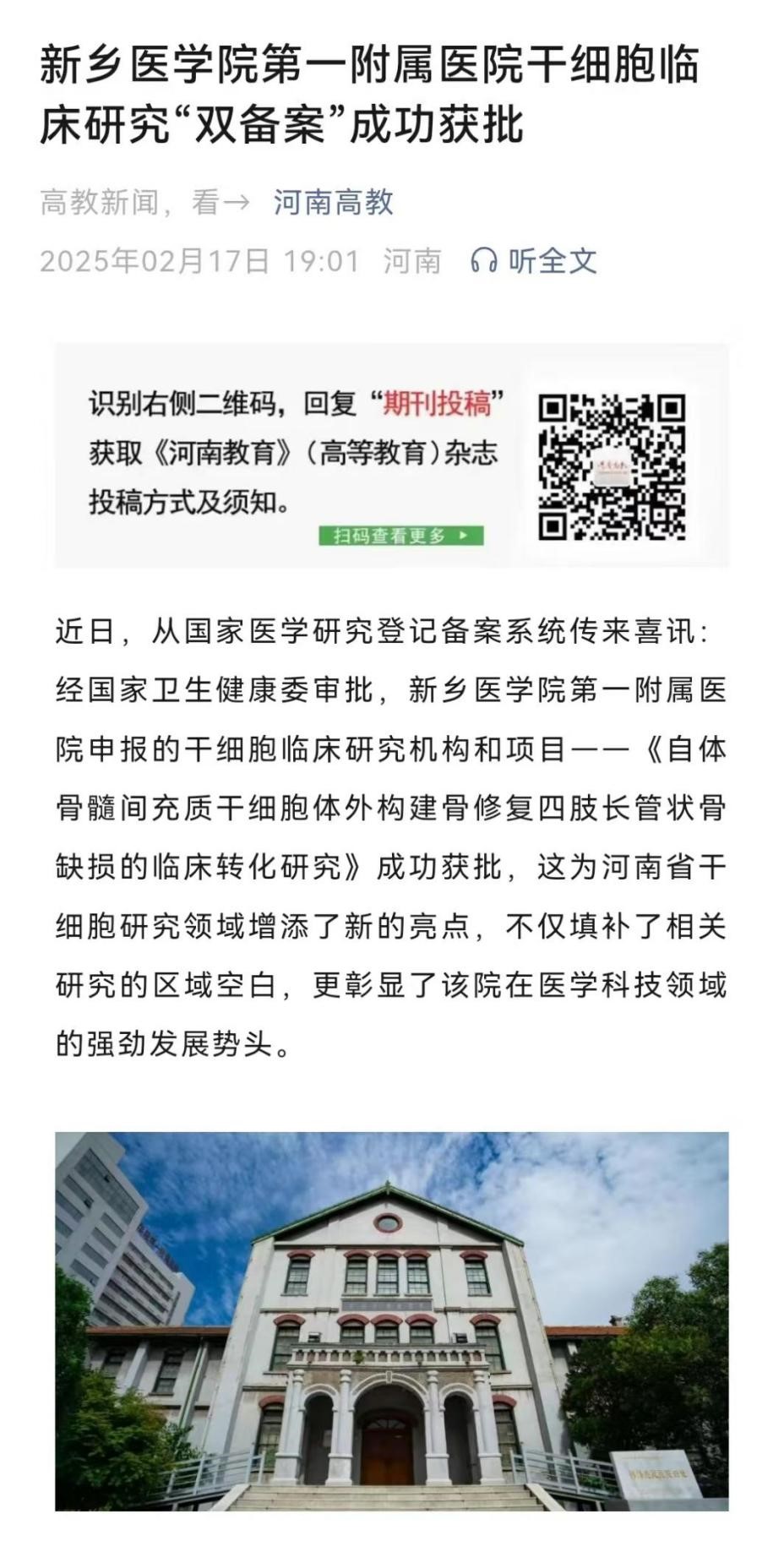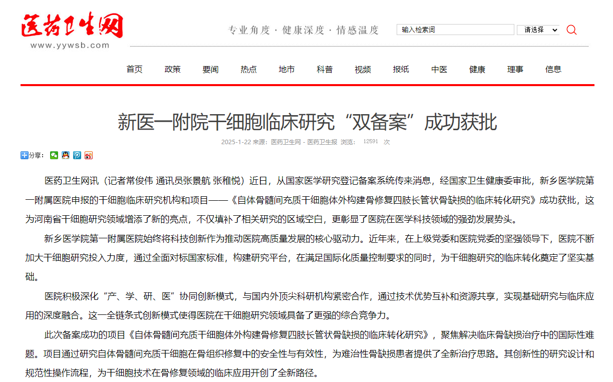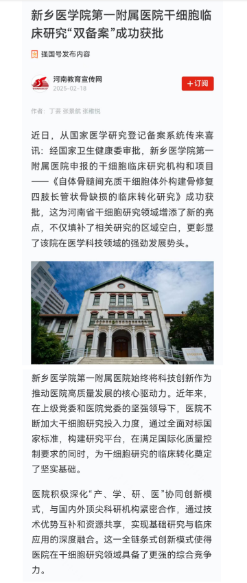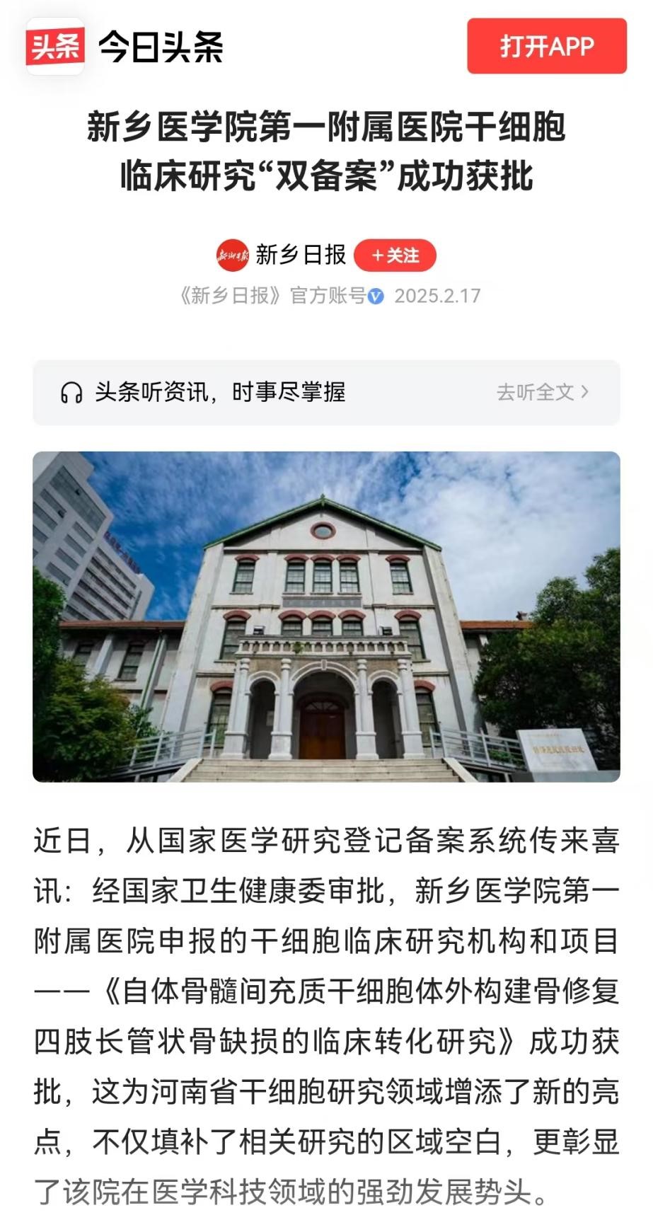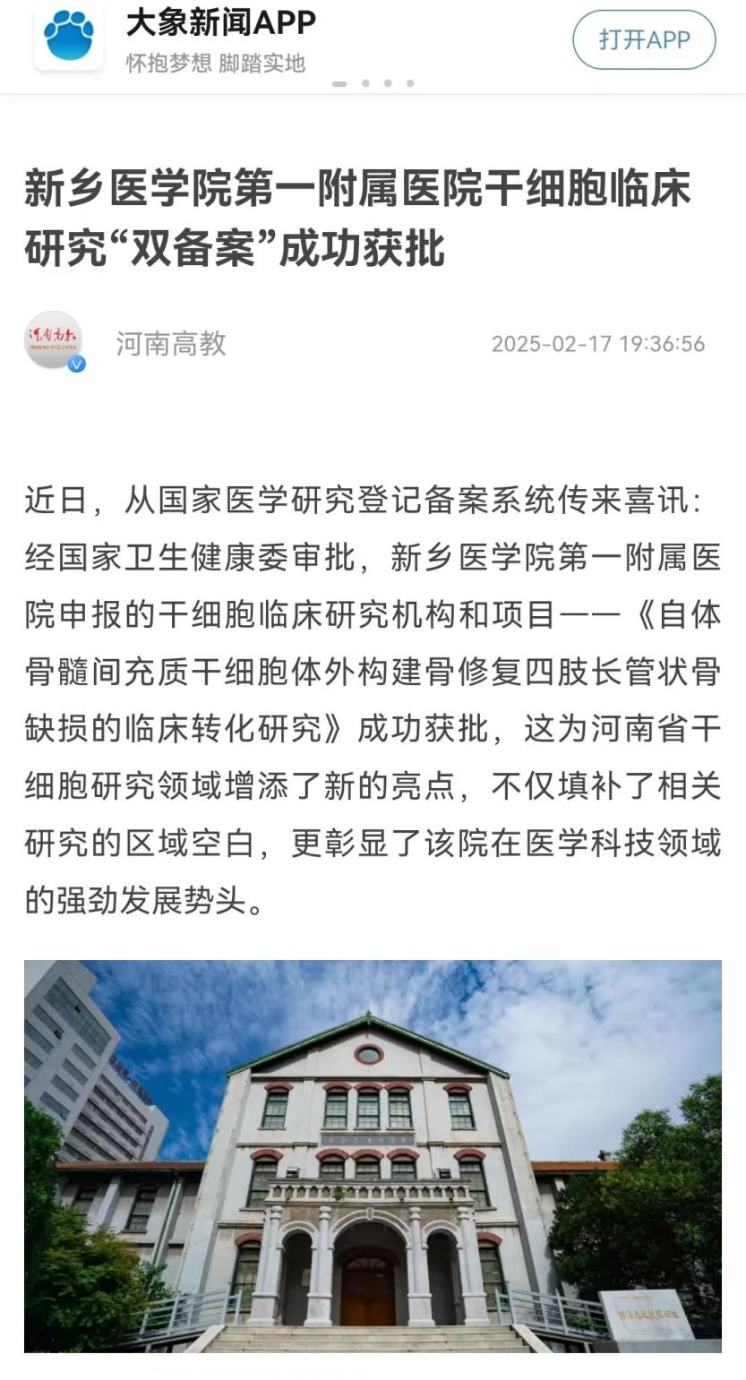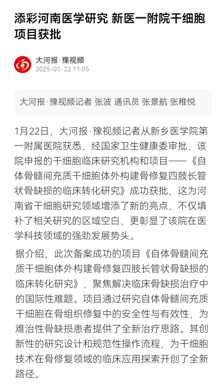 近日,国家医学研究登记备案系统传来喜讯:经国家卫生健康委审批,我校第一附属医院申报的干细胞临床研究机构及《自体骨髓间充质干细胞体外构建骨修复四肢长管状骨缺损的临床转化研究》项目成功获批。该成果填补了河南省干细胞研究区域空白,彰显了医院医学科技发展强劲势头,为河南省干细胞研究领域增添新亮点。学习强国、大河报•豫视频、大象新闻等多家媒体报道。